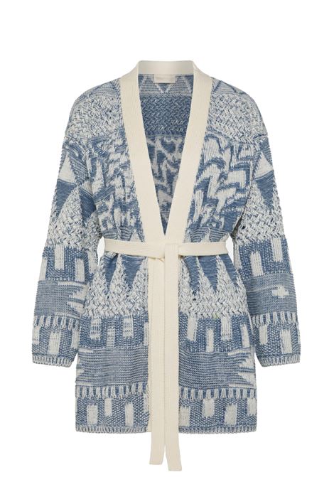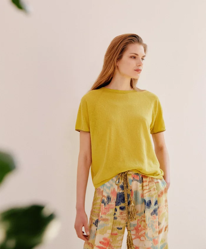 T-shirt boxy in filato leggero di lino e cotone. Delicate righe lurex sui bordi delle maniche riprendono il logo intarsiato. Made in Italy.