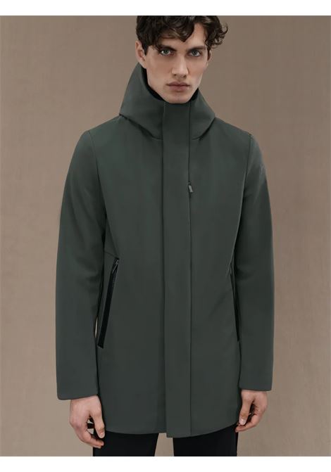 Questo soprabito smart e particolarmente stilizzato con lunghezza trequarti, dalla vestibilità dritta e al tempo stesso confortevole, si conferma uno dei capi continuativi di successo della collezione. Il design ultra nitido si esprime nella costruzione a nastrature selettive del tessuto a membrana Stratofabric#3, stretch e traspirante, con esterno nell'esclusivo SURFLEX® dal look super opaco. Gli elementi visuali sono ridotti all'essenziale: la patta chiusa da bottoni a pressione invisibili nasconde la chiusura a zip integrale a doppio cursore, che sale a chiudere il colletto e il cappuccio fisso avvolgente. Il taschino esterno sul petto presenta una zip invisibile, mentre le ampie tasche laterali contrappongono la termonastratura nera. L'interno con fodera in caldo ed elegante velluto è ravvivato dal taschino con doppio filetto arancione, l'esclusiva tag a cuore "made with love, designed in Tuscany". Il logo a microiniezione nero sulla manica sinistra firma un capo imprescindibile per la mezza stagione.
