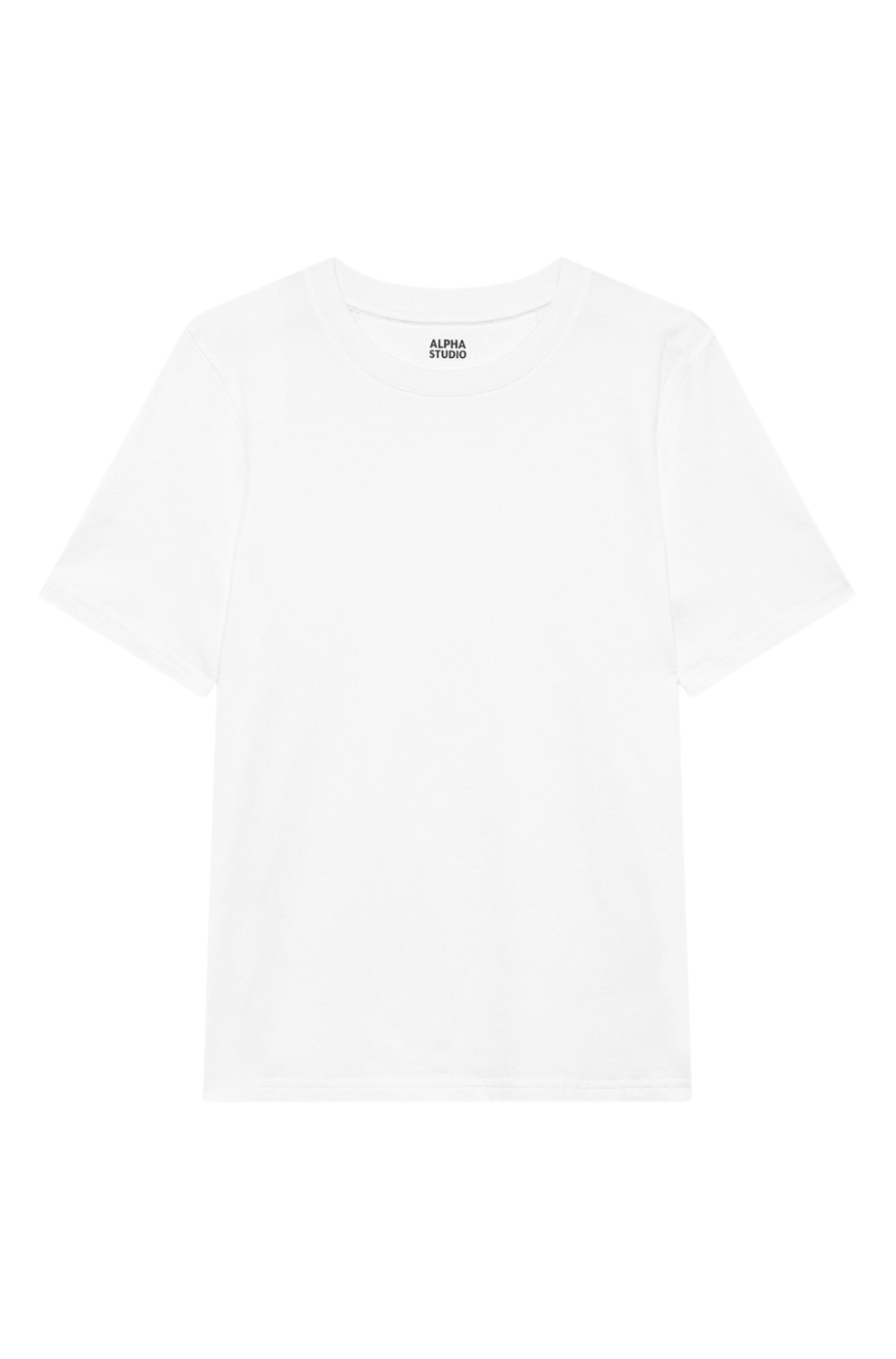 The classic crew neckline and short sleeves create a versatile silhouette that can be easily styled for both casual and more refined looks. The white color, bright and timeless, enhances the simplicity of the garment and increases its versatility.