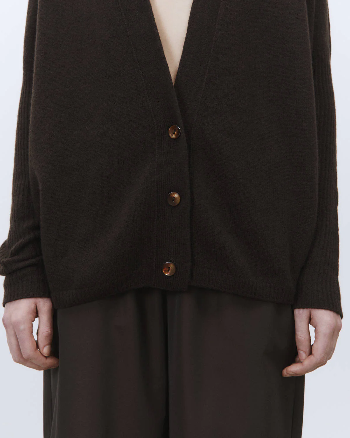 The V-neck design enhances the neckline, allowing for versatile layering, while the three tone-on-tone front buttons add a refined touch. Ribbed cuffs offer a balanced silhouette between structure and softness.