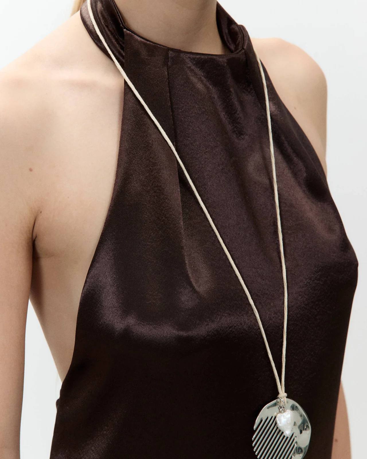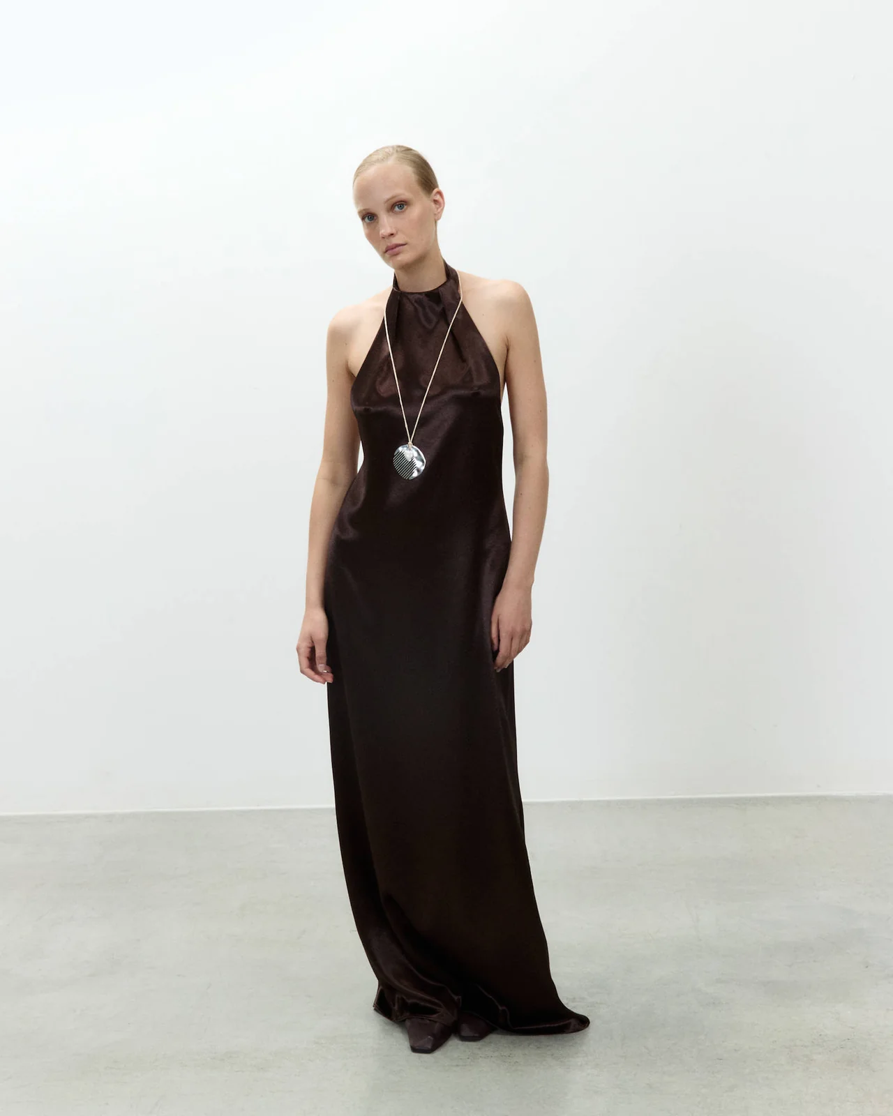 A high neckline at the front keeps the design minimal and clean, while the back neck fastening opens onto a striking open back, framed by an adjustable tie that allows you to customise the fit. An invisible zip at the back preserves the smooth line of the dress and makes it easy to put on.