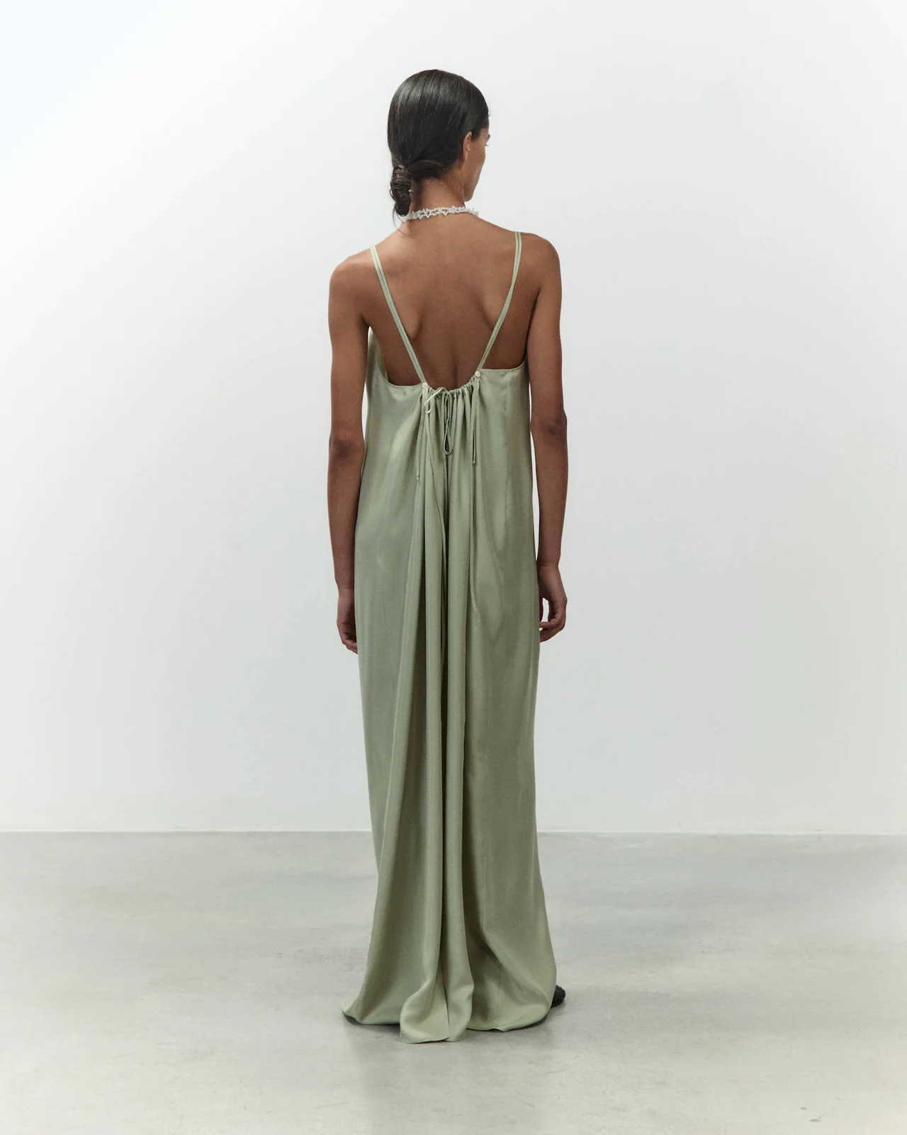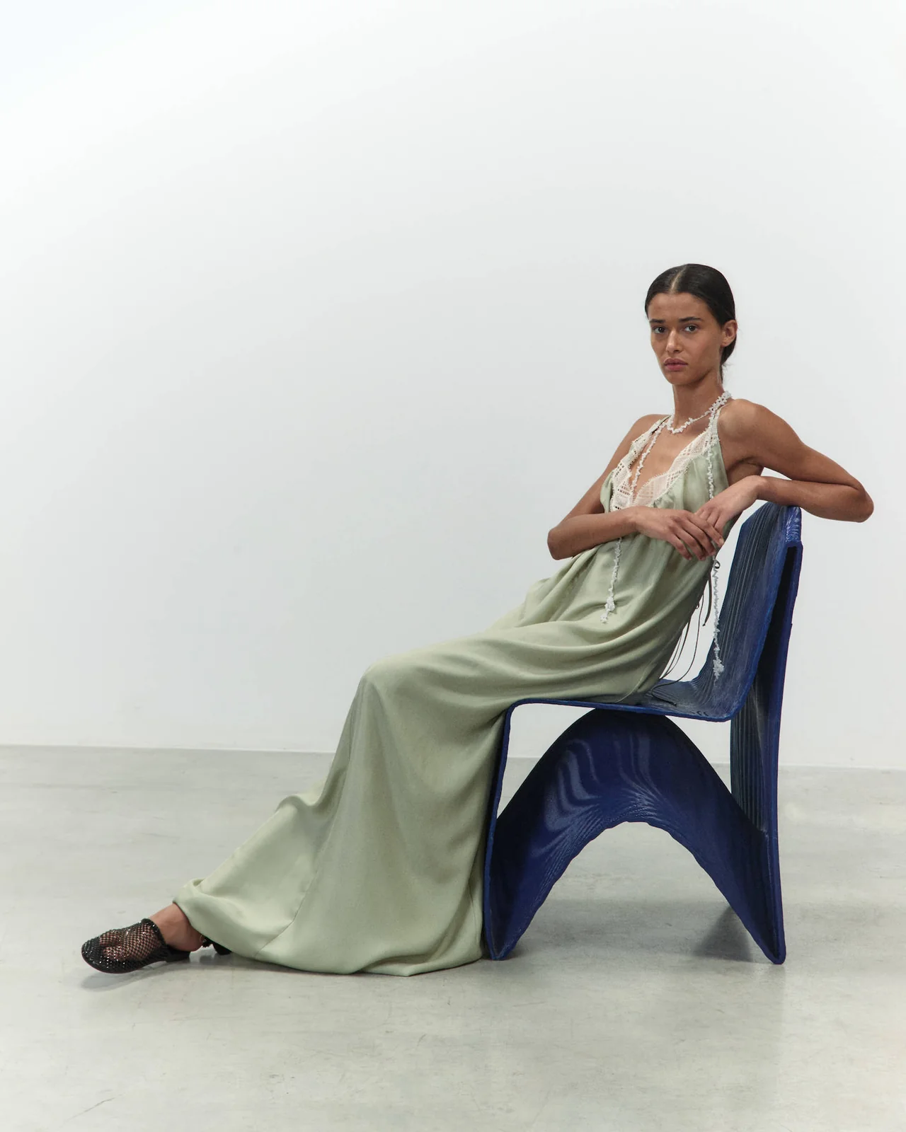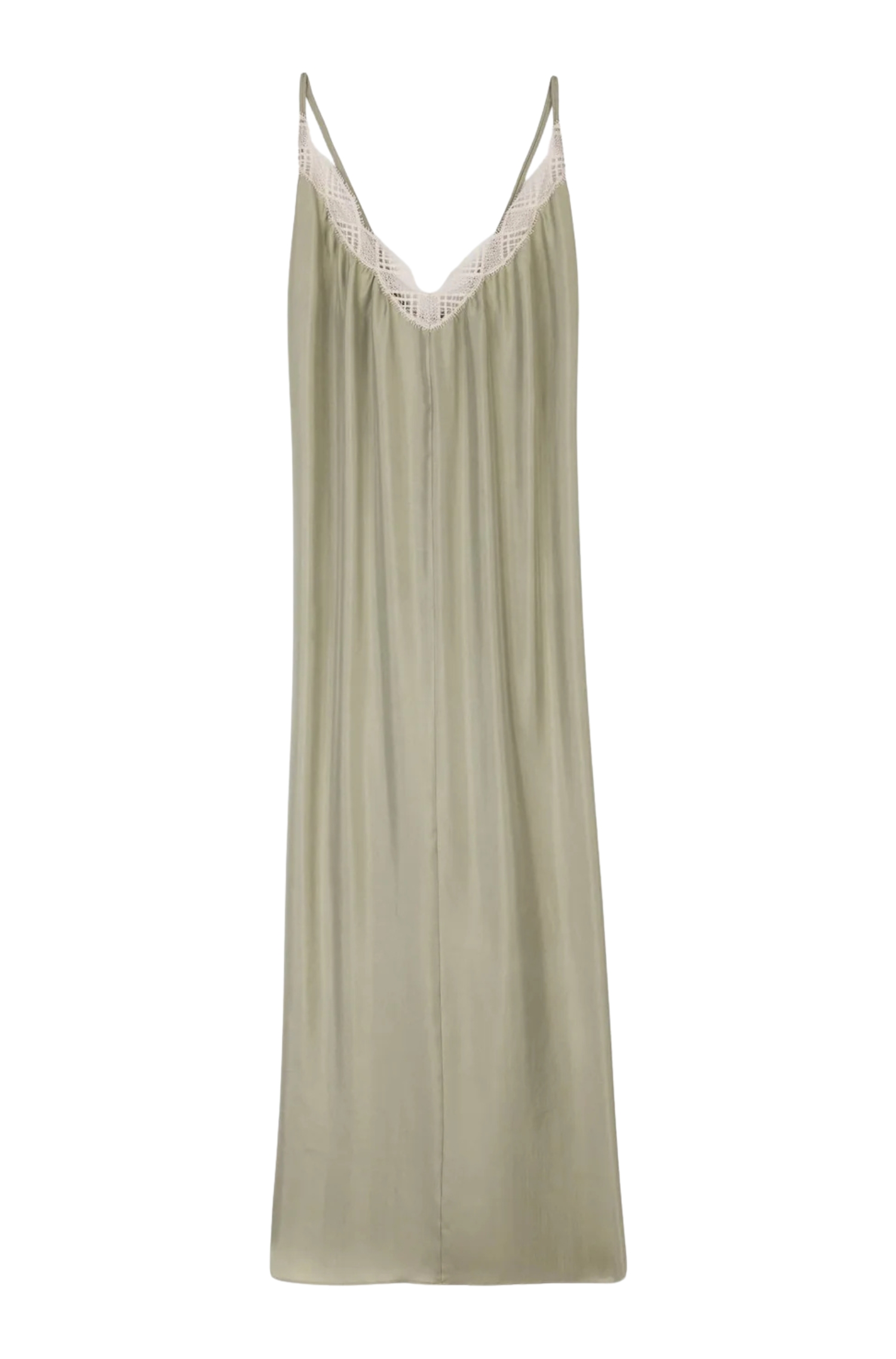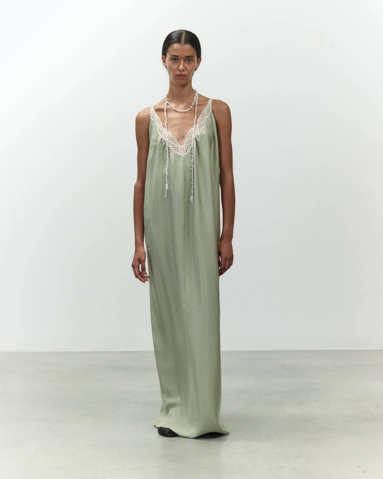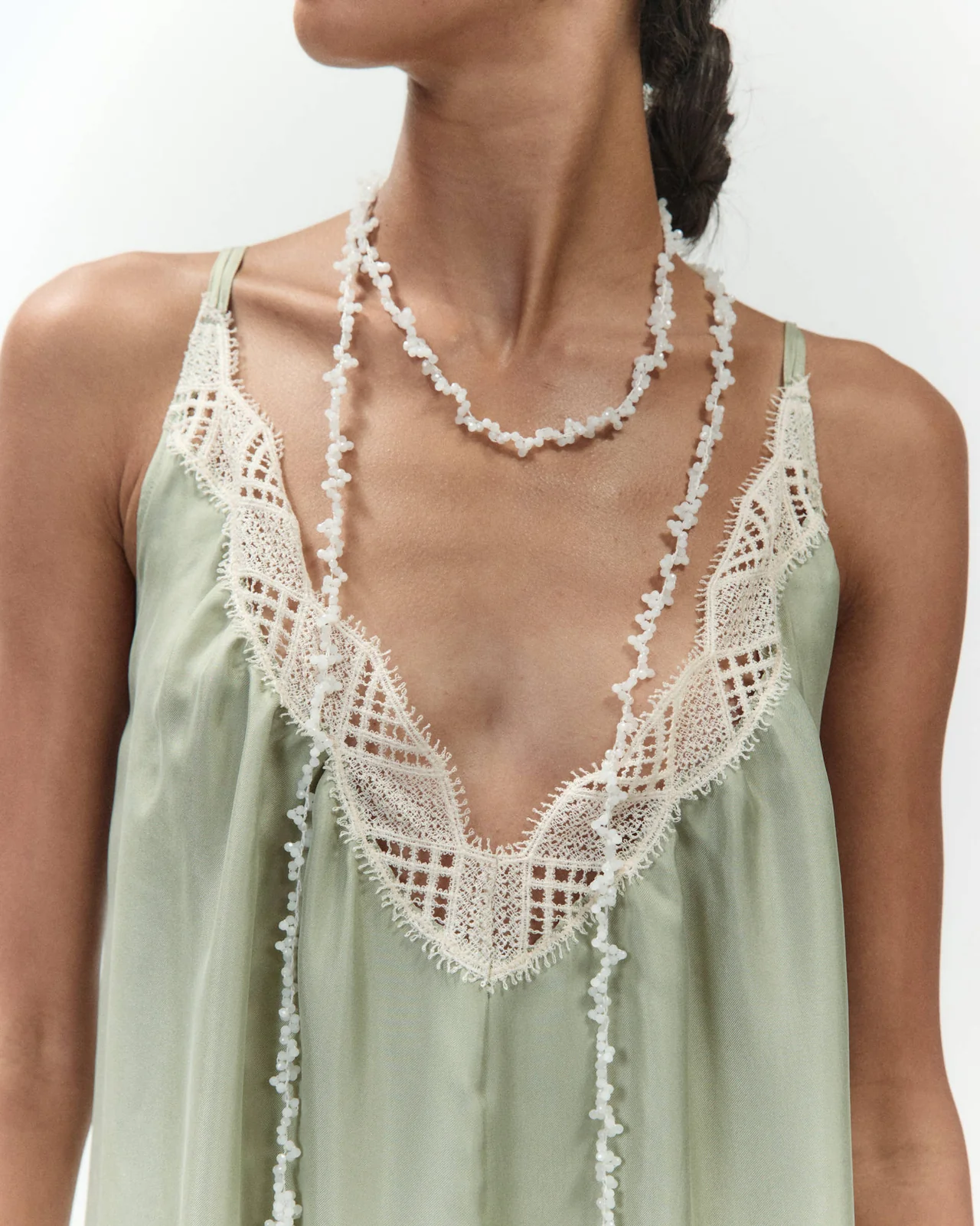 Thin straps frame the shoulders delicately, while the V-neckline is highlighted by contrast lace that underlines the lingerie inspiration of the piece. This detail makes the dress suitable for evening occasions and summer events alike, styled with minimal sandals and understated accessories.