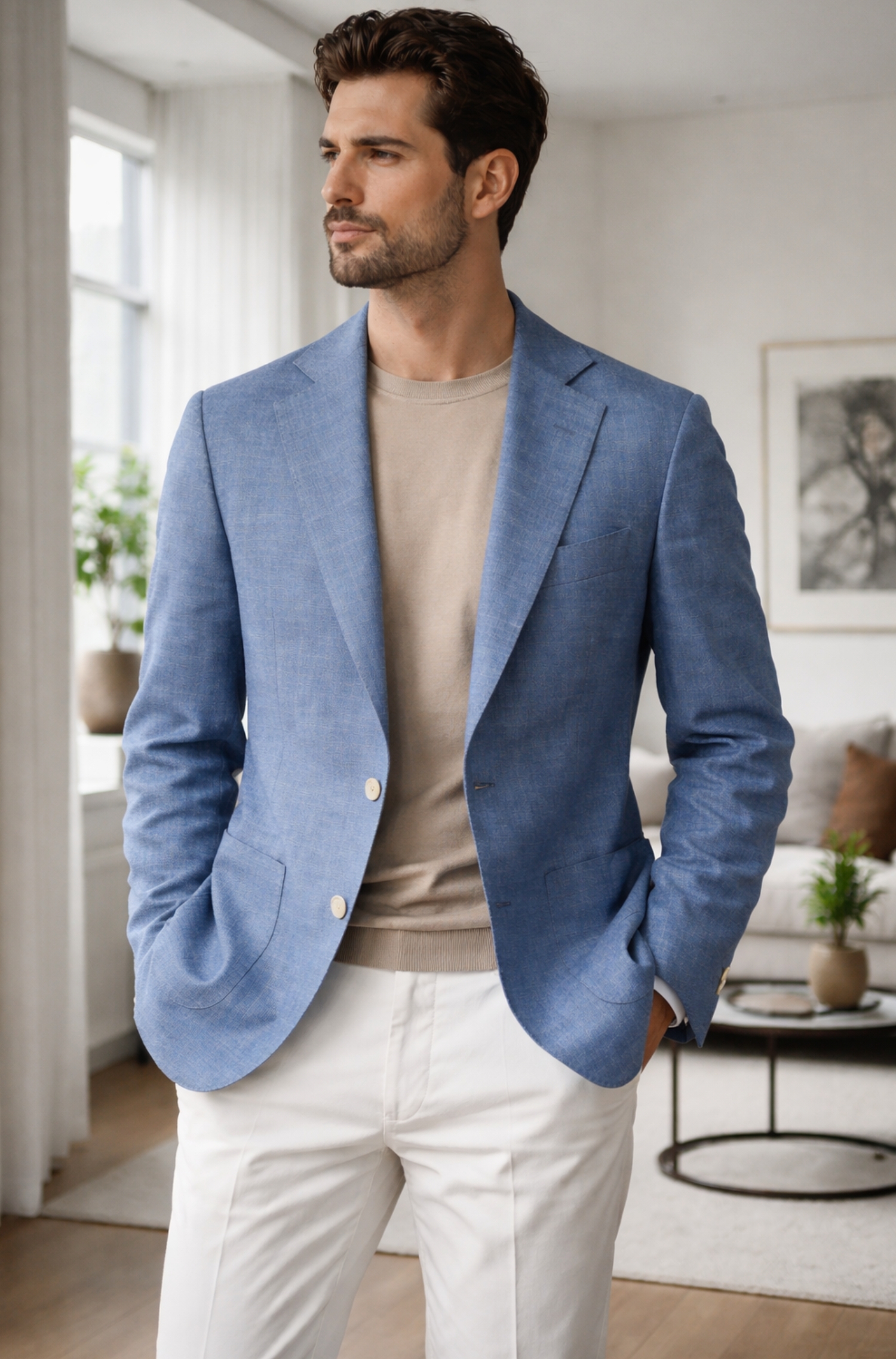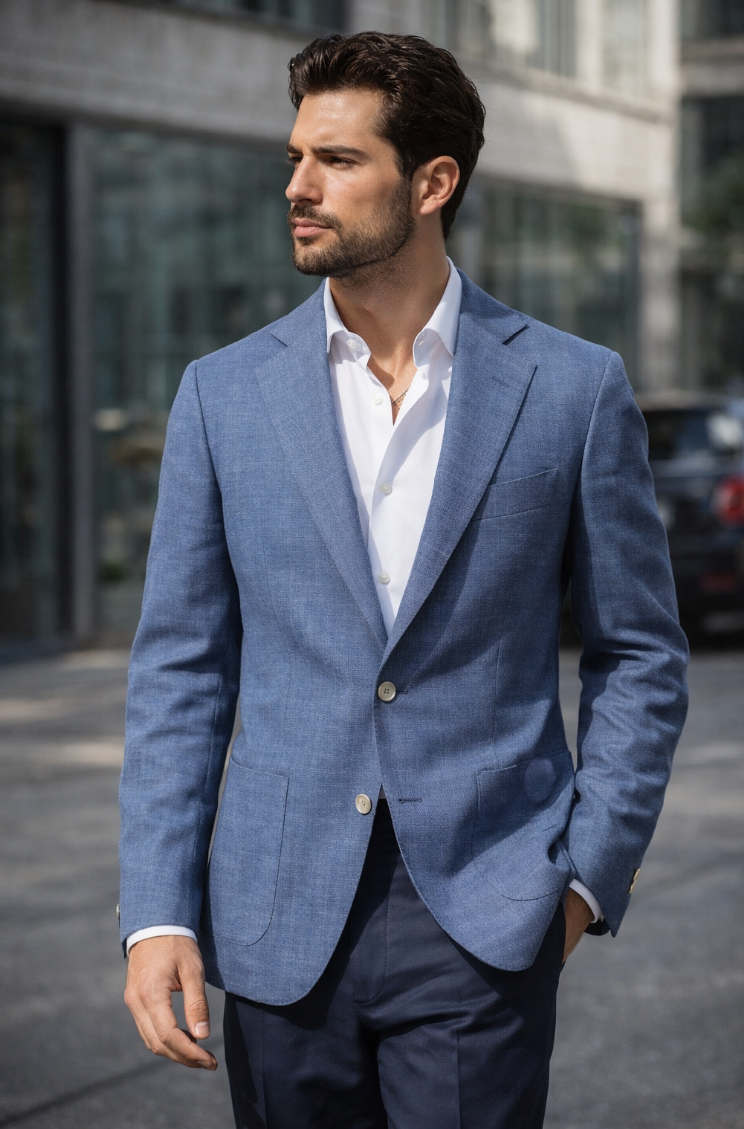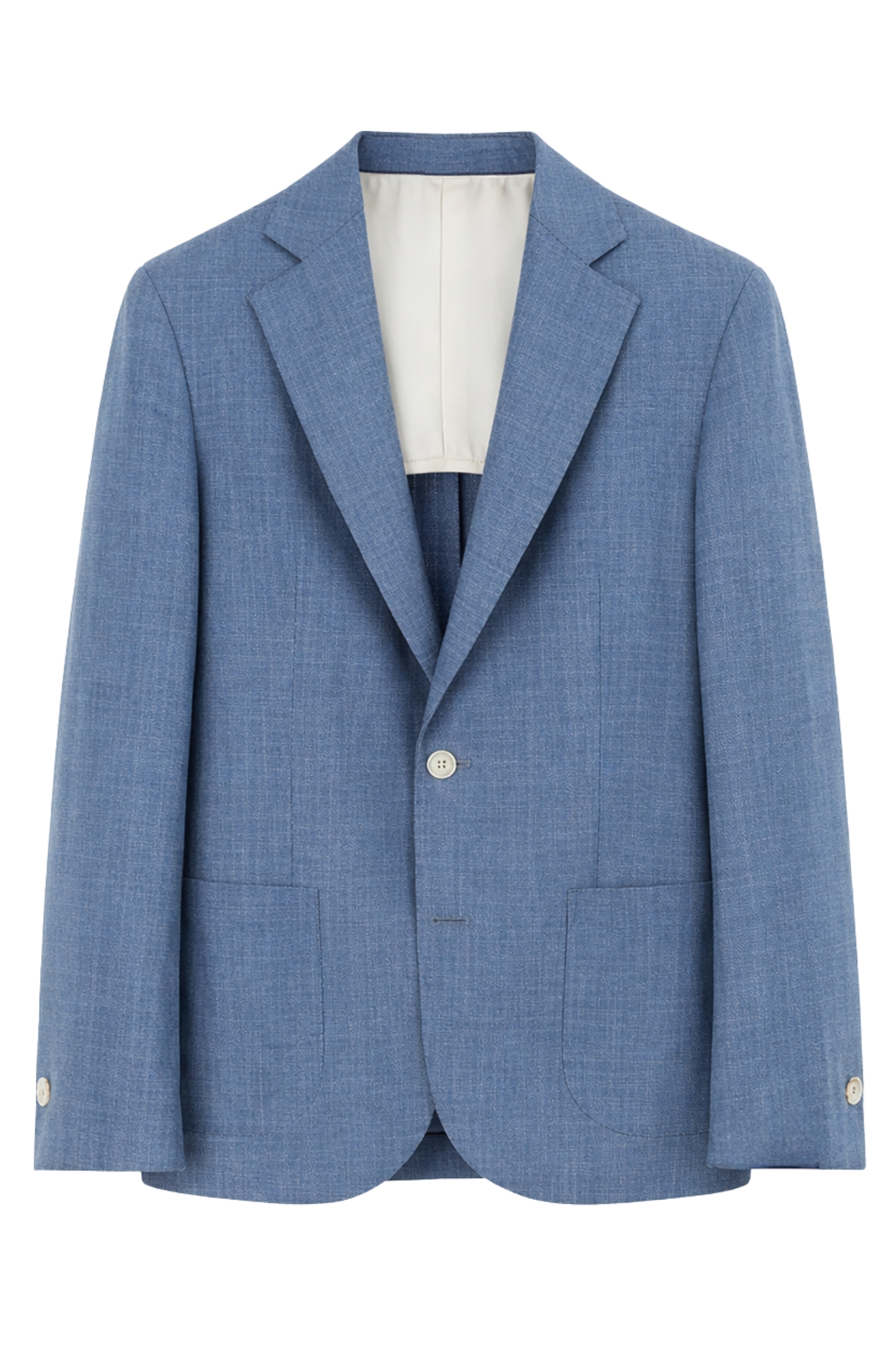 This Barba Napoli EASYJ MONO jacket delivers a relaxed yet polished style with its lightweight construction and clean design. The Loro Piana Summertime fabric in blue mélange features a subtle herringbone pattern that adds depth and a refined texture to the surface. A two-button single-breasted front, classic lapels and patch pockets create a modern, versatile silhouette suited to everyday wear in a premium wardrobe. The smooth back and soft shoulder enhance comfort, while the partial light lining keeps the jacket airy and easy to layer. The Barba Napoli easy label on the cuff highlights its more informal attitude, making it ideal to pair with chinos or clean denim for smart-casual outfits.