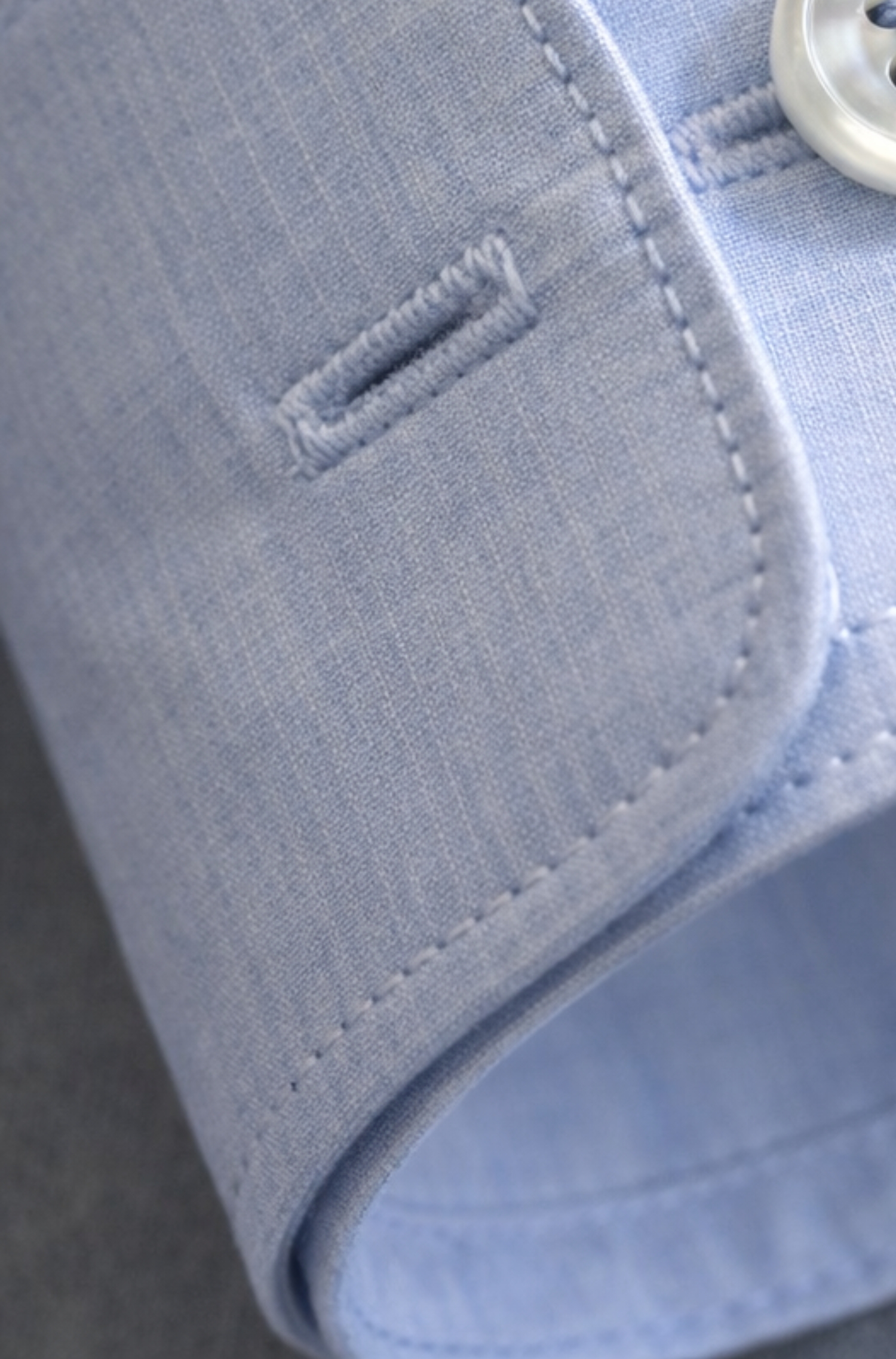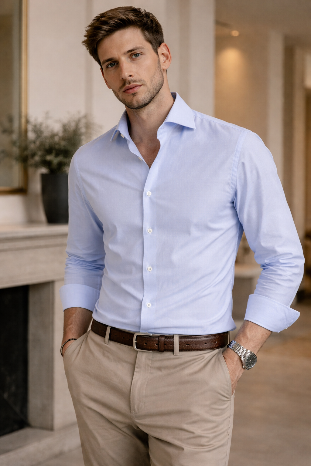 The clean front placket and light-colored buttons with a slightly glossy finish maintain a balanced and minimal aesthetic, while buttoned cuffs complete the structure. Subtle stitching and the absence of decorative elements emphasize the garments refined simplicity. The internal cucito a mano label highlights attention to detail. A versatile shirt suitable for both formal settings and modern everyday wear.