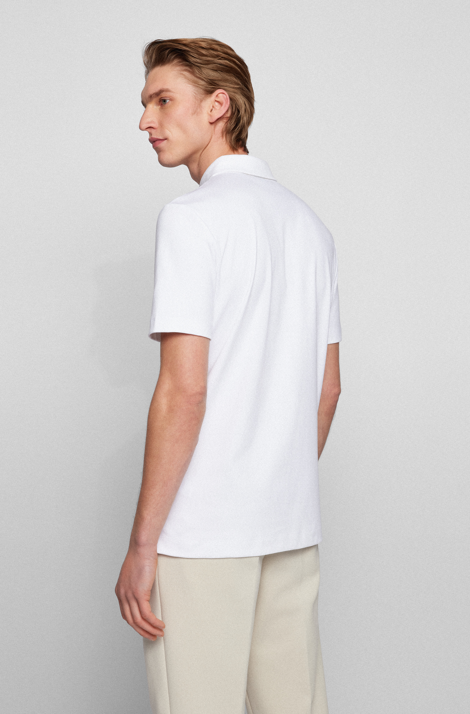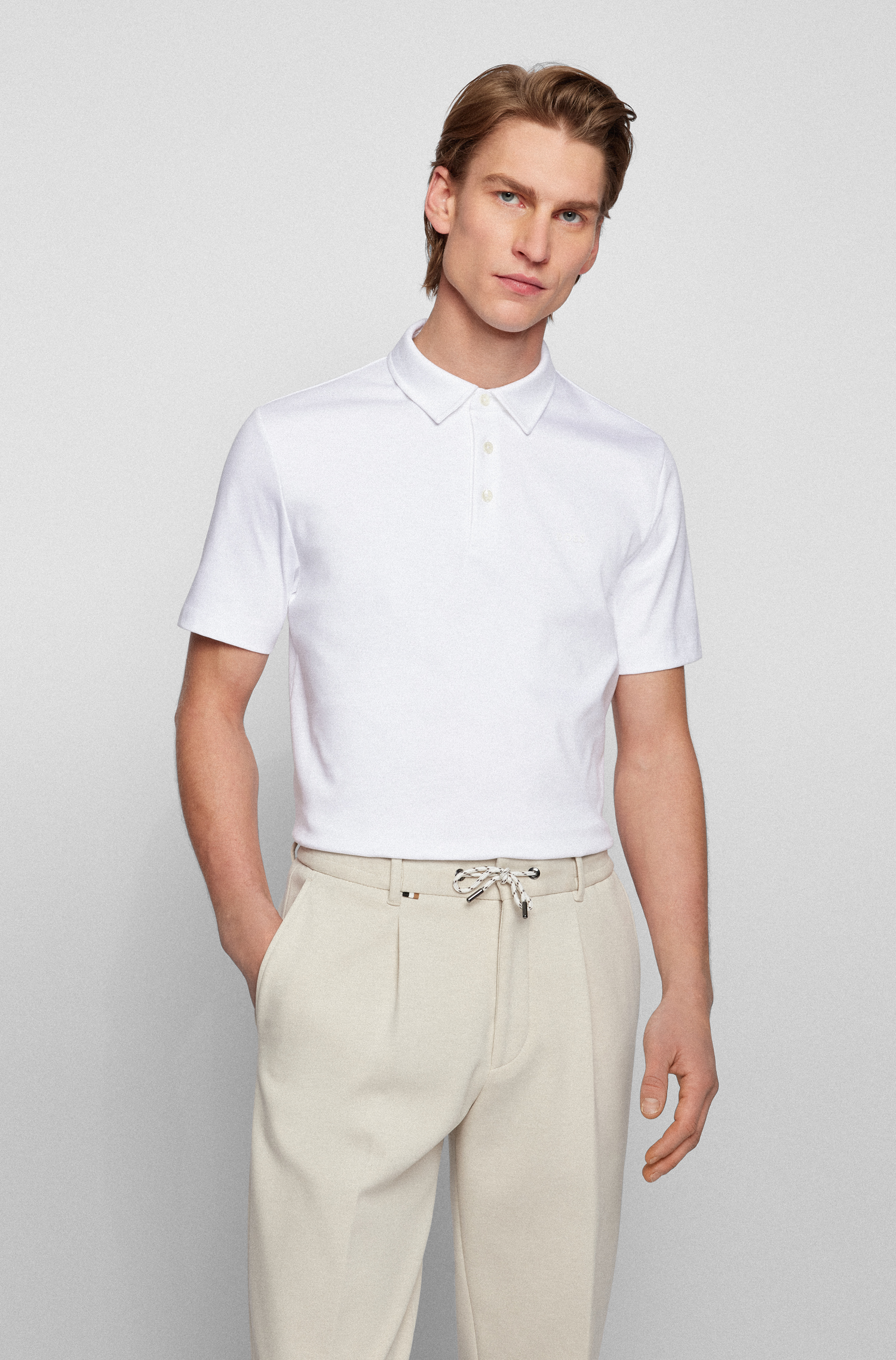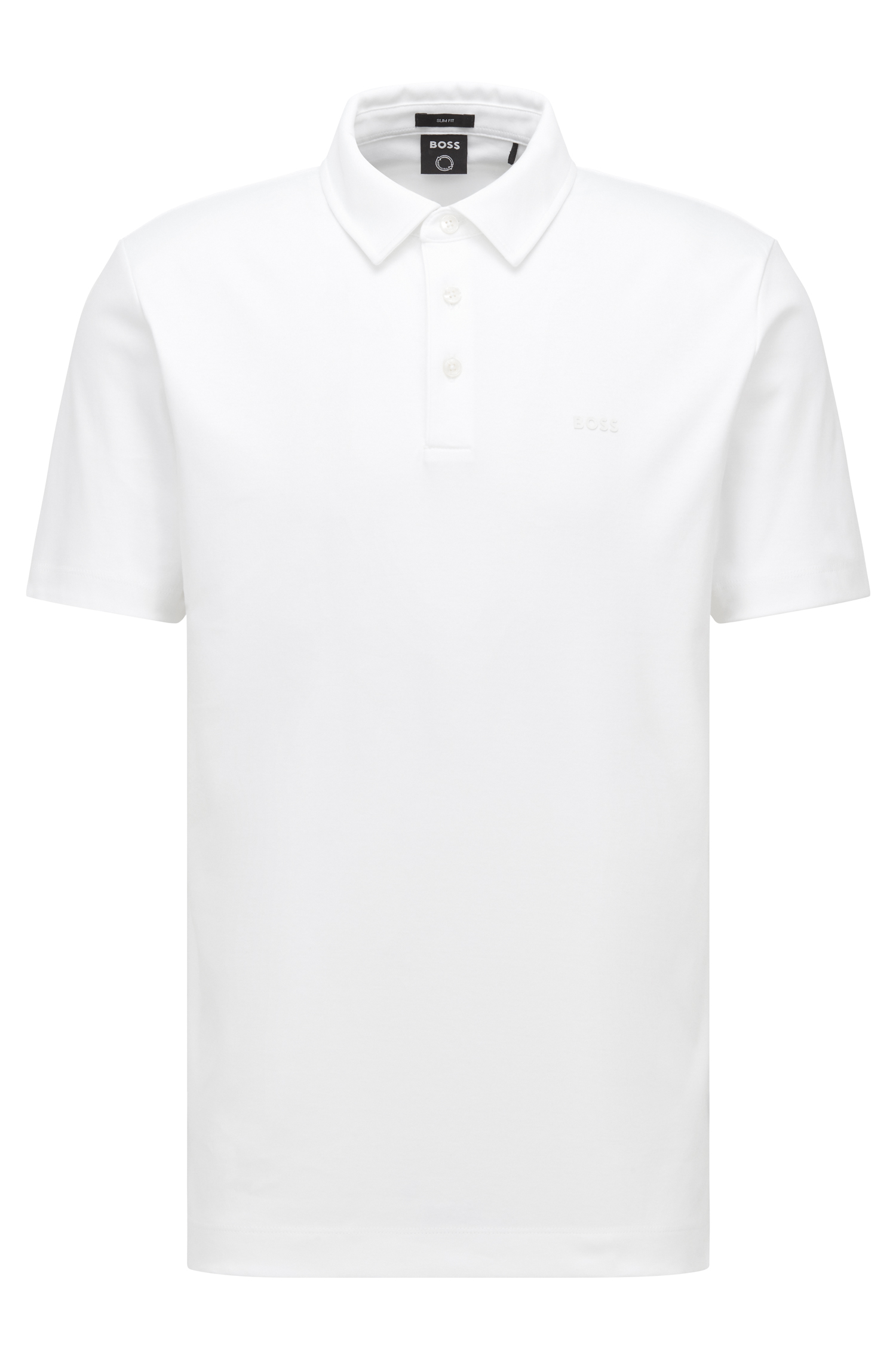 The BOSS Palosh 30 polo is a classic mens polo updated with a modern slim fit that defines the silhouette while remaining easy to wear. Crafted from pure interlock cotton, it has a slightly heavier, smoother structure than regular jersey, delivering a super-soft handfeel and a premium look.