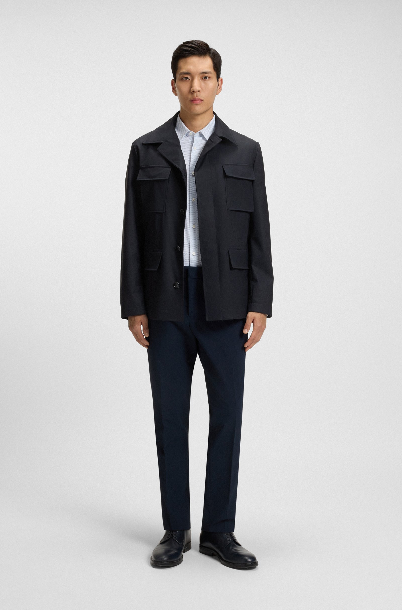 The BOSS Mens water-repellent stretch wool coat is a timeless outerwear piece designed for effortless transitions between seasons. Crafted from a blend of virgin wool and elastane, it ensures comfort, flexibility, and weather resistance while maintaining a refined silhouette.