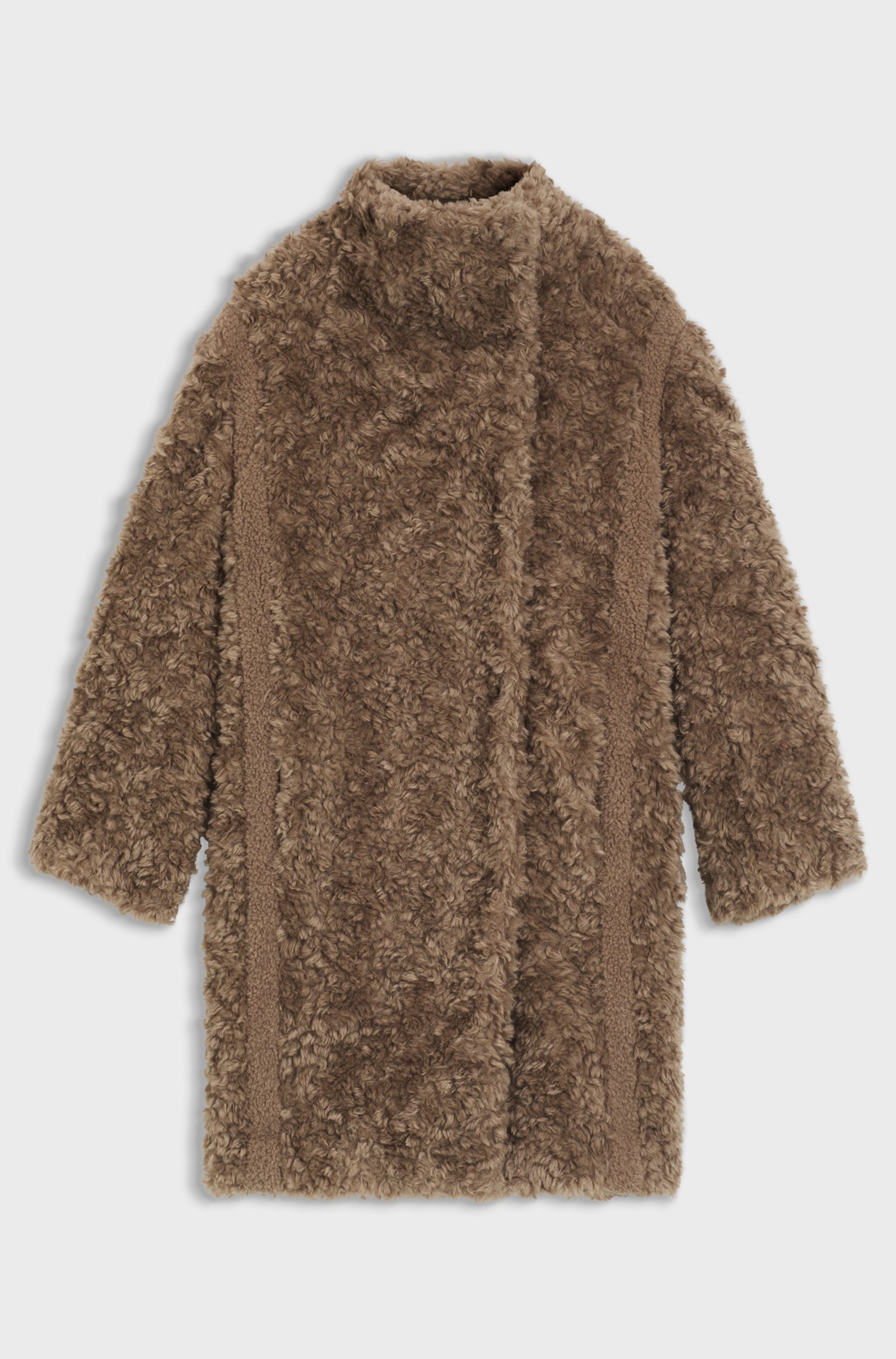 Crafted from high-quality faux fur, blending 90% polyester and 10% wool, it delivers a luxurious texture and natural appearance. The regular fit and hidden front closure create a sleek, flowing silhouette, while the stand-up collar adds a chic, contemporary touch.