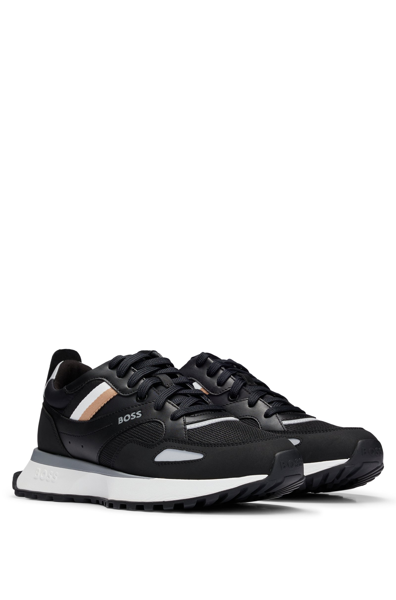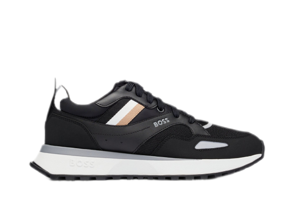 BOSS sporty-style sneakers with the brand's signature striped ribbon, made of a mix of textures including mesh and coated synthetic fabric.