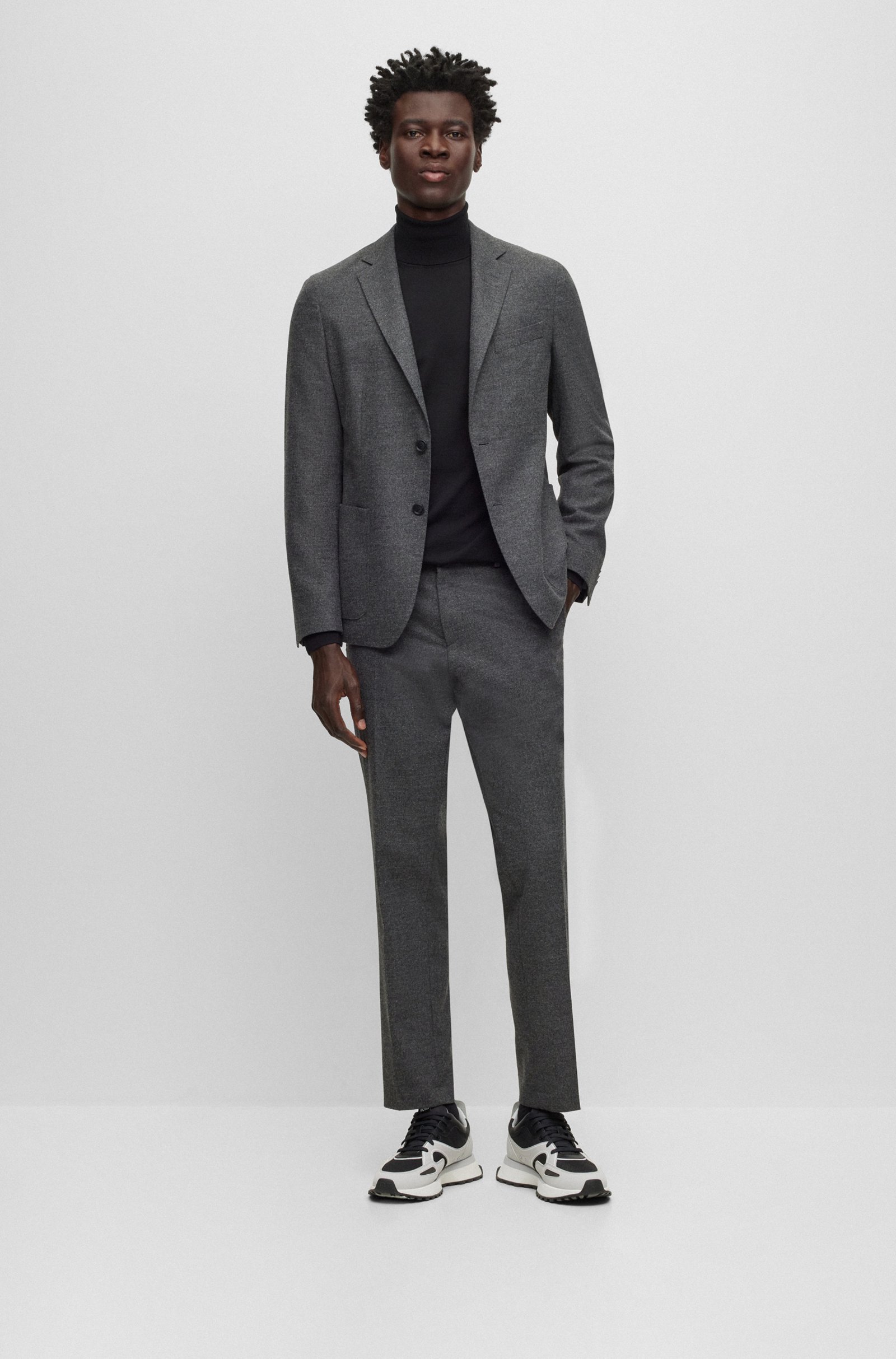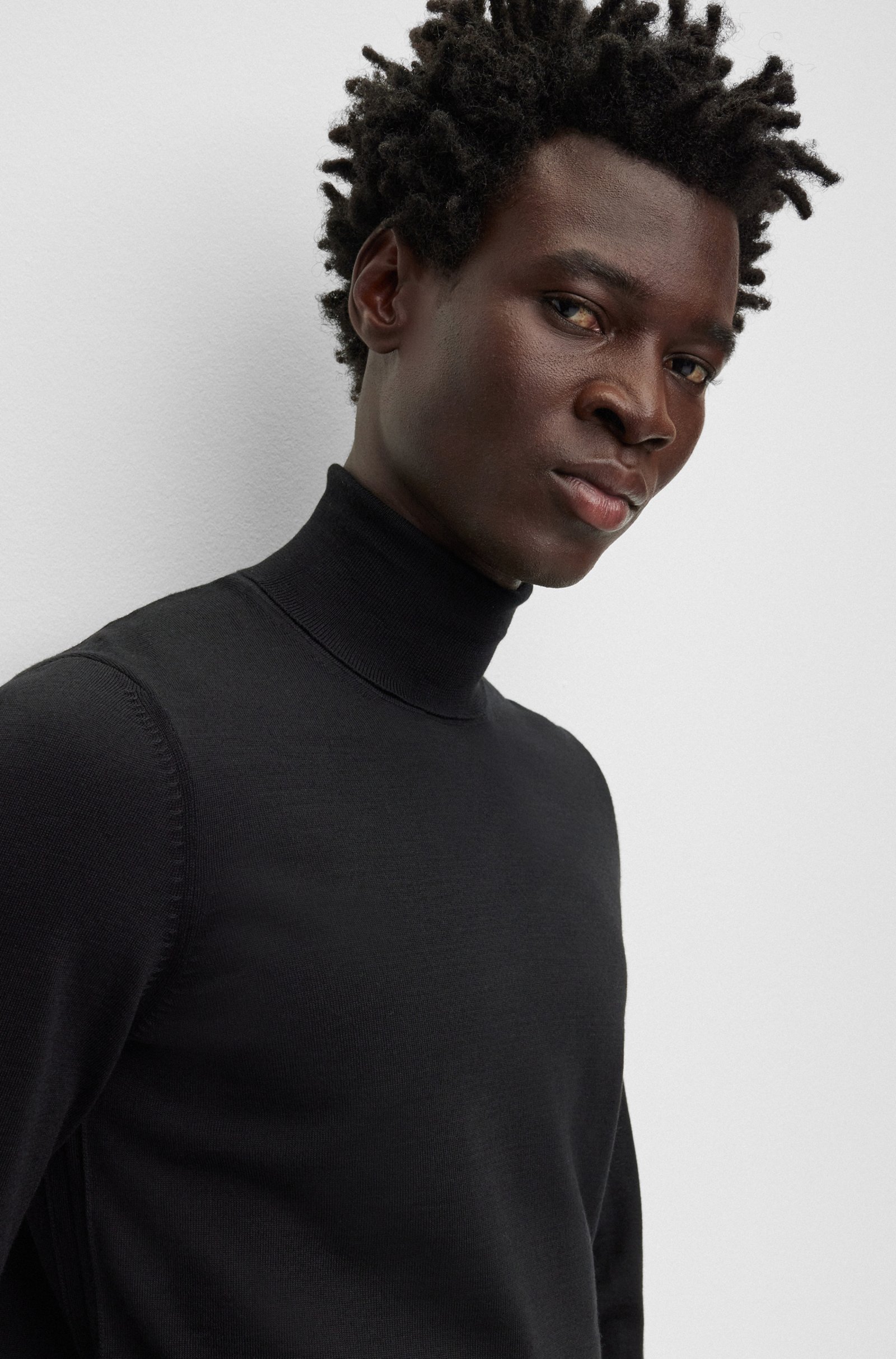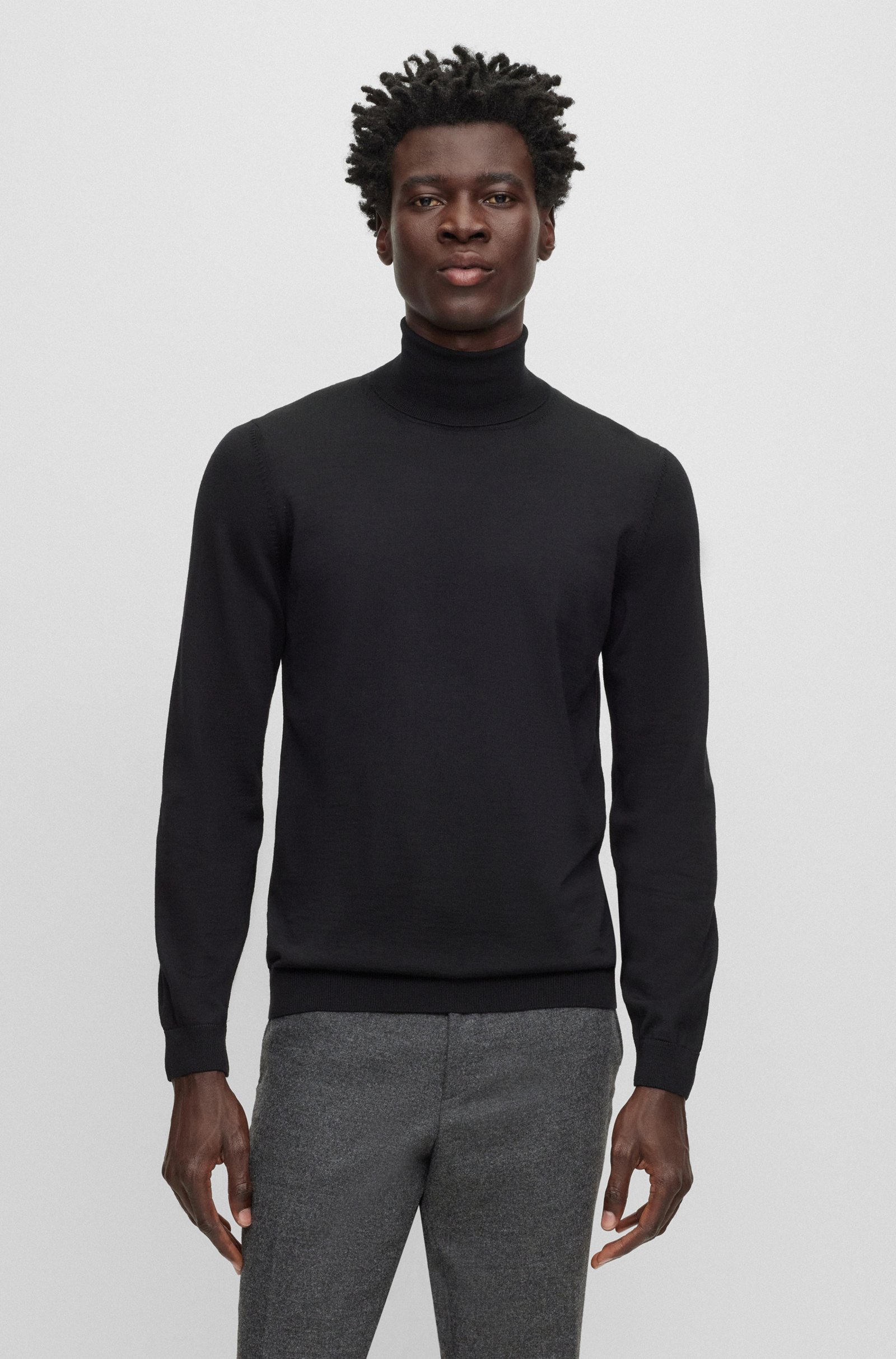 A BOSS Men's slim fit sweater in breathable virgin wool, perfect for any season. We always use at least 60 percent of the best raw materials for our BETTER BOSS products. This garment is made with wool from responsible animal husbandry. To us, being responsibly farmed means being mulesing-free and meeting the standards set by the Five Freedoms for animal protection. Slim fit High collar Long sleeve Ribbed cuffs Standard length