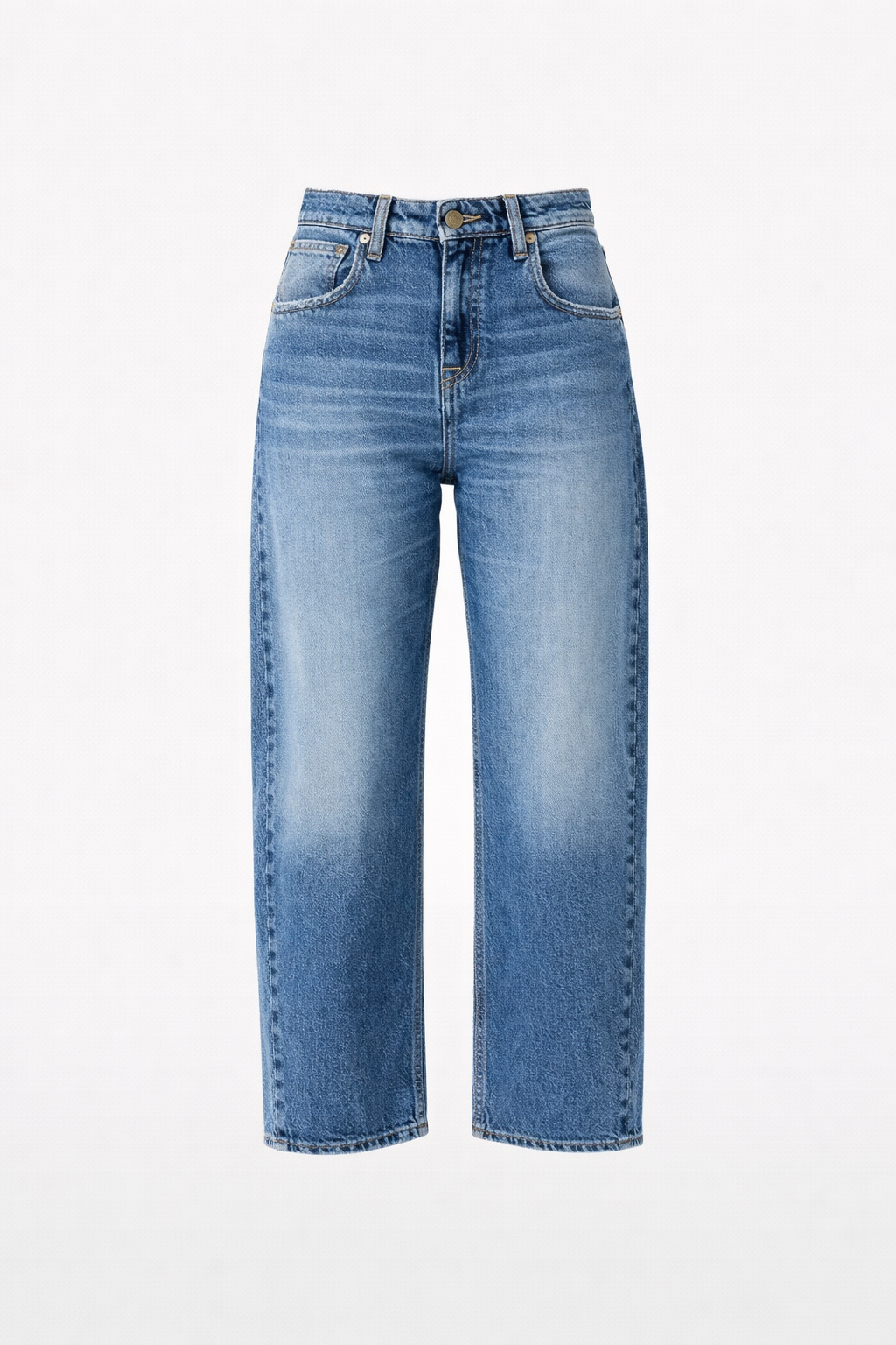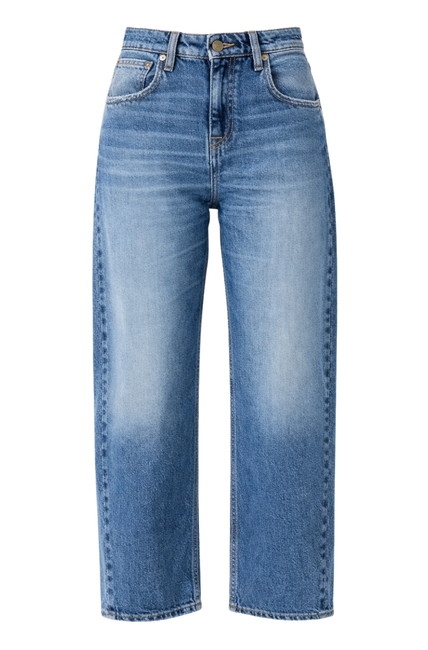 The Aida crop wide leg jeans by Cycle are womens wide-leg jeans with a very low, narrow waist and dropped crotch, designed as a bold statement piece that redefines proportions with ultra-wide legs and vintage navy tones. This four-pocket style is crafted from original 90s rigid 12.75 oz yarn-dyed indigo denim made from cotton and pre-consumer GRS-certified recycled cotton, and comes in a navy blue hue with a vintage-effect mid wash that creates balanced fading.