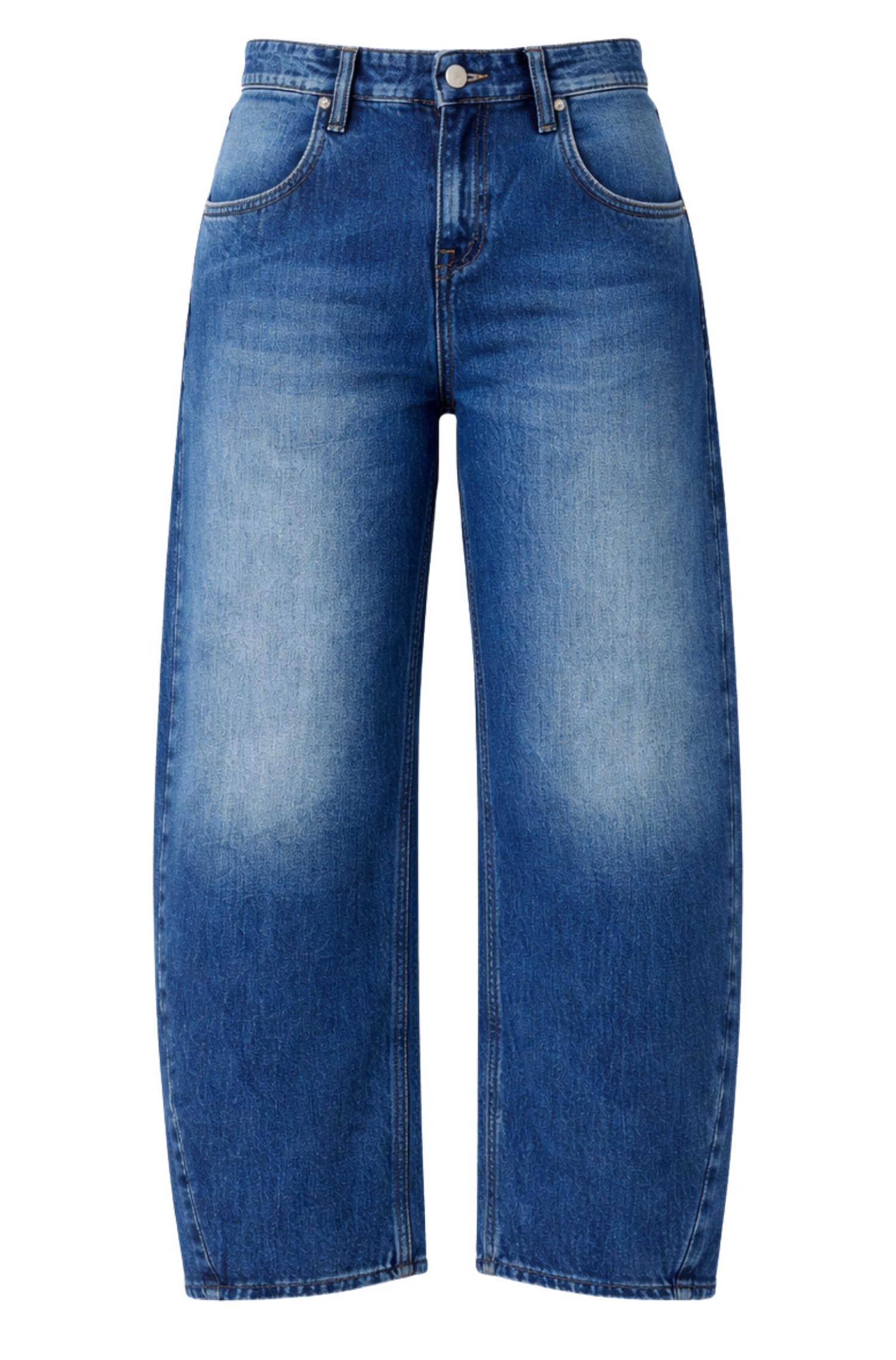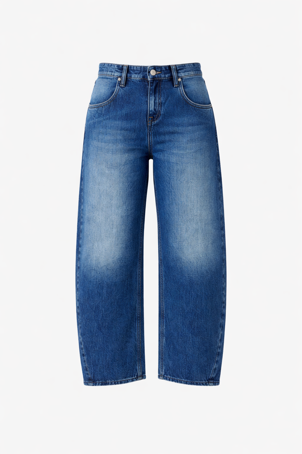 The Aida crop wide leg jeans by Cycle are womens wide-leg jeans with a very low, narrow waist and dropped crotch, designed as a bold statement style that plays with strong volume and 90s-inspired proportions. This four-pocket model is made from original 90s rigid yarn-dyed indigo denim 12.75 oz, blending cotton and pre-consumer GRS-certified recycled cotton, in a navy blue shade finished with a stone wash and brushing that creates targeted fading on key wear areas.