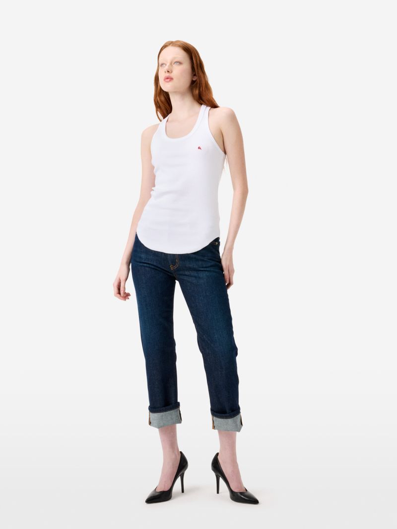 The America ribbed tank top by Cycle is a womens sleeveless essential made from pure cotton ribbed jersey with a rinse wash, designed to bring a contemporary touch even to everyday looks. The cotton fabric feels soft and breathable on the skin, making this tank easy to wear on its own or layered under jackets and shirts.