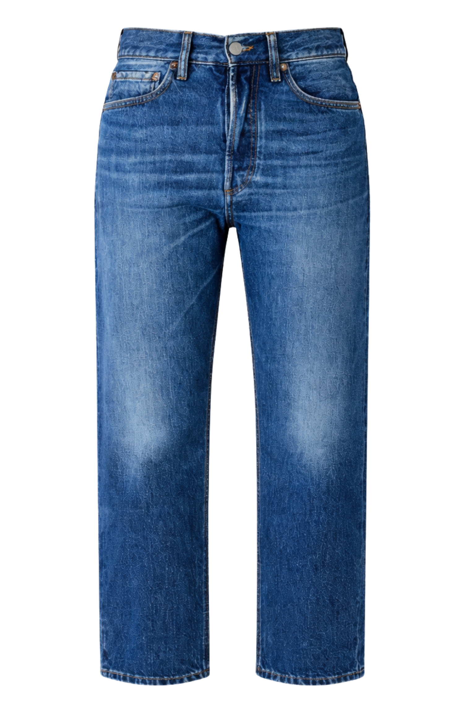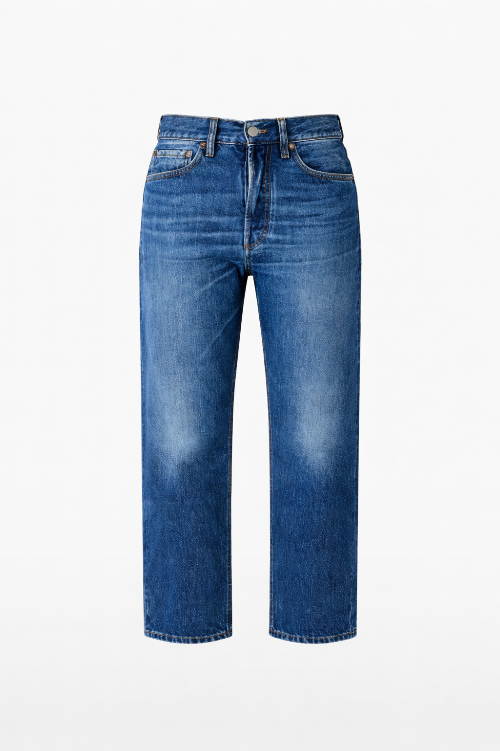The mid-rise waist gently defines the waistline, while the relaxed straight leg above the ankle elongates the figure and showcases sneakers, sandals or ankle boots. On the back, signature Cycle codes appear in the criss-cross belt loops that echo the logo and the small plated logo detail on one of the patch pockets.