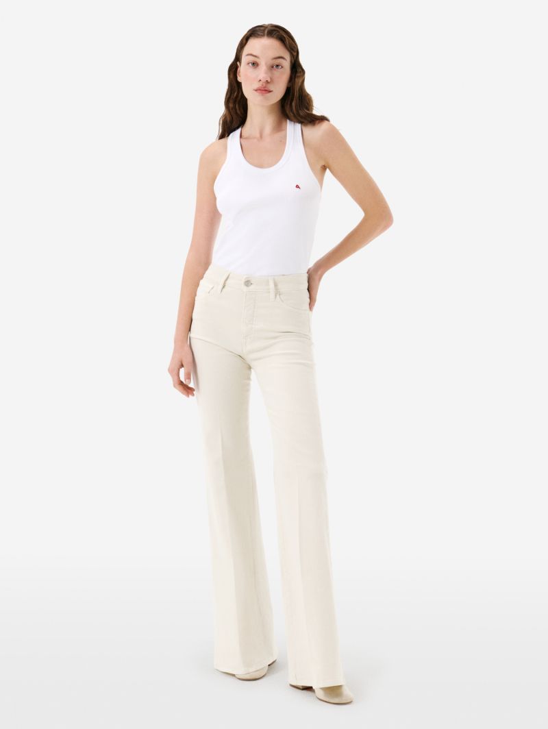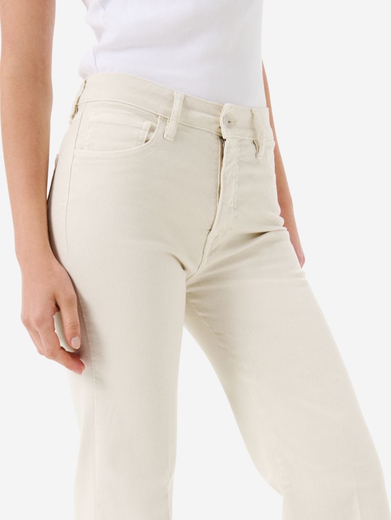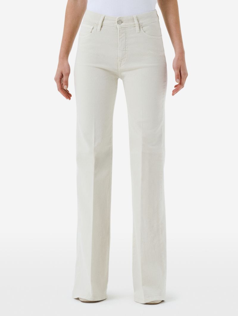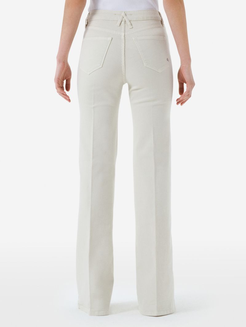 Discover Cycle's women's high rise flare jeans, model 452P550 in stone rinse. Made from Bull Stretch Denim High Recovery for maximum comfort and perfect fit, these jeans feature a long flared leg with a pressed center crease, five pockets, Cycle logo on the rear pocket, and zip and button closure. The stone rinse wash creates a modern and versatile look, ideal for both casual and elegant outfits. 100% Made in Italy.