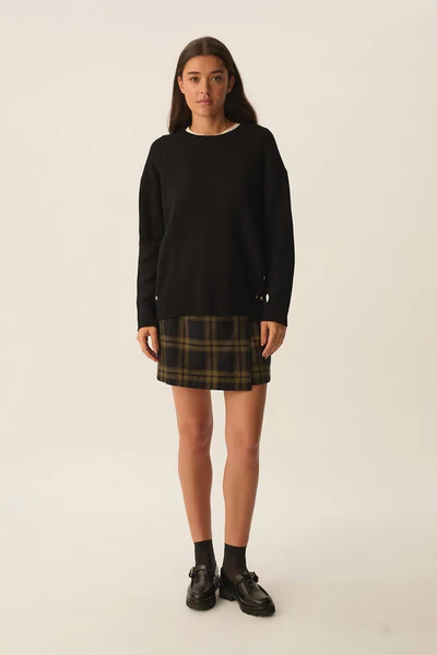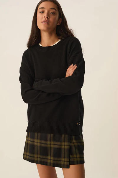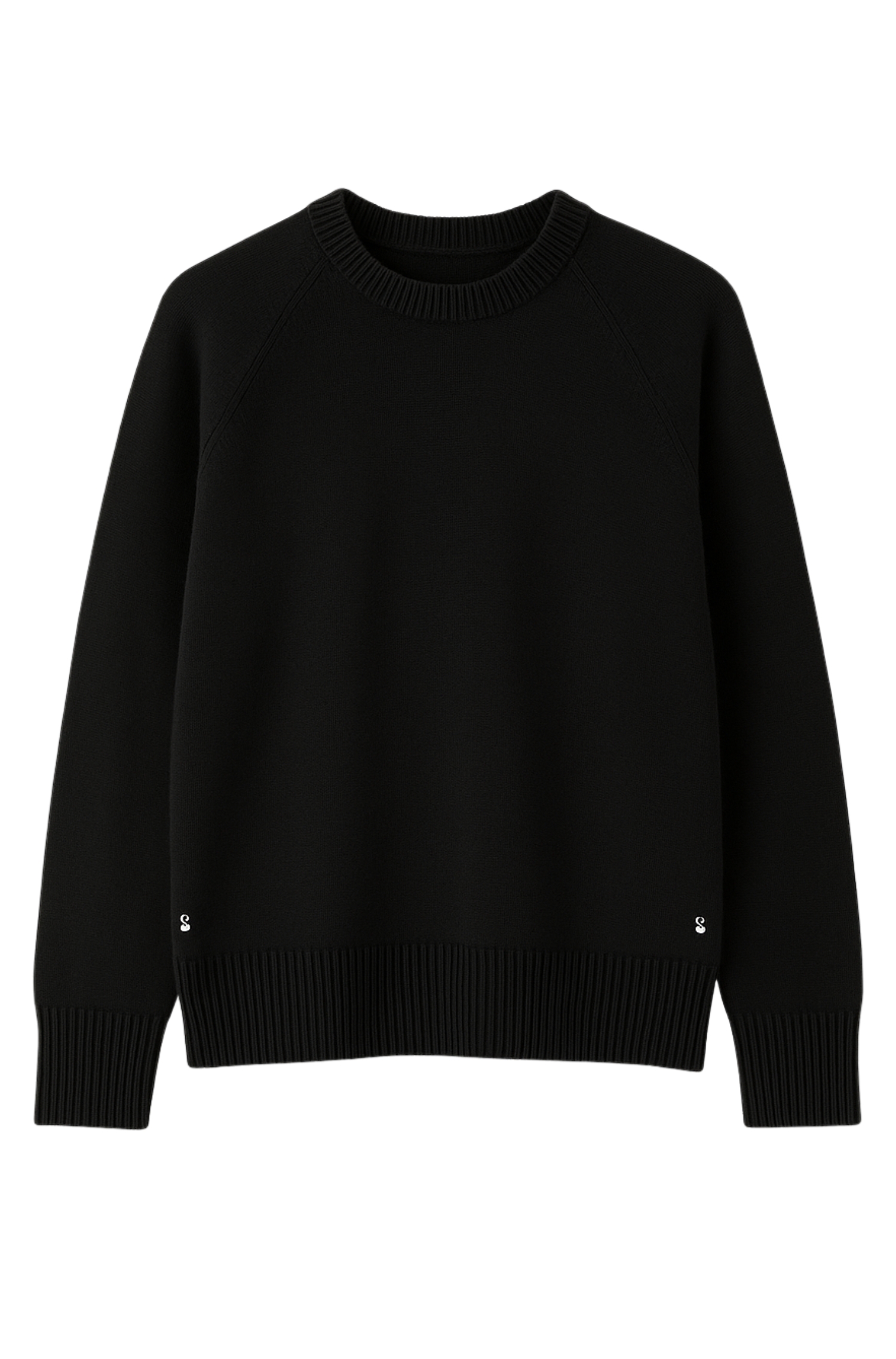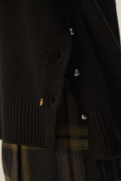 Made from 100% extrafine merino wool, this black long-sleeved jumper combines warmth, softness, and a refined cashmere-like feel. The wide cut, round neckline, and dropped shoulders create an effortlessly sophisticated silhouette, while the side button fastening with gold buttons adds a distinctive, luxurious touch. Finished with ribbed trims and smooth jersey knit, this piece is perfect for every occasion a true wardrobe essential to collect in multiple colours.