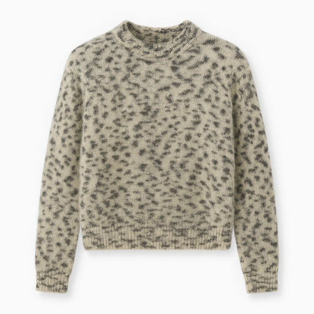 Soft yet statement-making, the Boleo by Des Petits Hauts is this seasons essential knit: premium Italian yarn in kid mohair and wool with a plush, cozy hand feel. The contemporary boxy fit, slightly high crew neck, and dropped shoulders deliver effortless chic, while the black-on-ecru dalmatian pattern adds a playful graphic twist that elevates denim and tailored separates alike. Finished with ribbed trims and jersey knit for everyday versatility and Parisian flair.