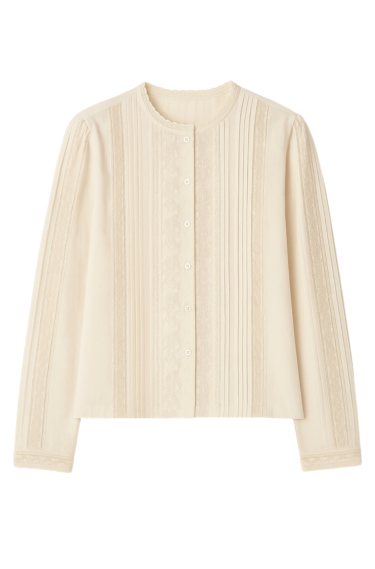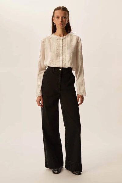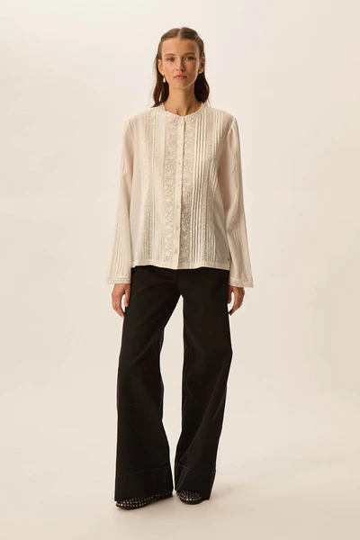 Crafted from cotton and viscose voile, this blouse stands out for its soft texture and subtle transparency, offering a light, airy feel. The intricate embroidery and lace inserts on the front, collar, and sleeves evoke heirloom craftsmanship, while the straight cut and round neckline lend a modern touch. Finished with long sleeves and mother-of-pearl buttons, its a versatile piece that pairs beautifully with high-waisted jeans or skirts for a chic bohemian look with Parisian flair.