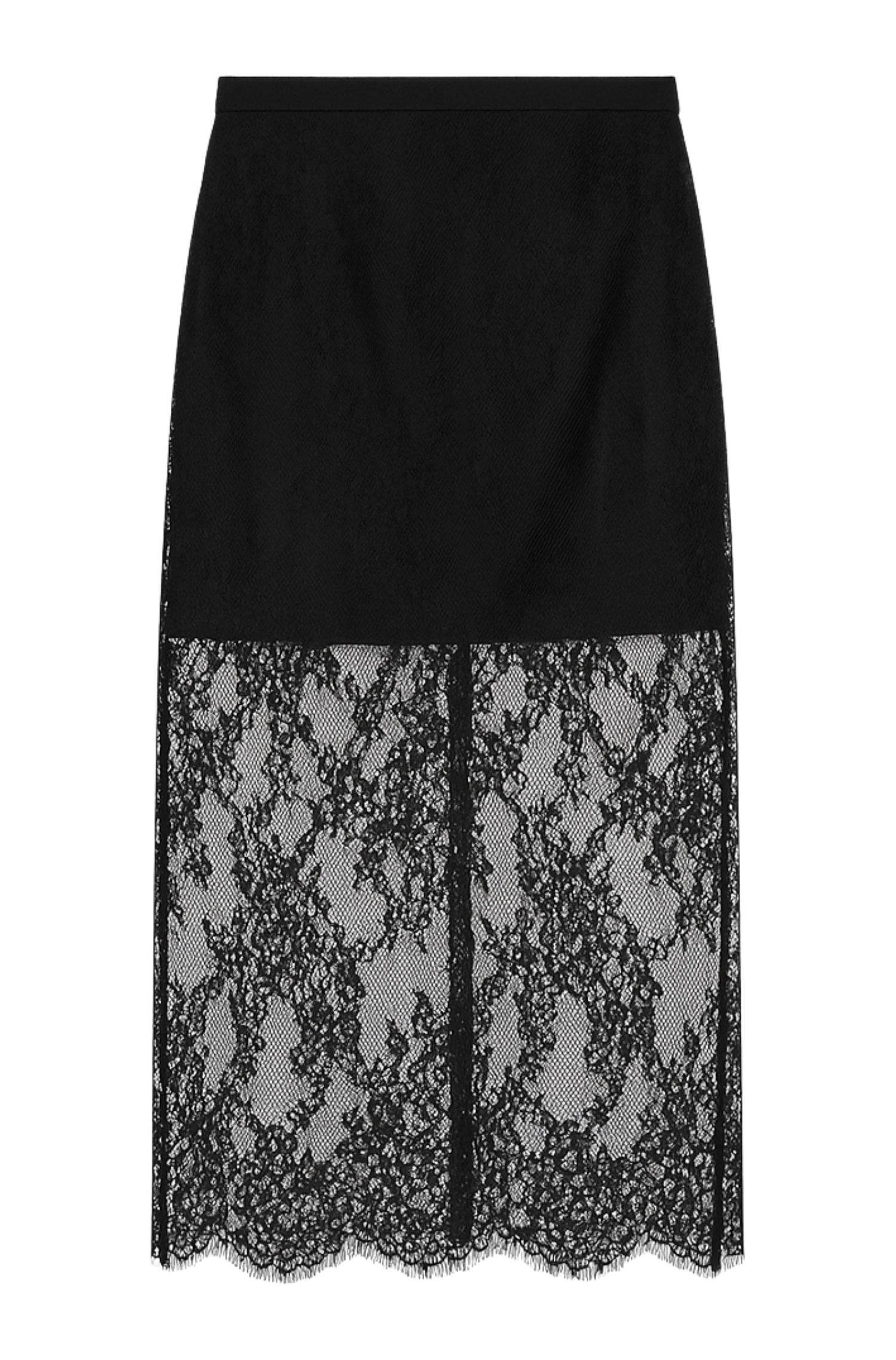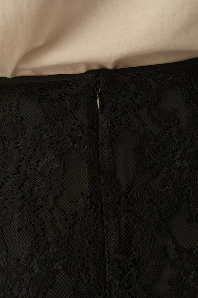Crafted from cotton and nylon floral lace, this midi-length skirt features a high-waisted, close-fitting silhouette that flatters the figure. The long centre-back slit adds movement and allure, while waist darts ensure a perfect shape. Lined to mid-thigh, it balances coverage and subtle transparency for an effortlessly sophisticated look. The black floral lace gives it timeless charm, making it easy to style with a blouse and loafers for chic elegance or with a sweatshirt and sneakers for a laid-back yet polished outfit.
