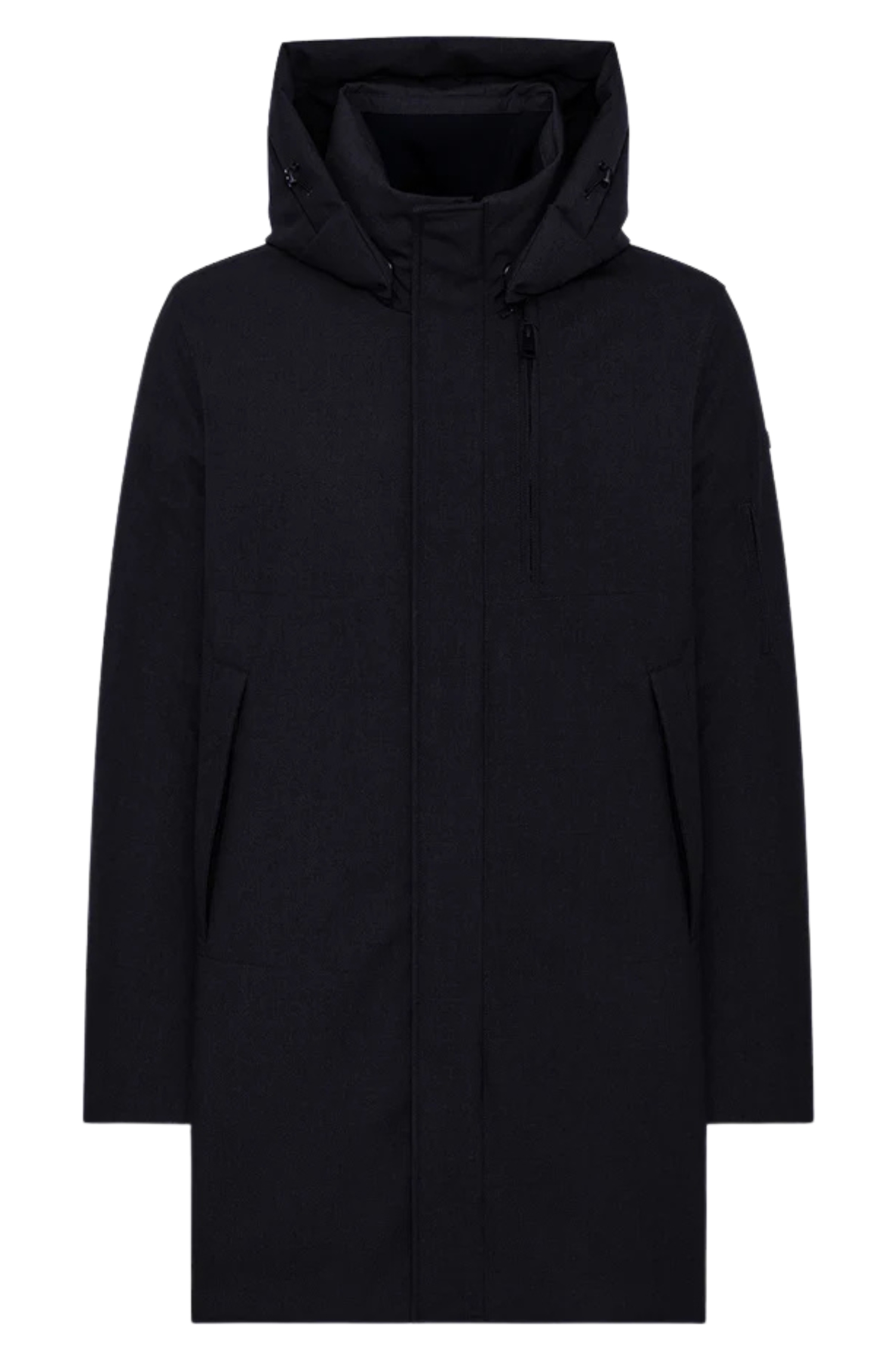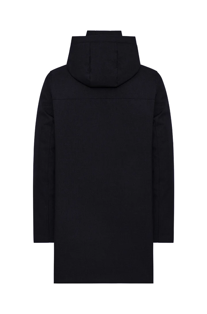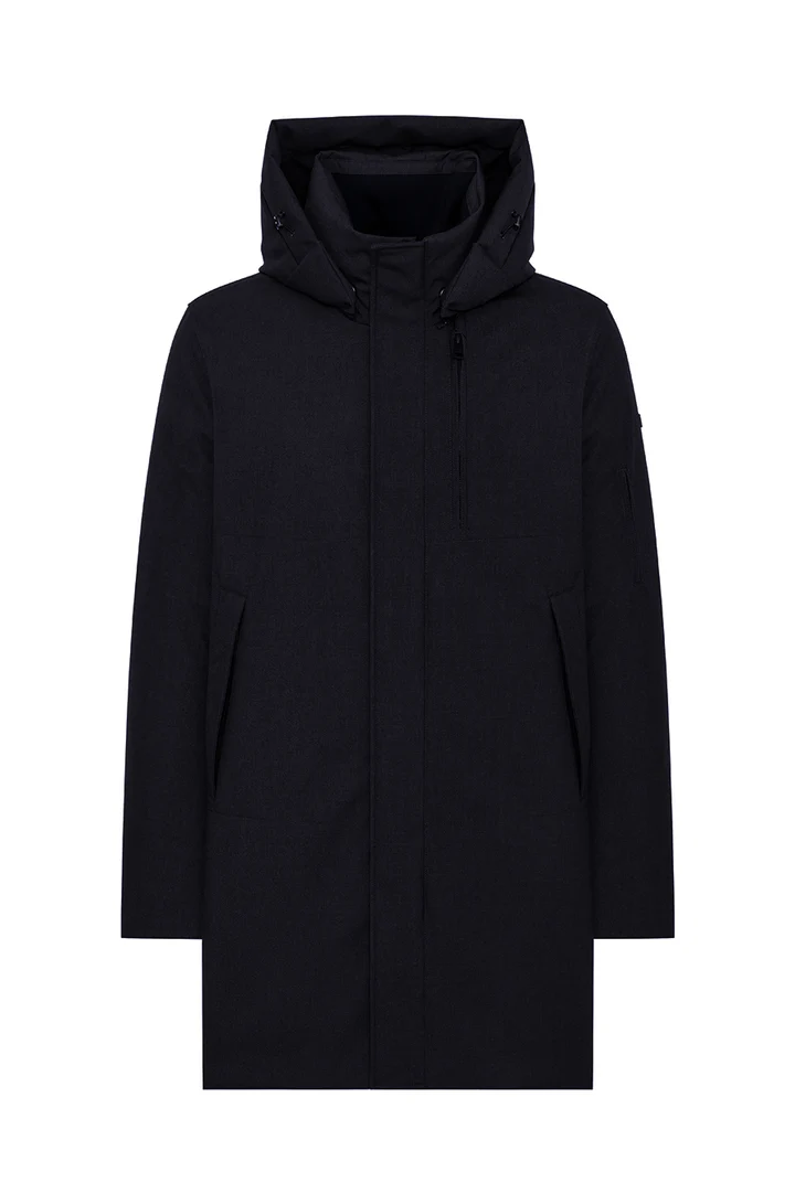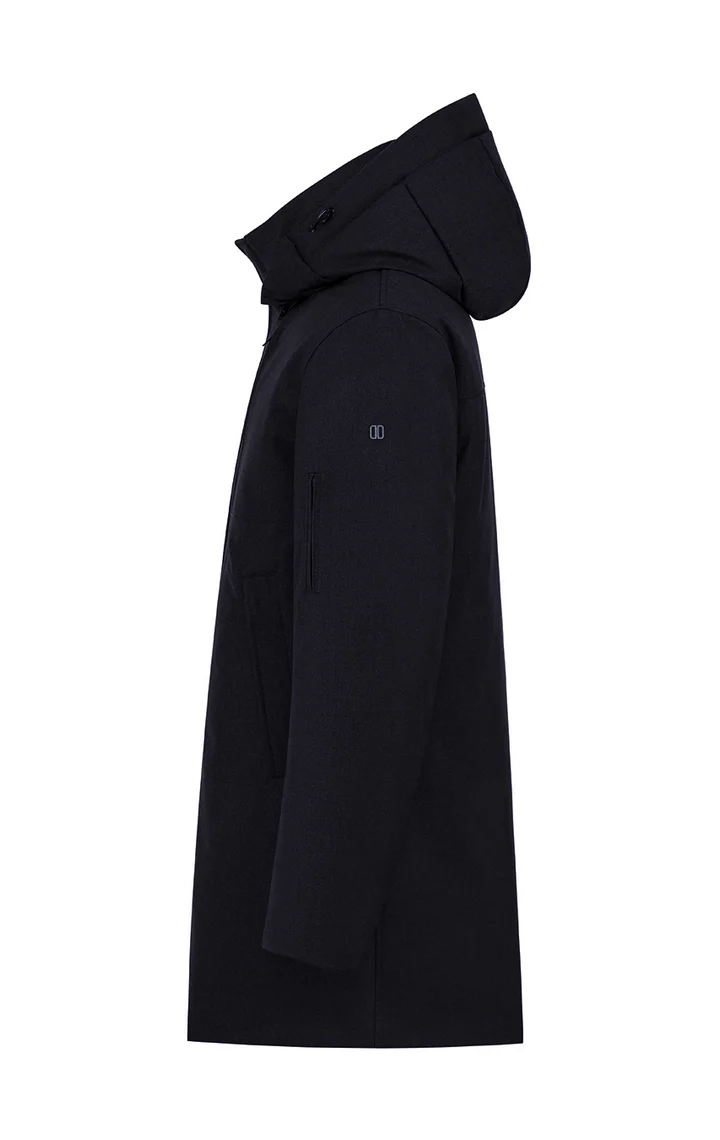 Its wool-effect diagonal texture adds a touch of elegance, making it ideal for urban use and changing weather conditions. The stand-up collar with detachable hood, adjustable through a concealed drawstring, offers versatility and comfort, while the neoprene back detail with embossed DUNO logo gives the coat a distinctive signature.