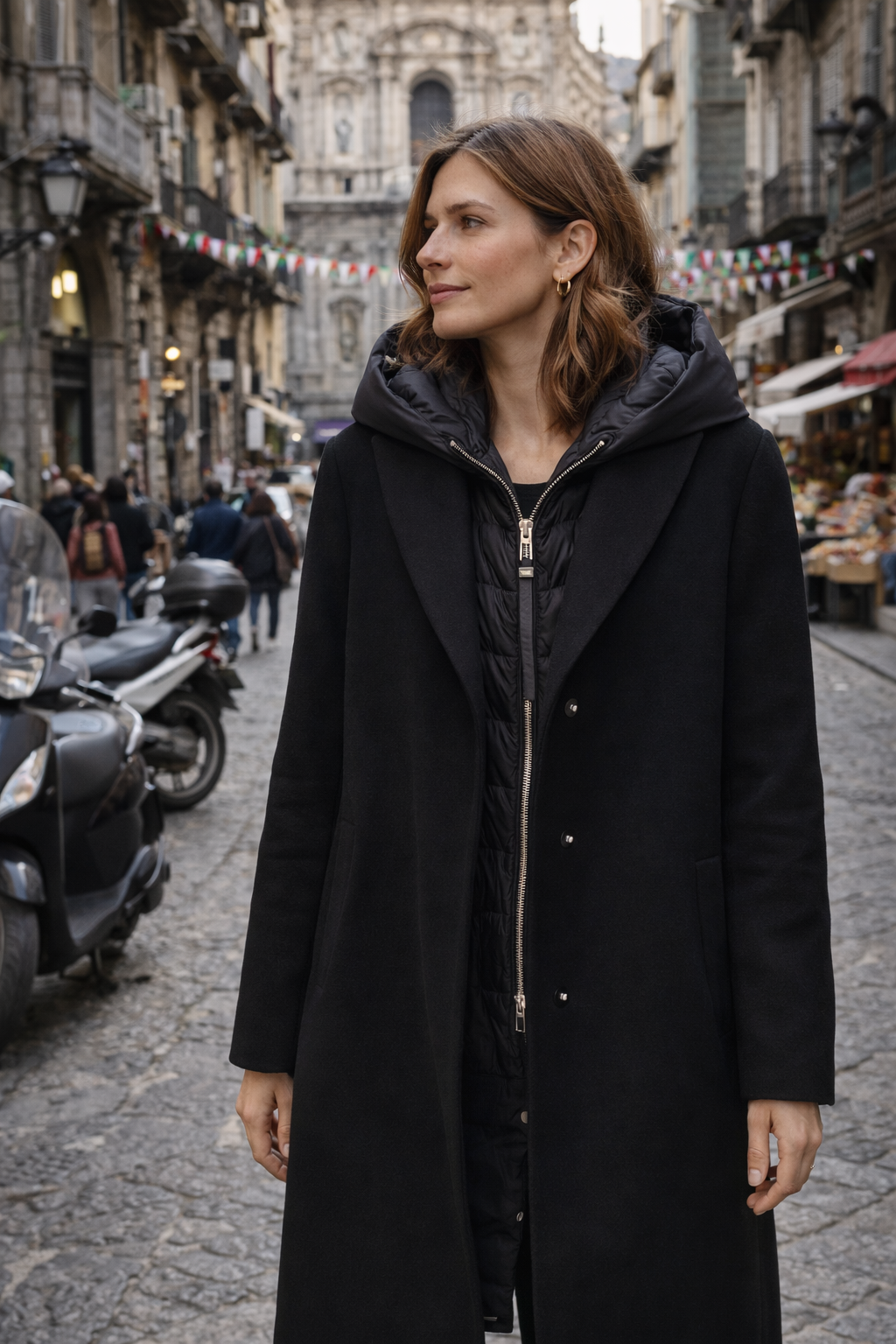 A modern, functional coat that combines sartorial precision, warmth, and understated elegance, ideal for sophisticated winter wear.