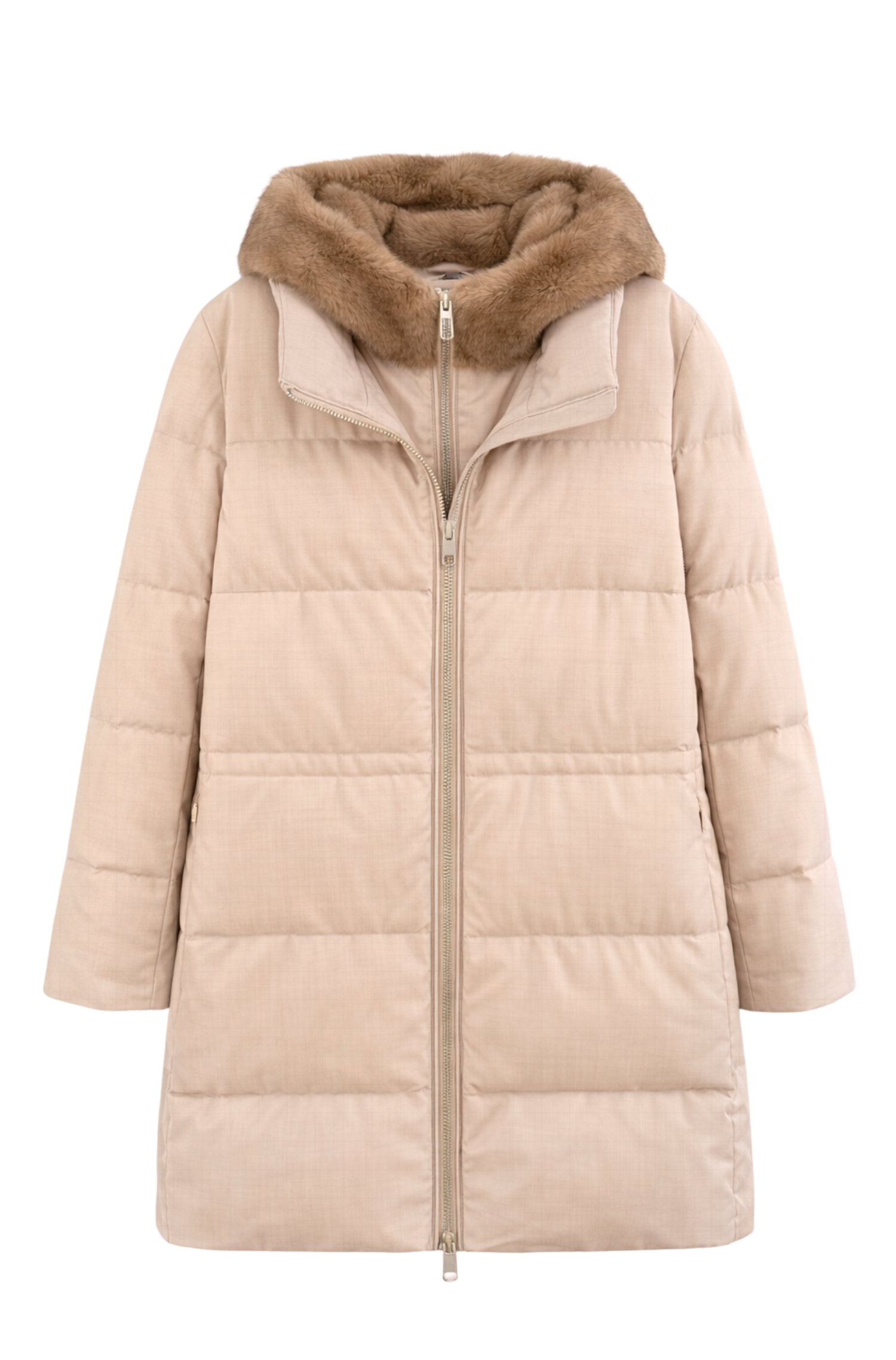 The filling in real duck down provides excellent thermal insulation while keeping the jacket exceptionally lightweight. The hood finished with eco-fur trim adds a sophisticated and cozy touch, while the zip closure and clean silhouette enhance the feminine shape without compromising practicality.