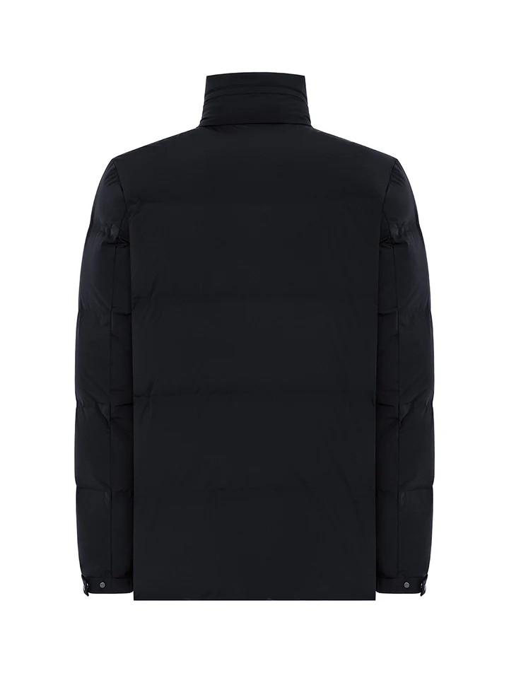 Featuring a stand-up collar with concealed hood, dual-slider water-resistant zip with hidden snaps, and flap patch pockets, the jacket delivers a refined yet functional design. Adjustable strap cuffs and multi-functional interior pockets enhance versatility and utility.