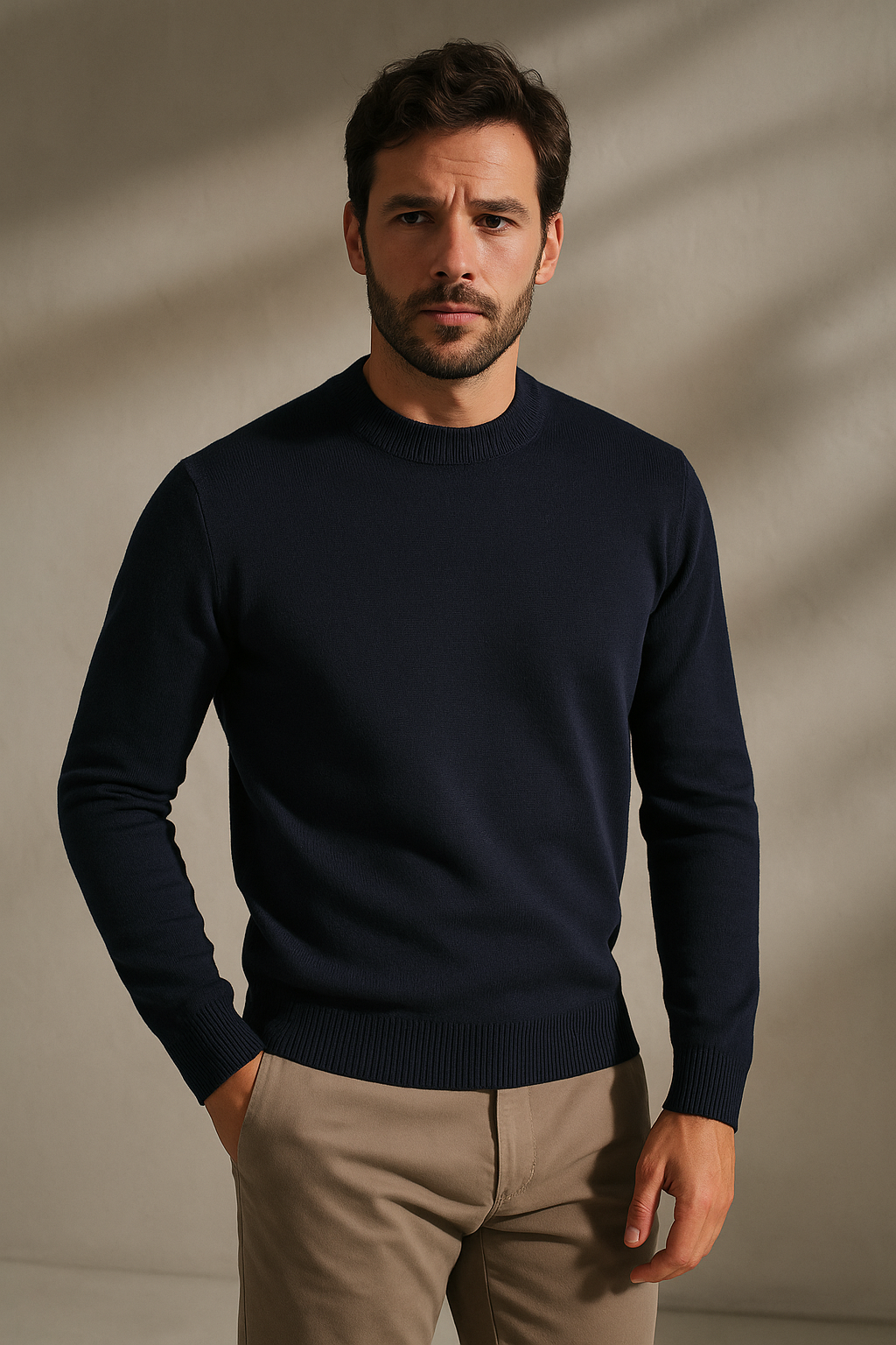Designed with a classic crewneck, ribbed edges and a fine-gauge knit, this sweater has a polished and versatile look. The navy blue shade (col. 80) adds timeless sophistication and easy styling with both casual and tailored outfits.