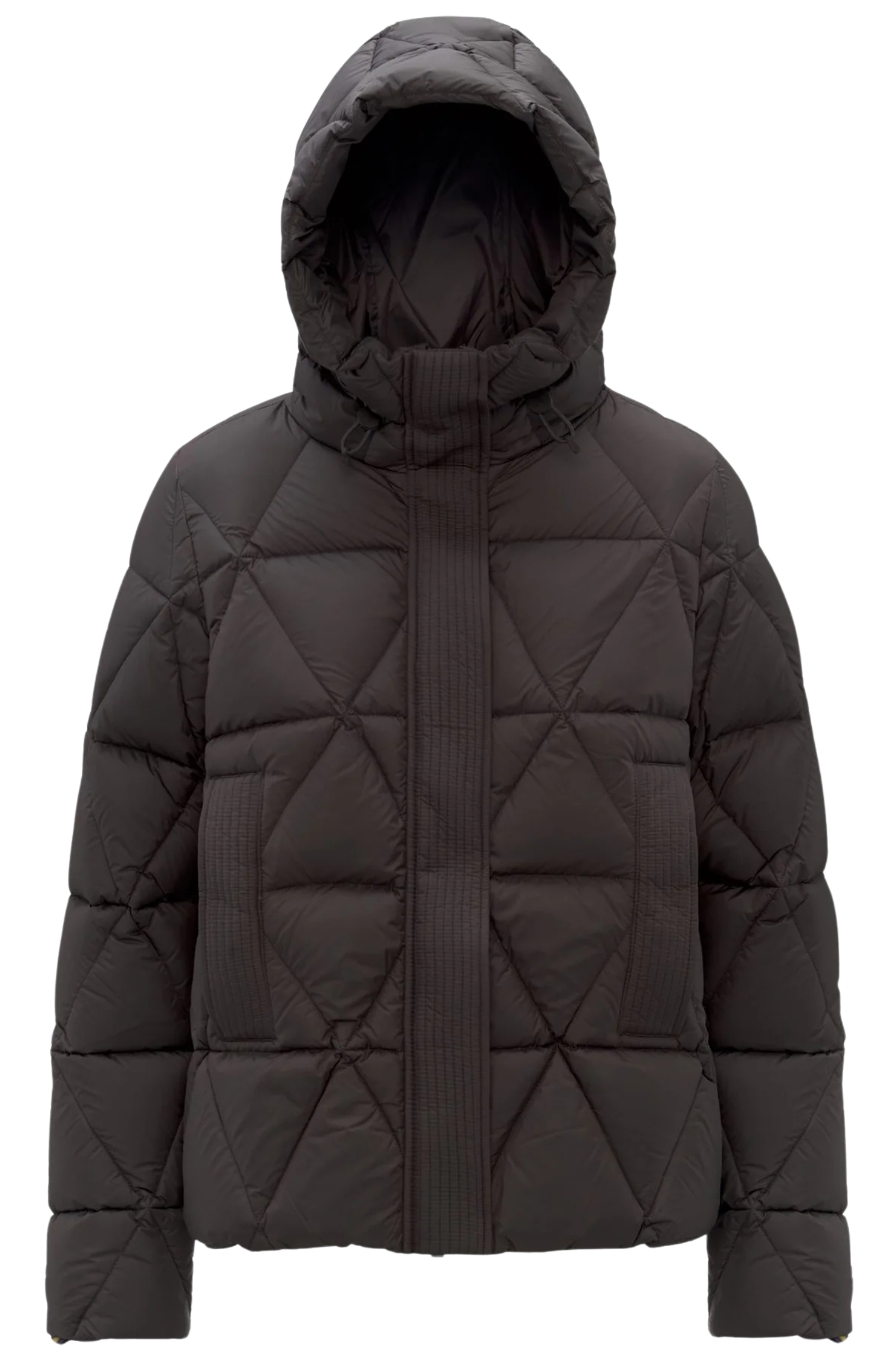 Filled with genuine Molina down, this jacket provides a high warmth level while remaining lightweight and comfortable. The design includes a wraparound hood, a high adjustable collar and a front zip covered by a quilted flap, echoed in the pockets equipped with snap buttons.