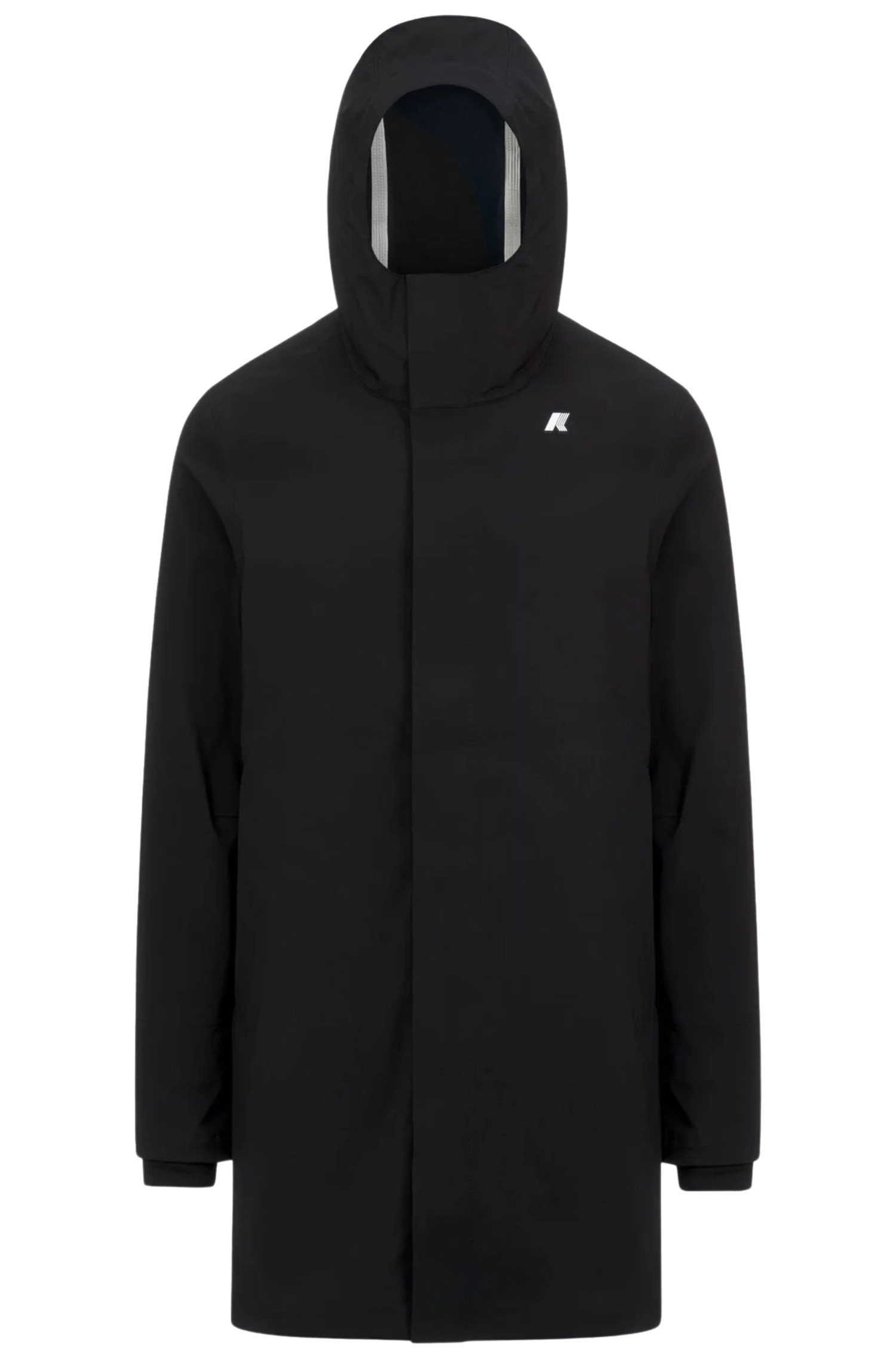 The K-Way Thomas Bonded in black and deep blue is a mens long waterproof jacket designed for maximum protection and comfort in any weather. Its 3-layer stretch fabric combines a waterproof polyester outer shell, an insulating inner membrane, and a micro polar fleece lining that feels soft and warm against the skin.