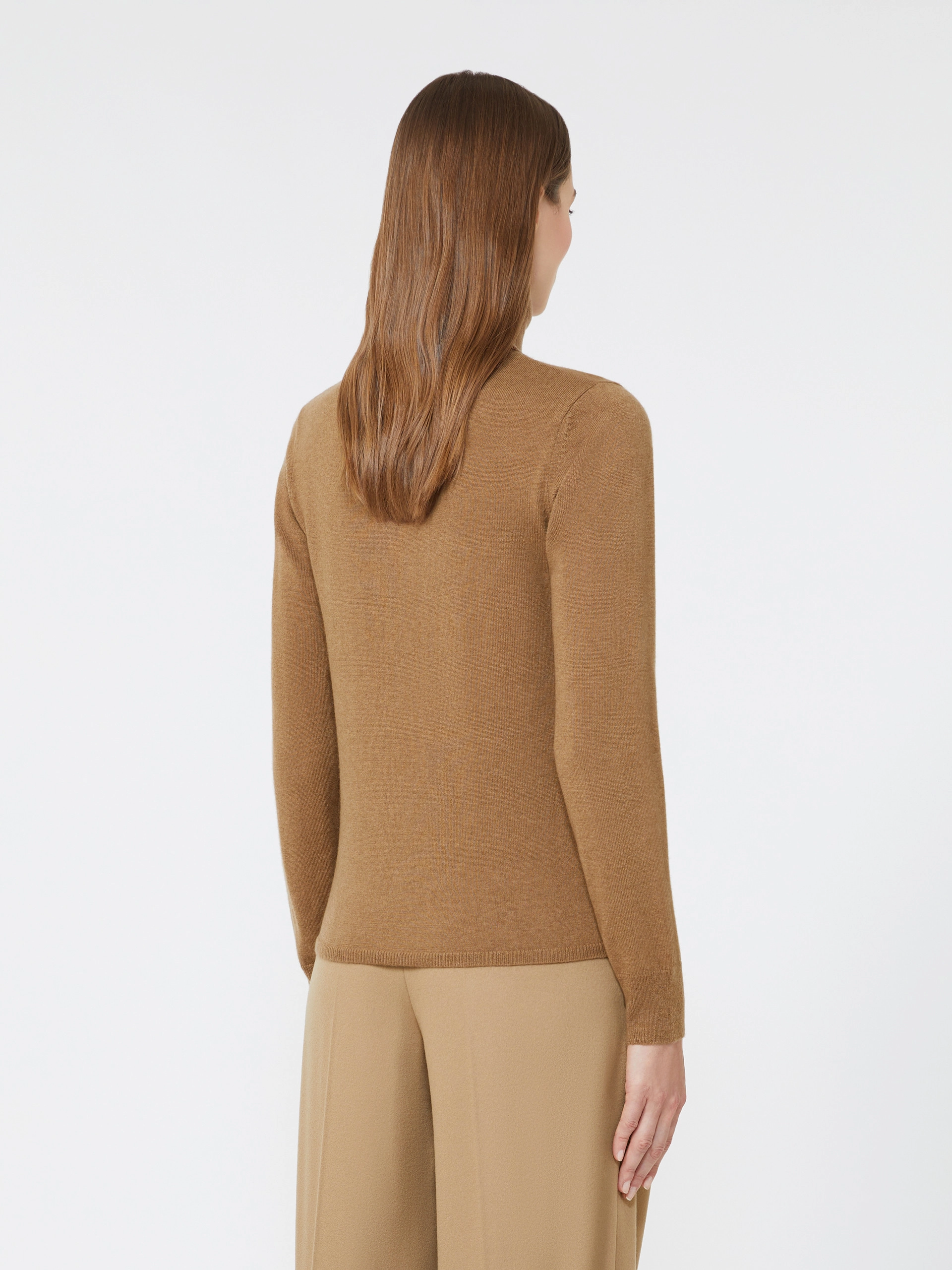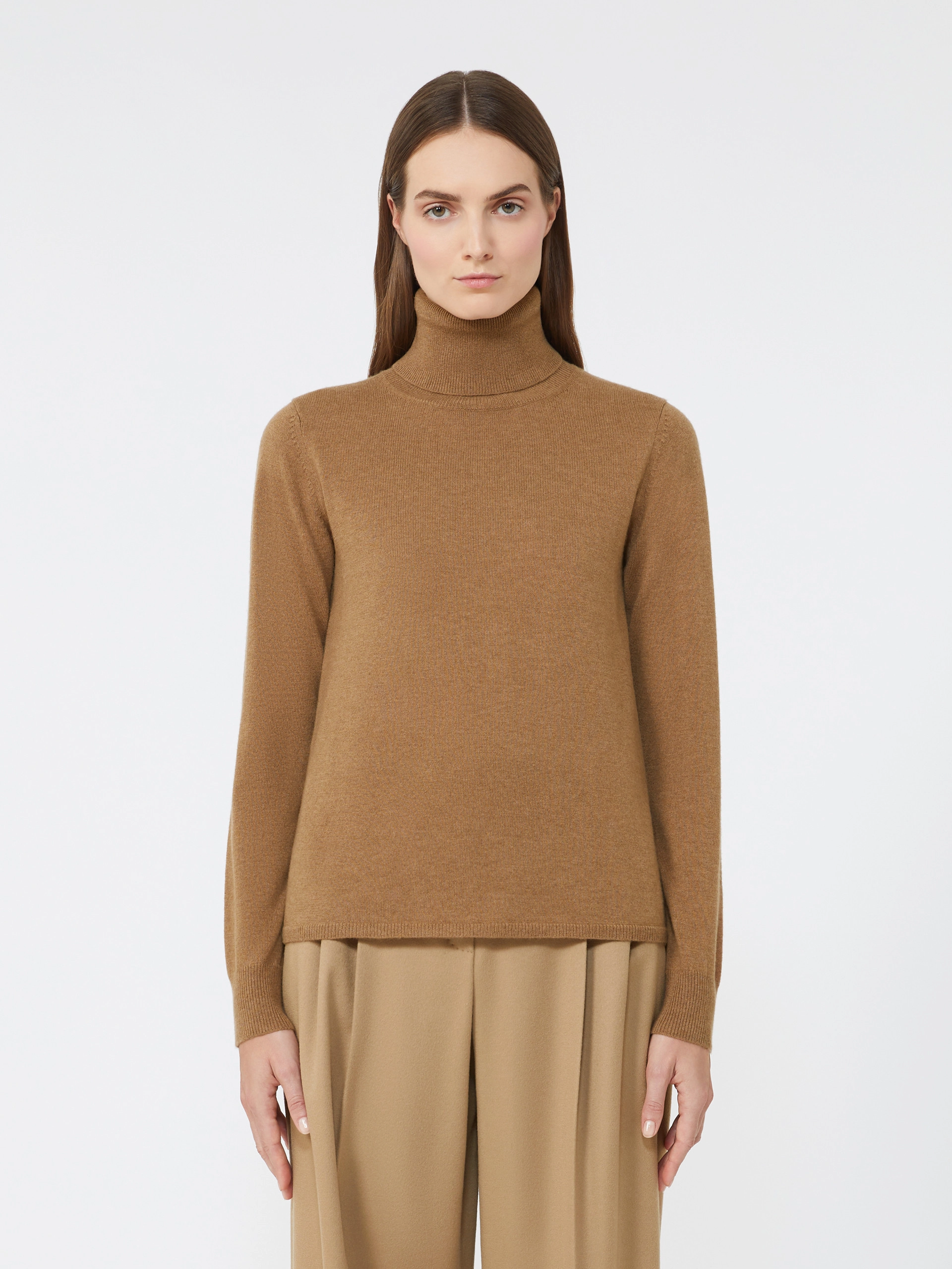 Knitted from a luxurious blend of wool and cashmere, it offers softness, warmth, and a lightweight feel. The ribbed fold-over turtleneck adds a sophisticated touch, while the regular fit and straight hem create a clean, versatile silhouette. Finished with ribbed cuffs and hem, this piece transitions effortlessly from day to evening, perfect for layering or wearing on its own. A wardrobe staple that showcases Max Maras impeccable craftsmanship and timeless Italian style.