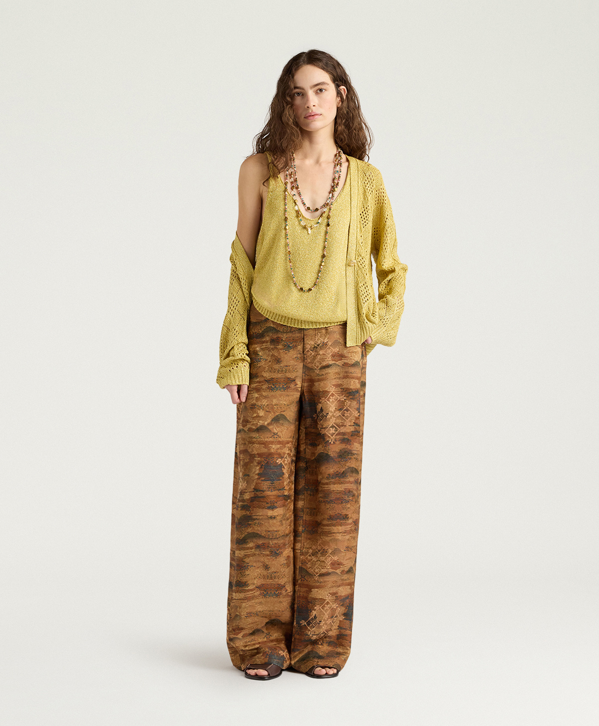 Crafted in 80% viscose, 20% metallic fiber, features special smooth knit (stockinette stitch) with tape yarn creating smooth, uniform surface. Tape yarn lurex adds discreet sophisticated luminosity, elegant flat texture (flat stitch), metallic reflections in sunflower color, and viscose softness with shimmer touch.