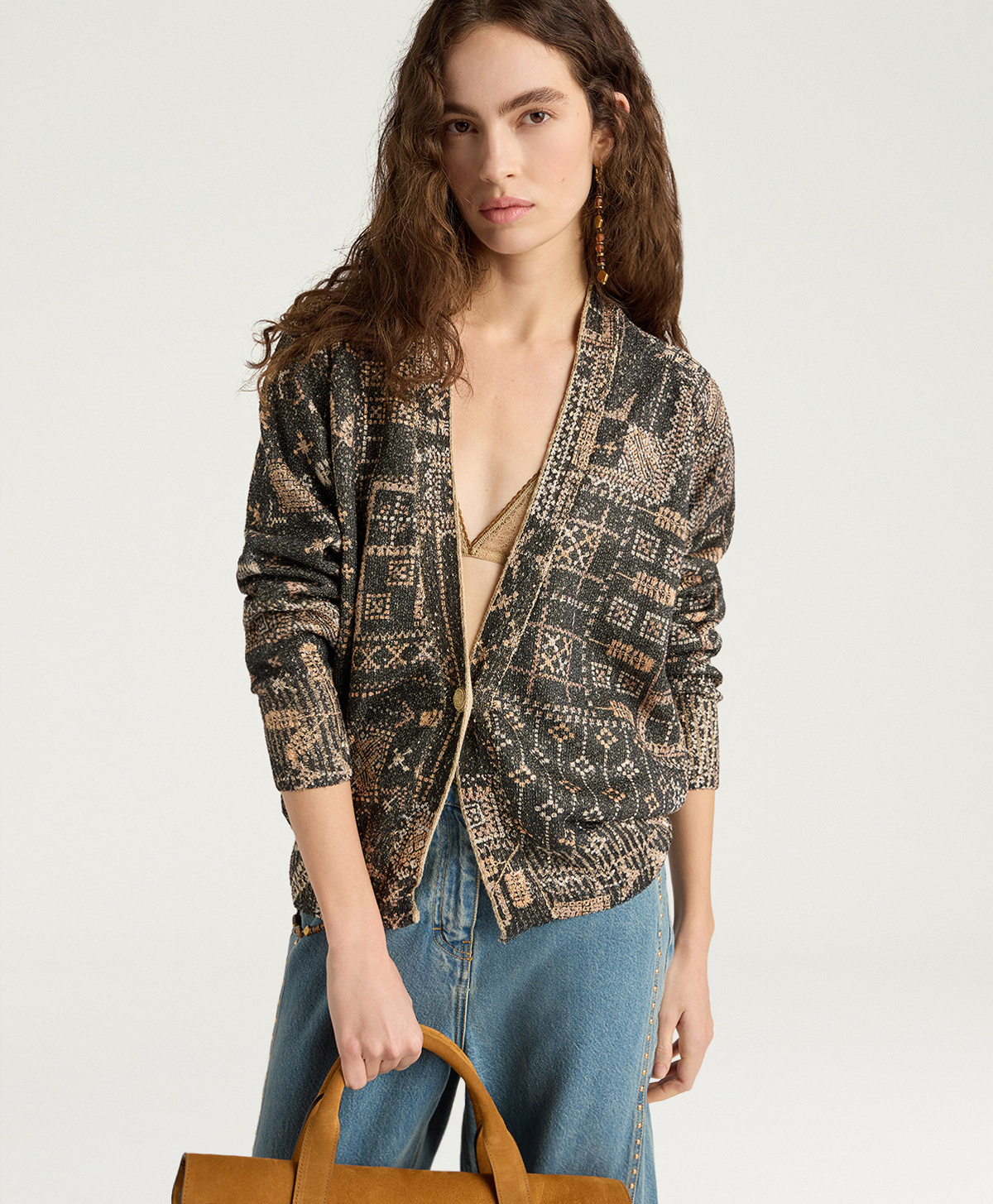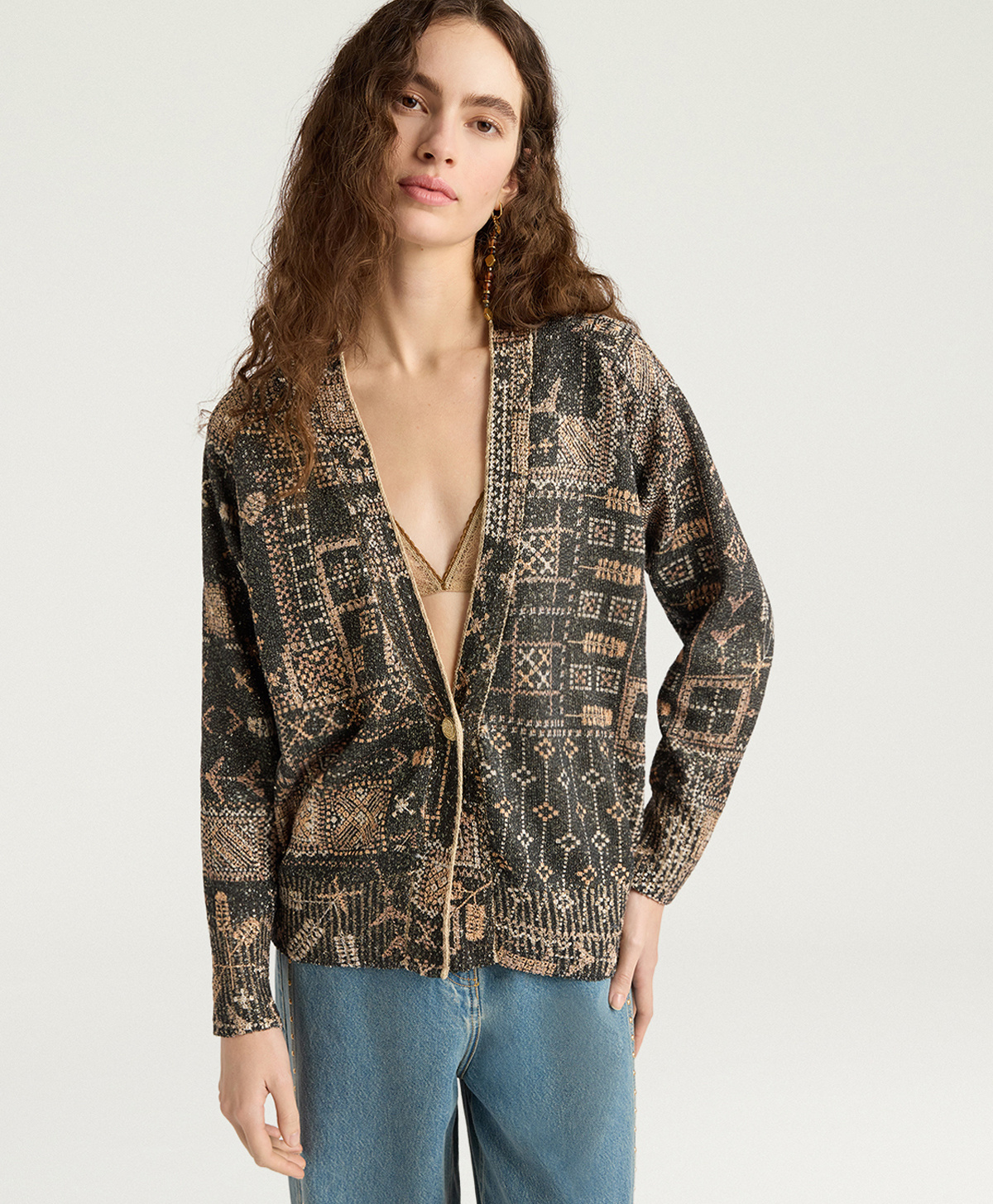 Placket closure features jewel chain buttons in light gold plating transforming buttoning into precious detail. Decorative buttons with golden metallic chains add distinctive luxury touch, elevating cardigan from decorative piece to statement piece.