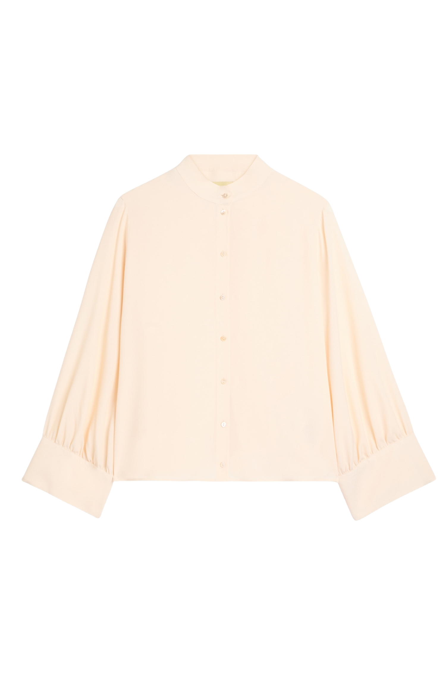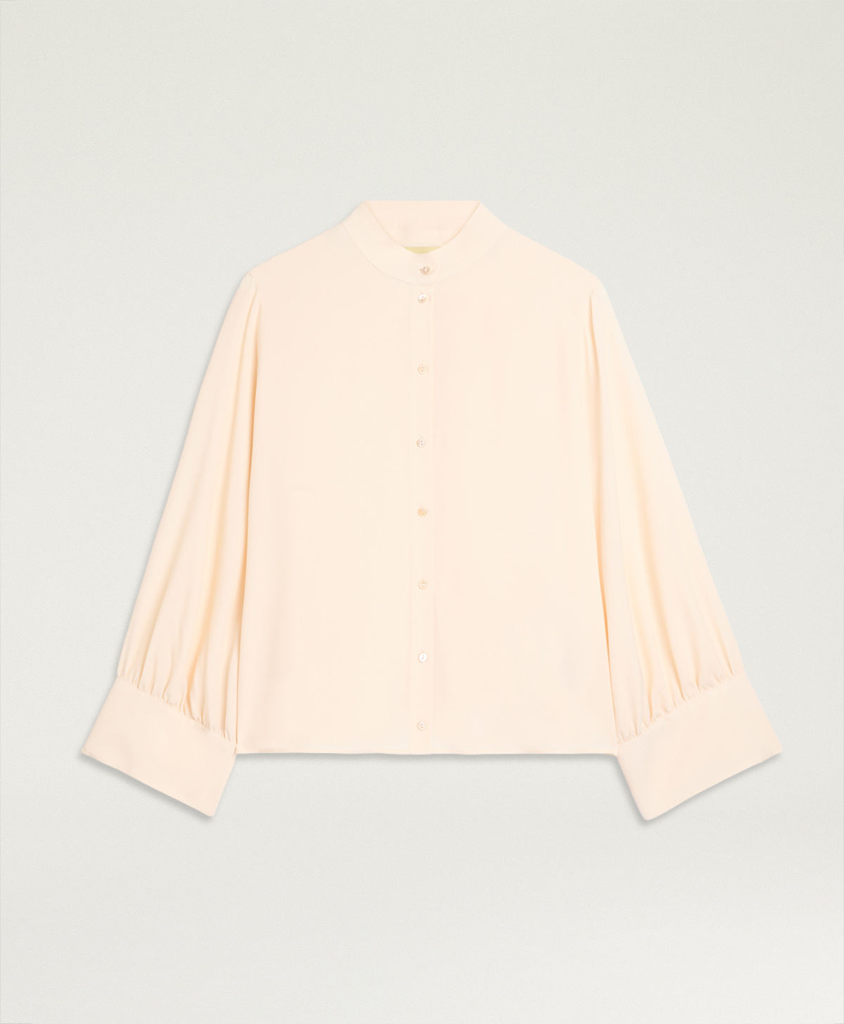 The stand collar (or raised mandarin-style collar) frames the neck with a clean, structured line, adding a touch of tailored rigor that balances the softness of the sleeves. This detail gives the shirt a modern, slightly formal allure, perfect for elevating casual looks or completing more elegant outfits.