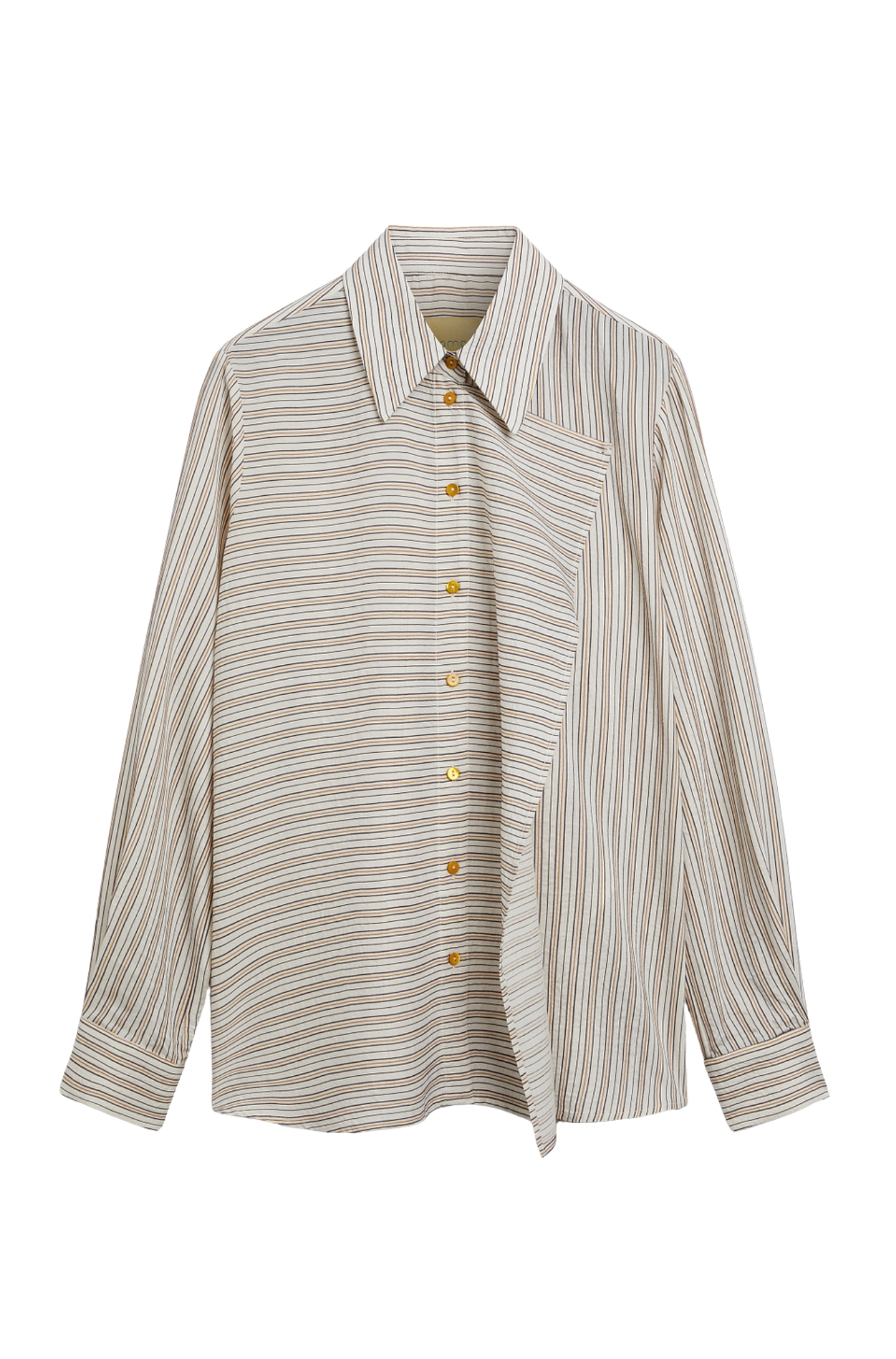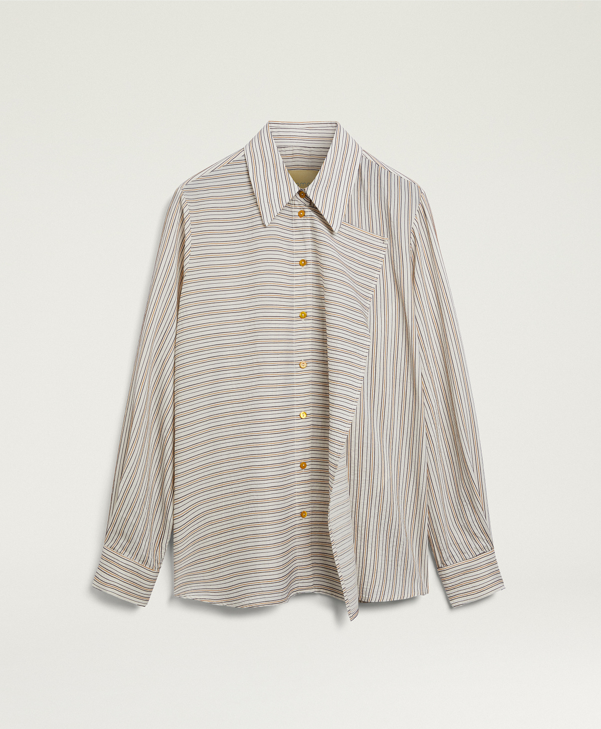 The Momonì Lopez shirt is a piece with sophisticated tailoring character that combines menswear inspiration with distinctive feminine details. Crafted from ribbed jacquard viscose and silk fabric (86% viscose, 14% silk), it features a fine vertical rib texture (bacchetta) that creates a subtle three-dimensional effect, adding visual and tactile depth to the garment. The combination of viscose and silk ensures softness, natural sheen, and a fluid, elegant drape.