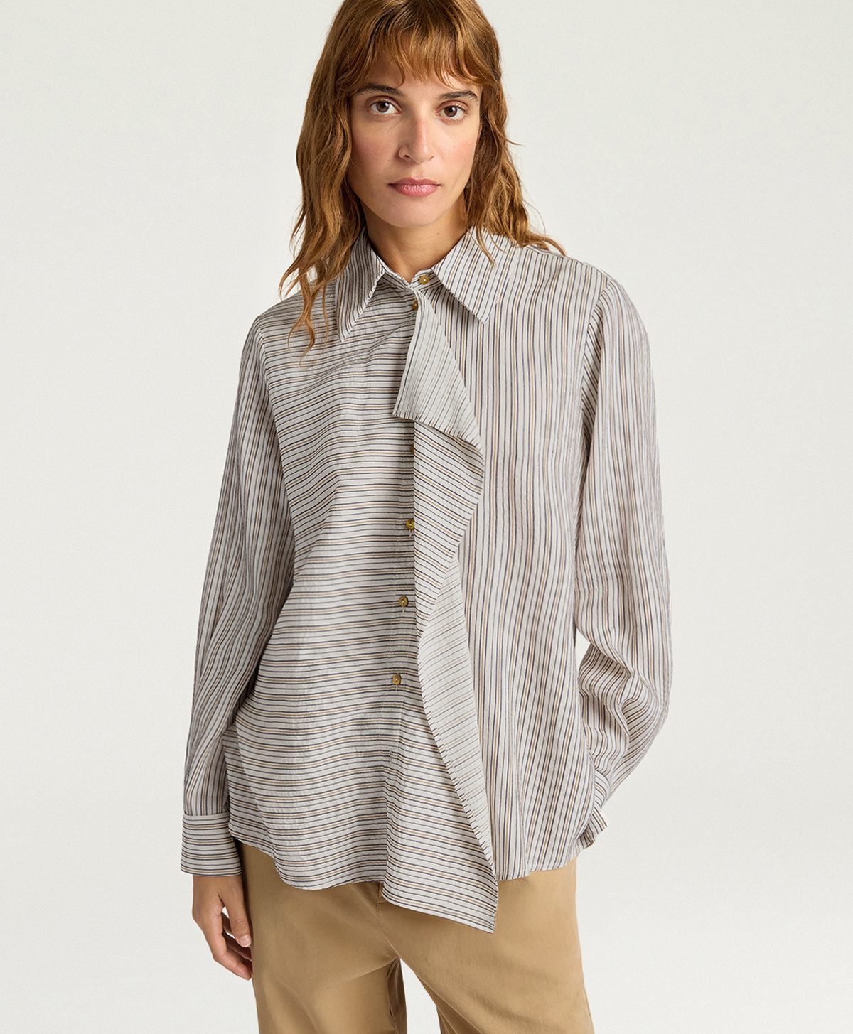 The striking jabot on the placket represents the most feminine and romantic detail of the Lopez: this vertical cascade of ruffles along the front adds volume, theatricality, and a historical reference to aristocratic shirting, reinterpreted in a contemporary key. The jabot transforms a menswear-inspired shirt into a statement piece with perfect balance between rigor and romance.
