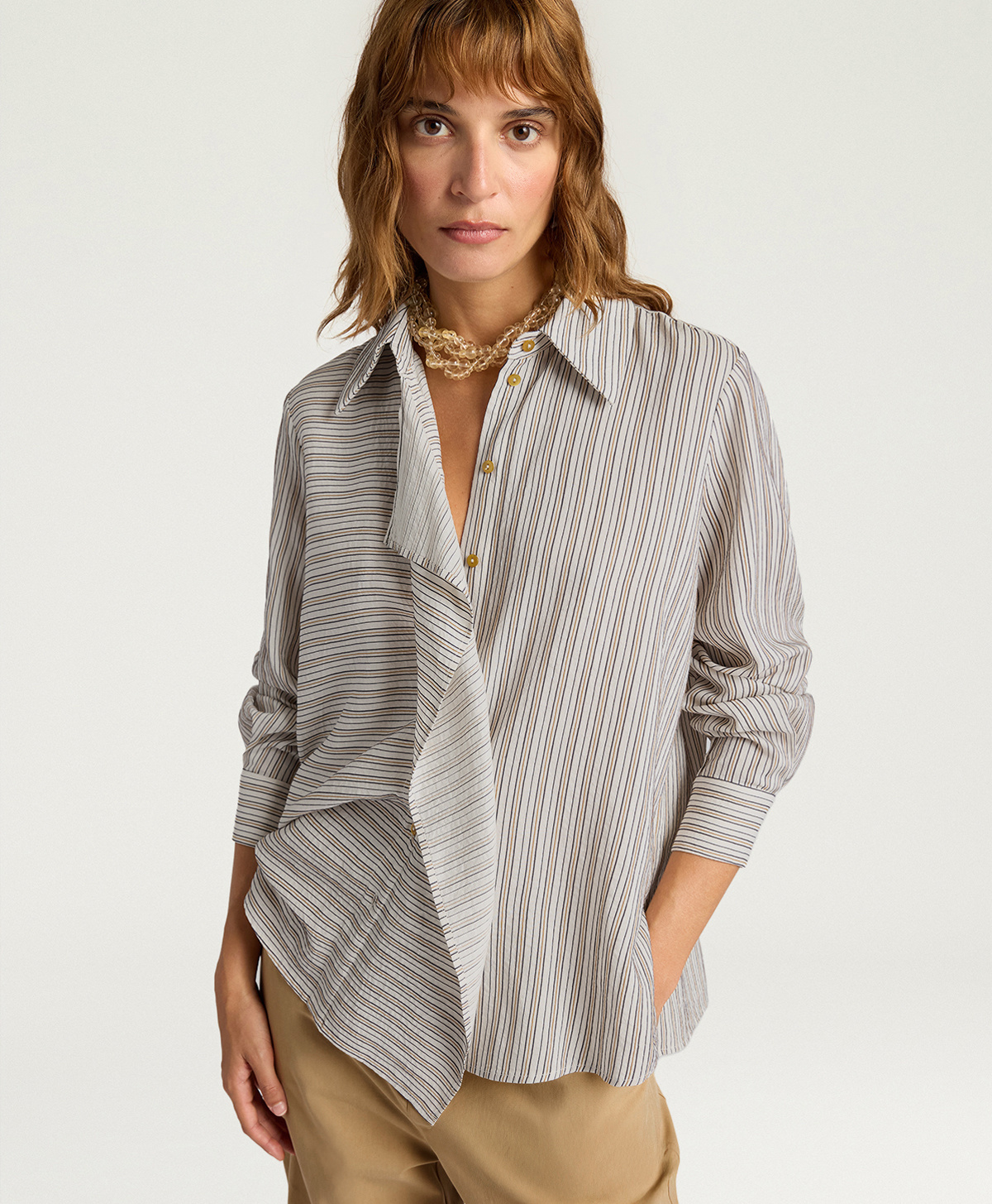 The Lopez Momonì shirt is perfect for those seeking a sophisticated piece capable of uniting seemingly contrasting elements in a harmonious design. Thanks to its rich texture and technical construction, the ribbed fabric makes it ideal for elegant office outfits or formal occasions where you want to stand out with taste. Paired with tailored trousers, pencil skirts, dark denim, or under structured blazers, it becomes the centerpiece of polished, characterful looks.