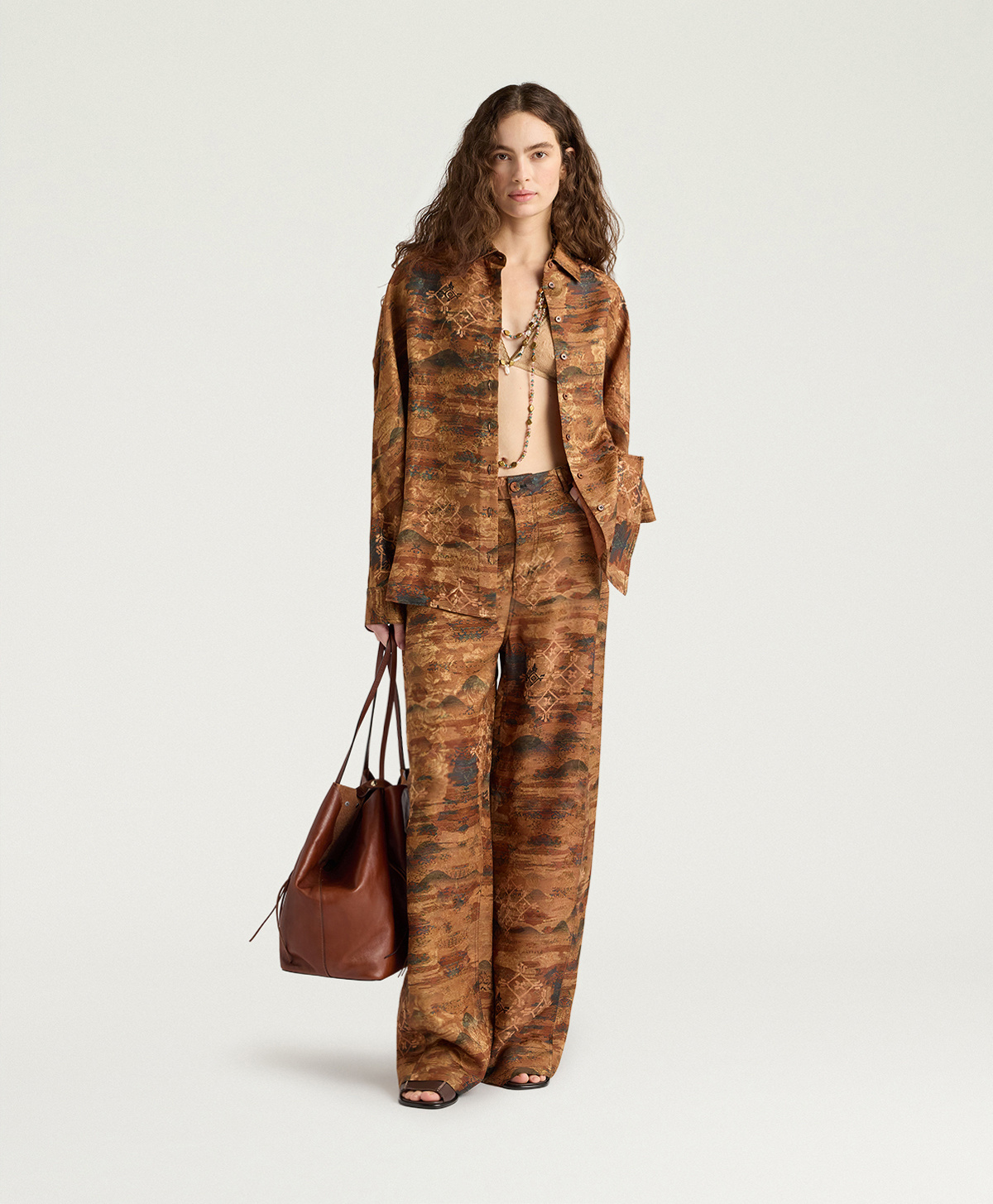 The jacquard fabric adds further richness to the piece thanks to its three-dimensional texture achieved through complex weaving, which creates raised patterns distinguishable by touch. The combination of viscose and silk ensures softness, fluid drape, and natural sheen that enhances the nuances of artisanal dyeing.