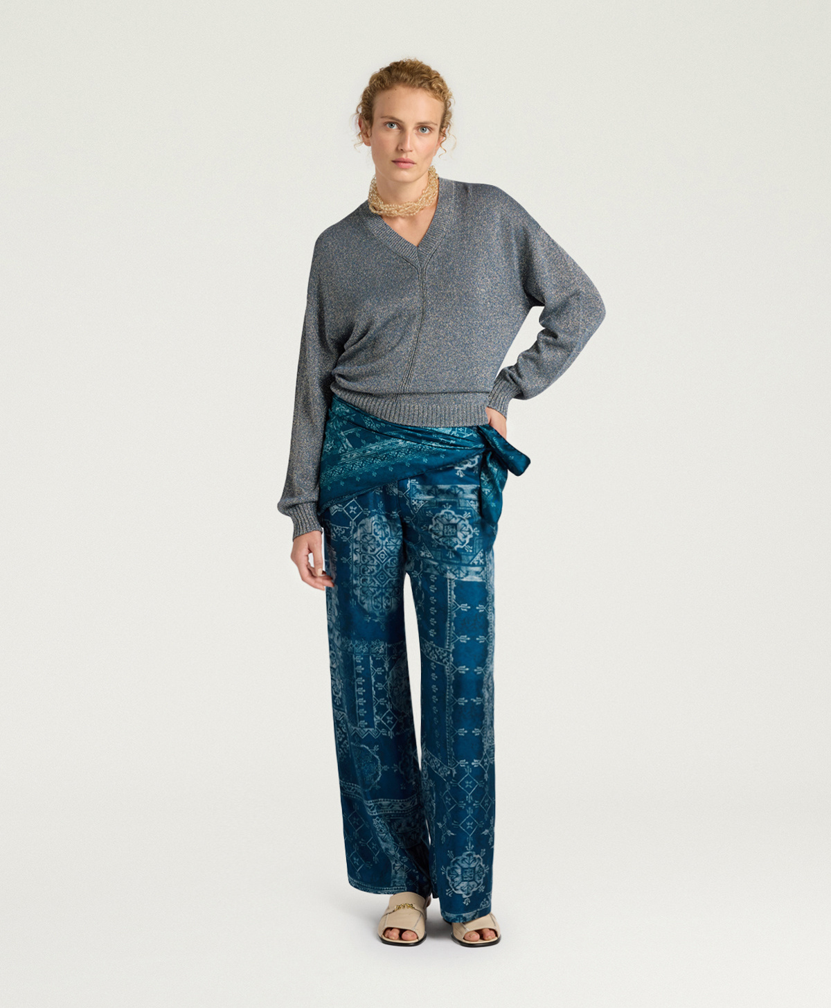 Ortiz Momonì trousers are perfect for those seeking a versatile piece that combines the practicality of the 5-pocket model with the refinement of silk. The printed twill makes them ideal for elegant yet contemporary outfits, from work to leisure. Paired with t-shirts and sneakers for casual-chic looks, or elegant shirts and blazers for more formal outfits, they become a key wardrobe piece that transcends seasons with style and elegance.