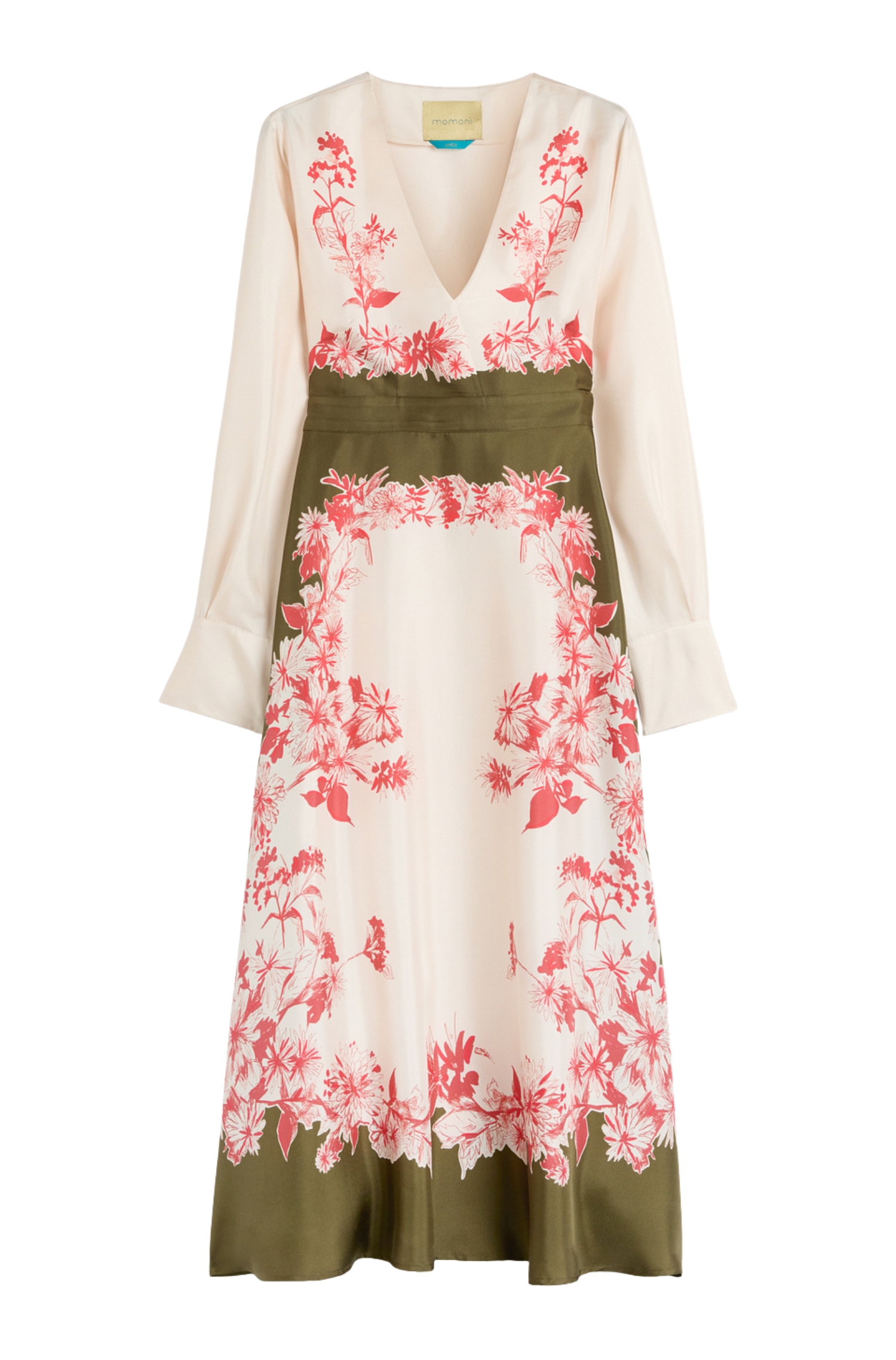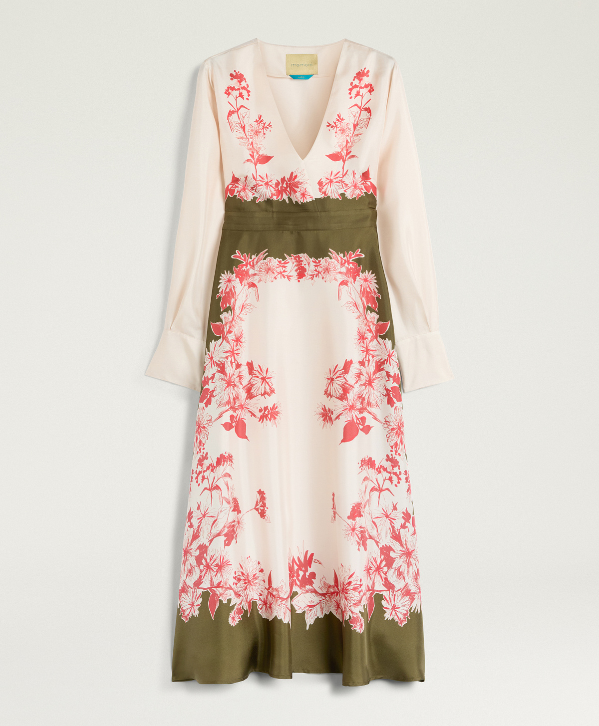 Momonì Pilar dress is an authorial piece celebrating Italian craftsmanship and feminine design through exclusive engineered print on precious silk twill.