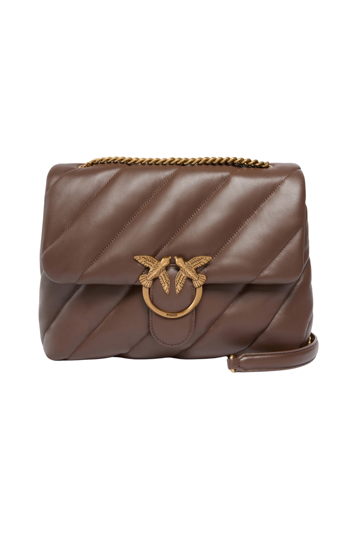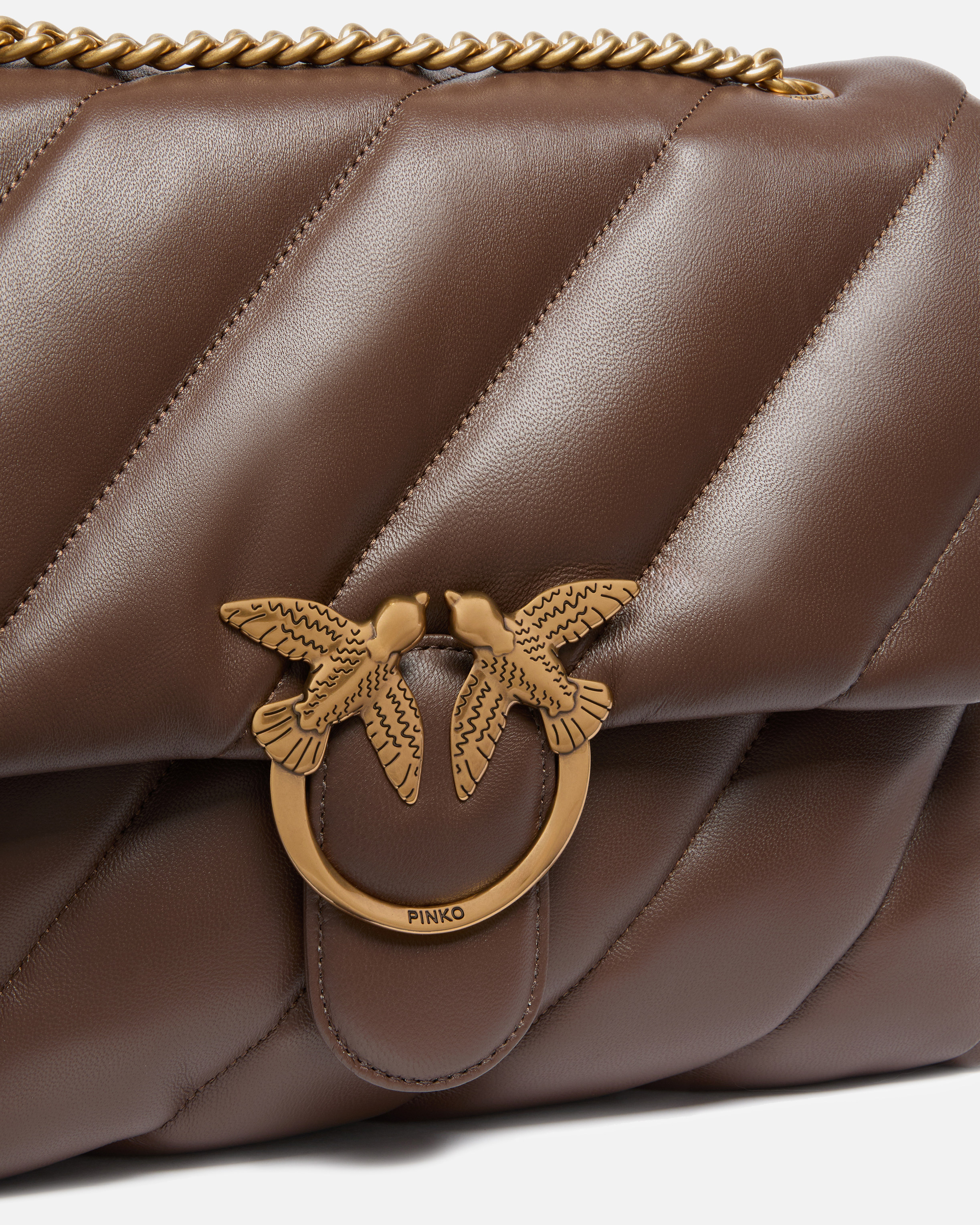 The Big Love Bag Puff Maxi Quilt is crafted from soft nappa leather with an oversized diagonal quilt pattern, creating a rich, padded effect with a contemporary feel. The flap closes with the iconic Love Birds Diamond Cut metal buckle, while the interior is lined in suede-effect microfiber and features a central zipped divider and a wall pocket to keep essentials organized. The shoulder strap combines a classic round metal chain with a practical nappa shoulder insert for comfortable wear on the shoulder or crossbody.?