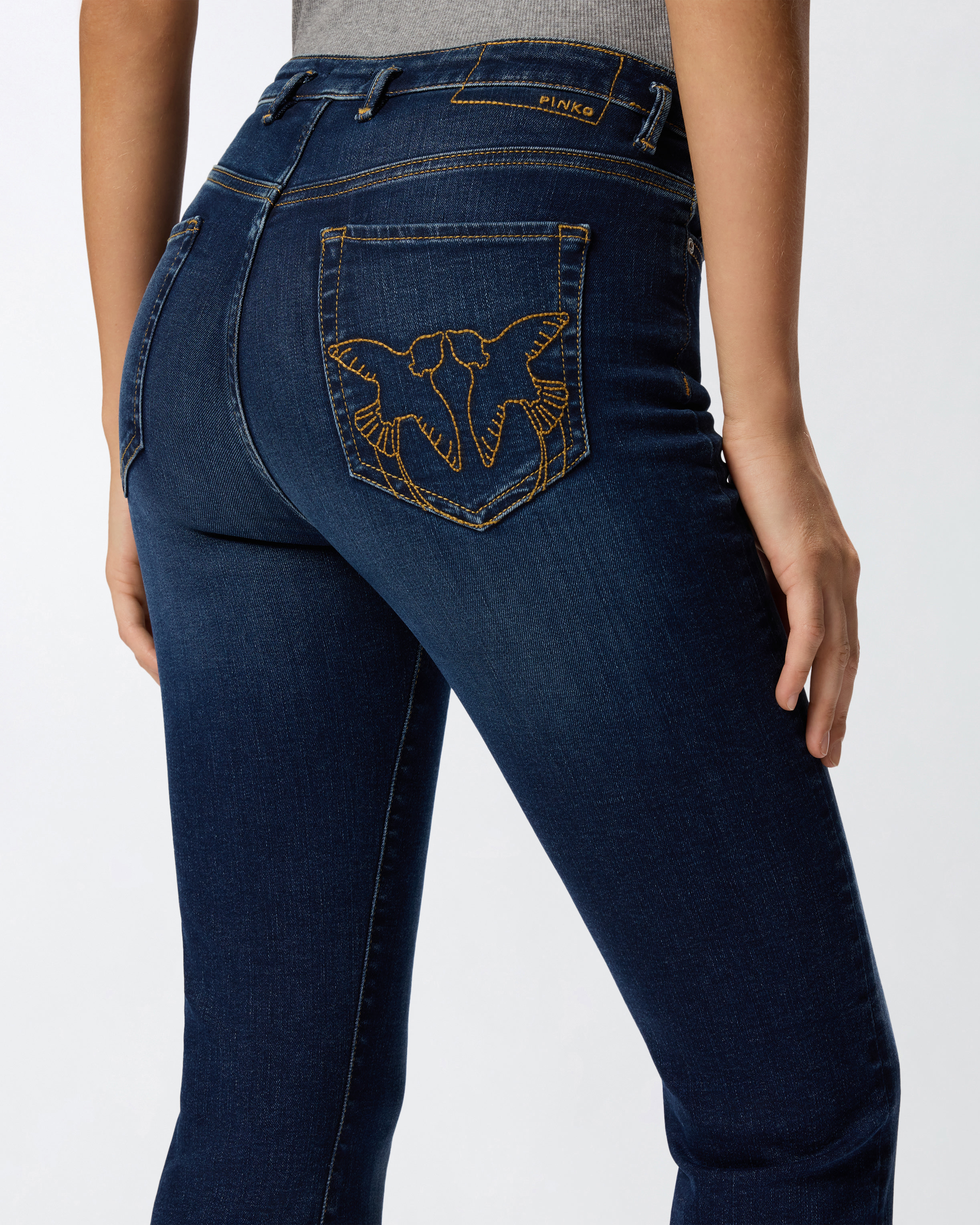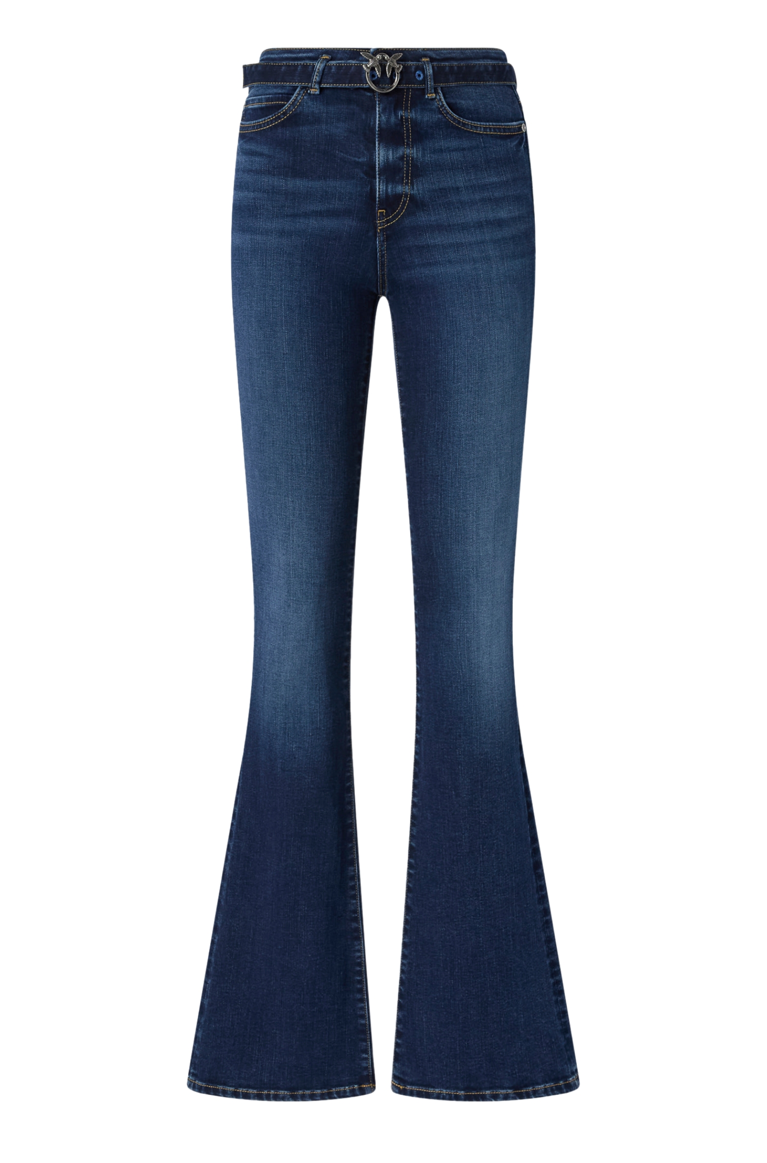 Five-pocket flared-fit jeans with a fitted leg up to the knee and flared hem, crafted from soft hand power stretch denim-blend for great comfort and long-lasting shape. High recovery fabric ensures durability. Pinko brand lettering embroidered on the back waistband, Love Birds logo on the right rear pocket. Includes matching denim belt with Love Birds Diamond Cut metal buckle. Mid-rise waist, zip and button closure.