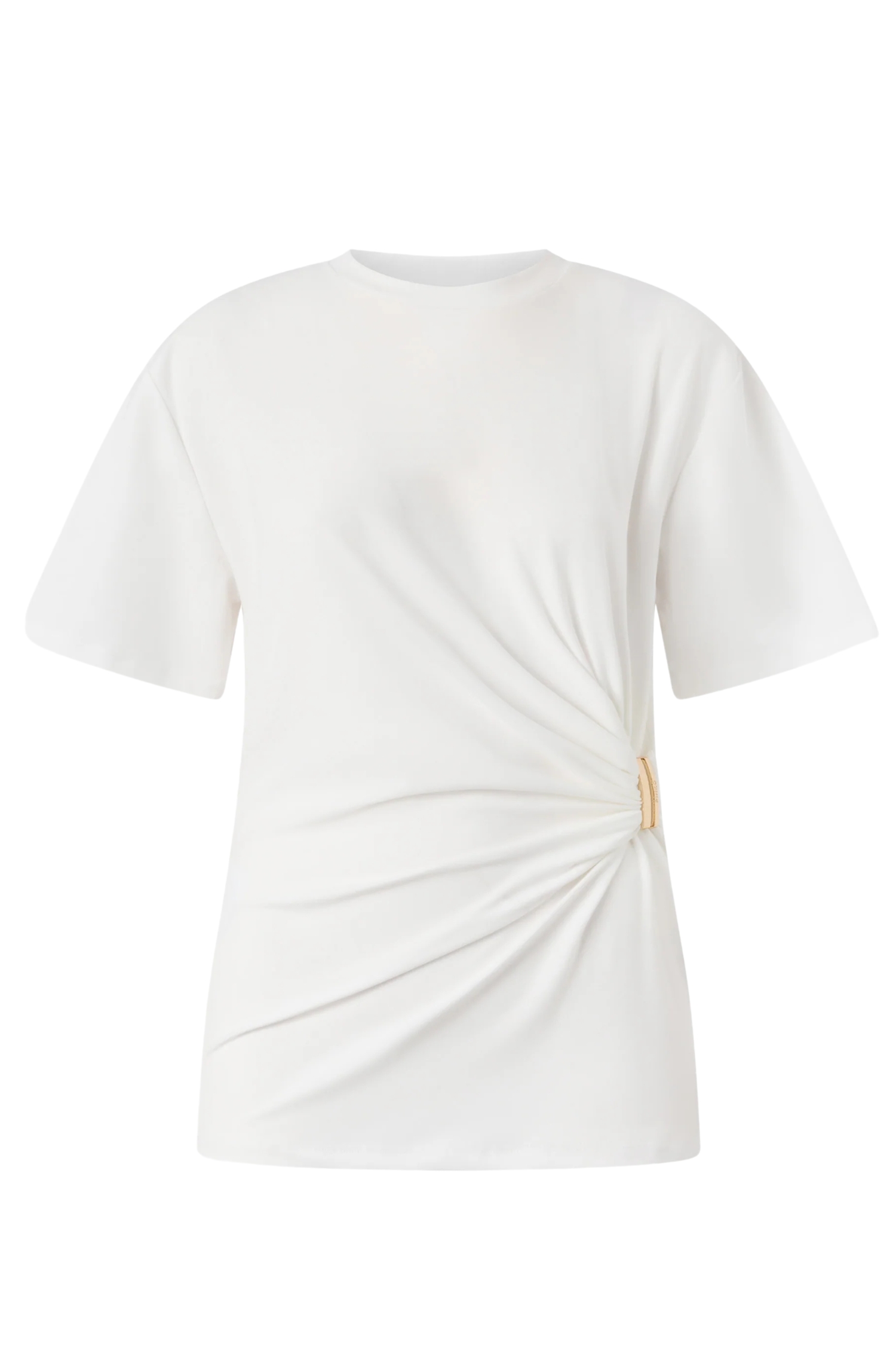 A simple crew neck and short sleeves keep the design clean and easy to style, while the gold-tone detail placed at the waist draws the eye and gathers the fabric into a flattering drape across the front. This creates a lengthening effect on the silhouette and immediately dresses up even the most casual combinations.