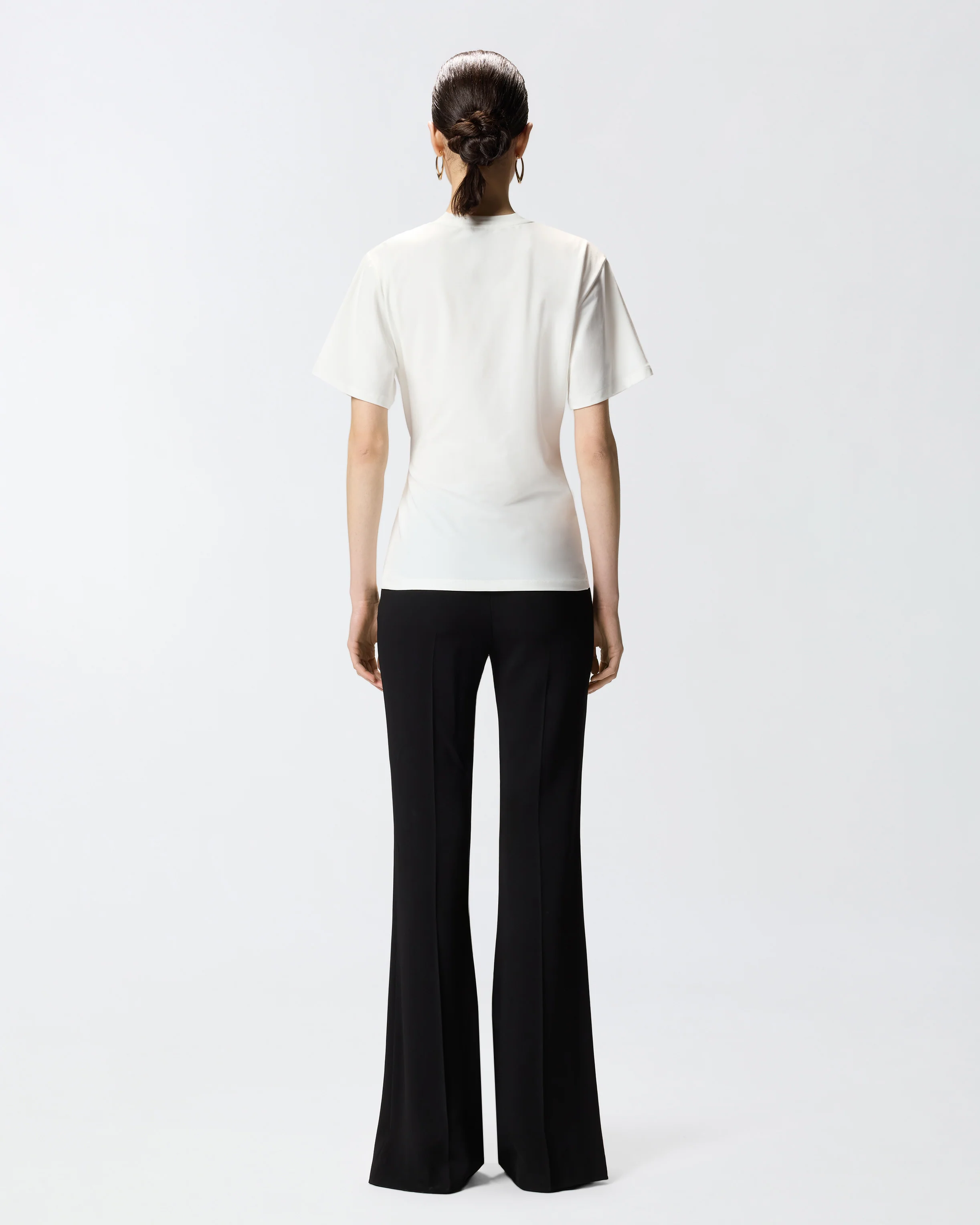 The t-shirt with draping and gold detail reimagines an everyday basic with a refined, feminine twist while preserving the ease of a classic tee. Supima stretch cotton interlock (85% cotton, 15% elastane) provides comfortable stretch, a dense hand and a polished surface that enhances the colour.
