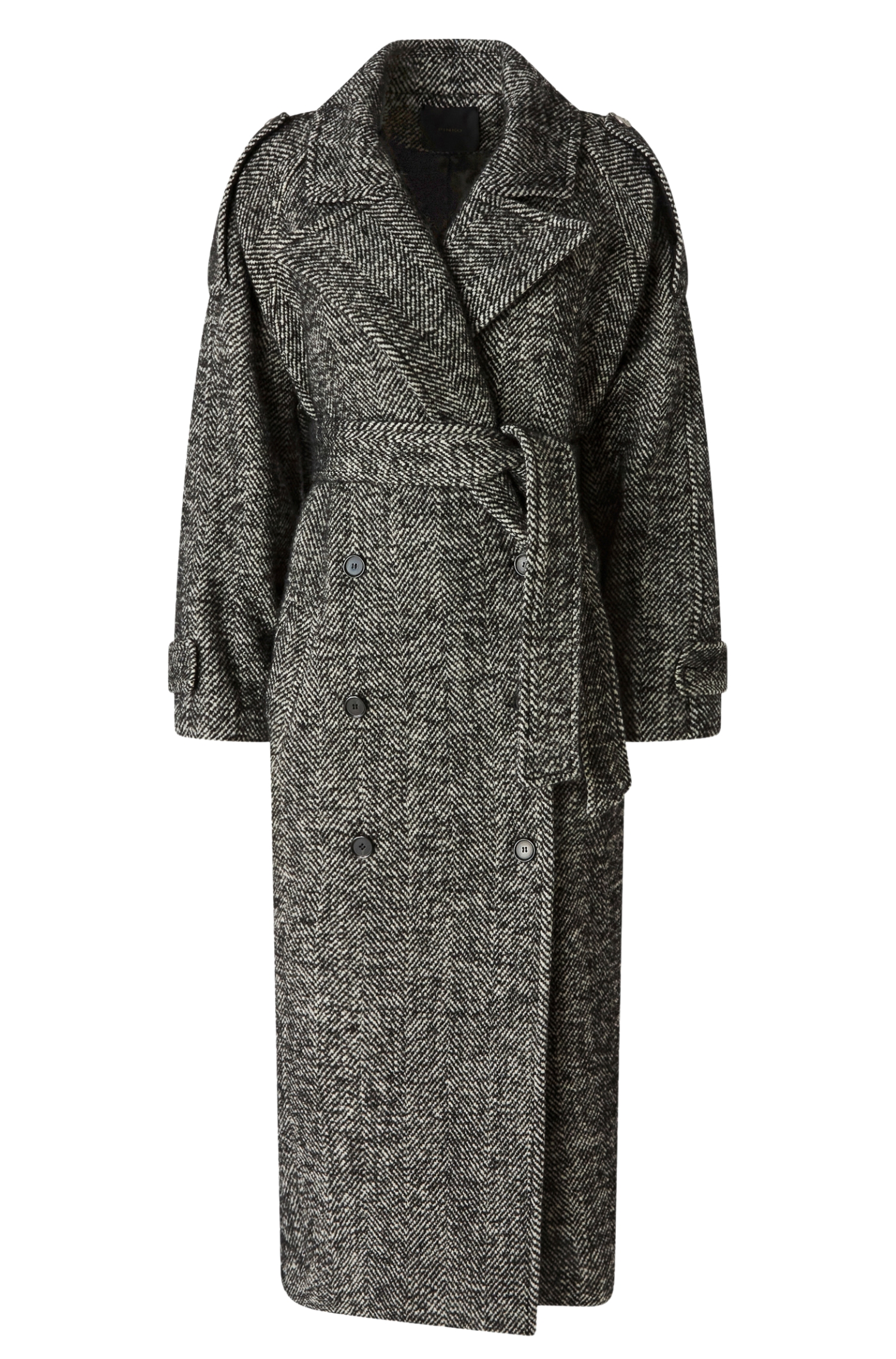 Ankle-length women's coat with a robe design, double-breasted closure, lapel collar and long sleeves completed with a strap. The garment is made of warm wool-blend cloth, obtained from regenerated yarns that give the structure a wavy, irregular look, and is customized with a fine herringbone pattern. Matching belt in the same fabric to be knotted at the waist. Lined pattern.