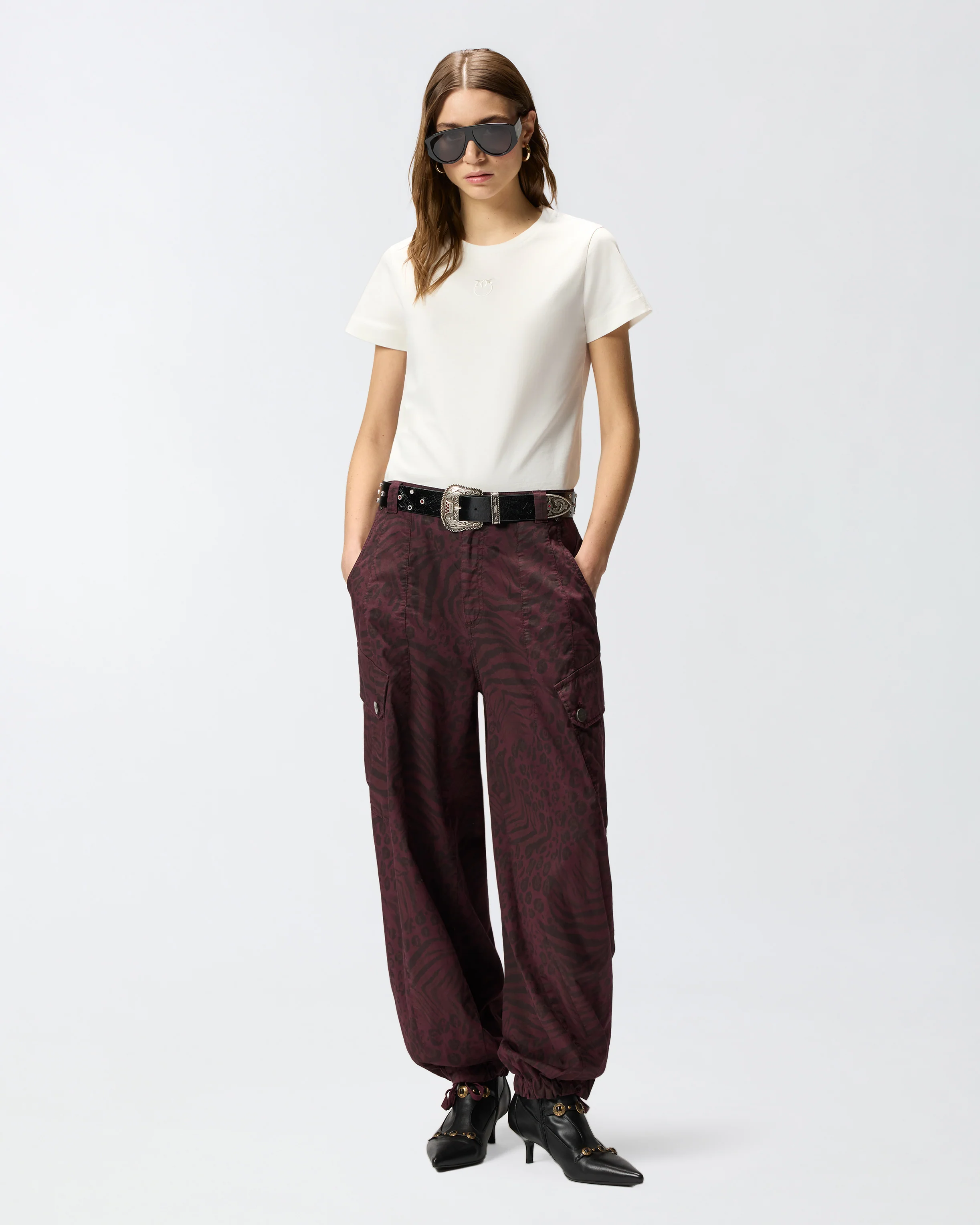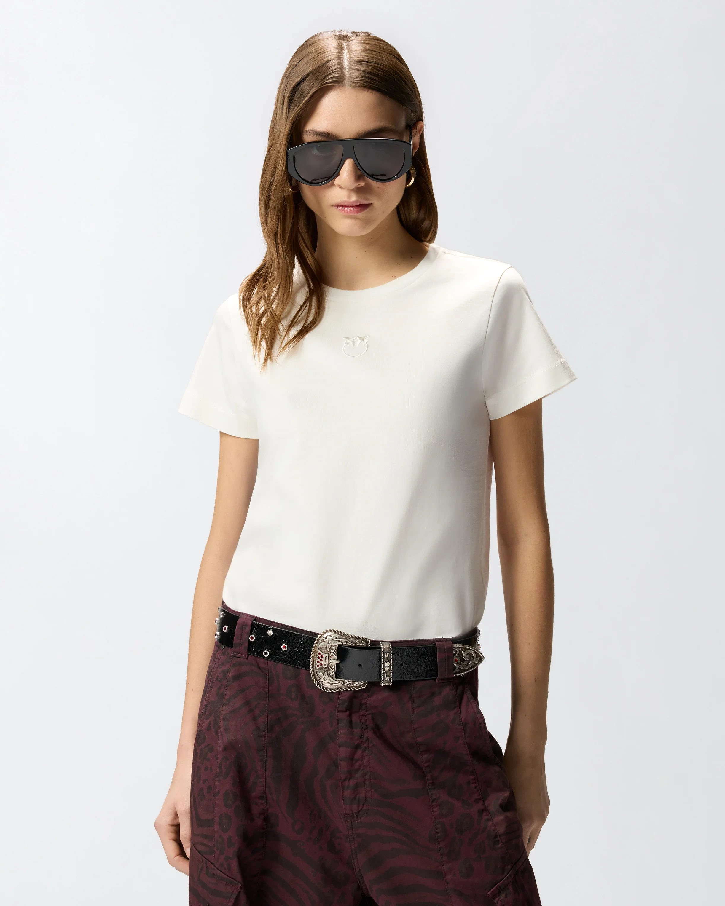 A classic crew neck, short sleeves and a regular fit give it a clean, modern look that flatters the figure without feeling tight, whether worn tucked in or left loose over the waistband. The tone-on-tone embroidered Love Birds logo on the chest adds a subtle yet distinctive touch, instantly recognisable for Pinko lovers.