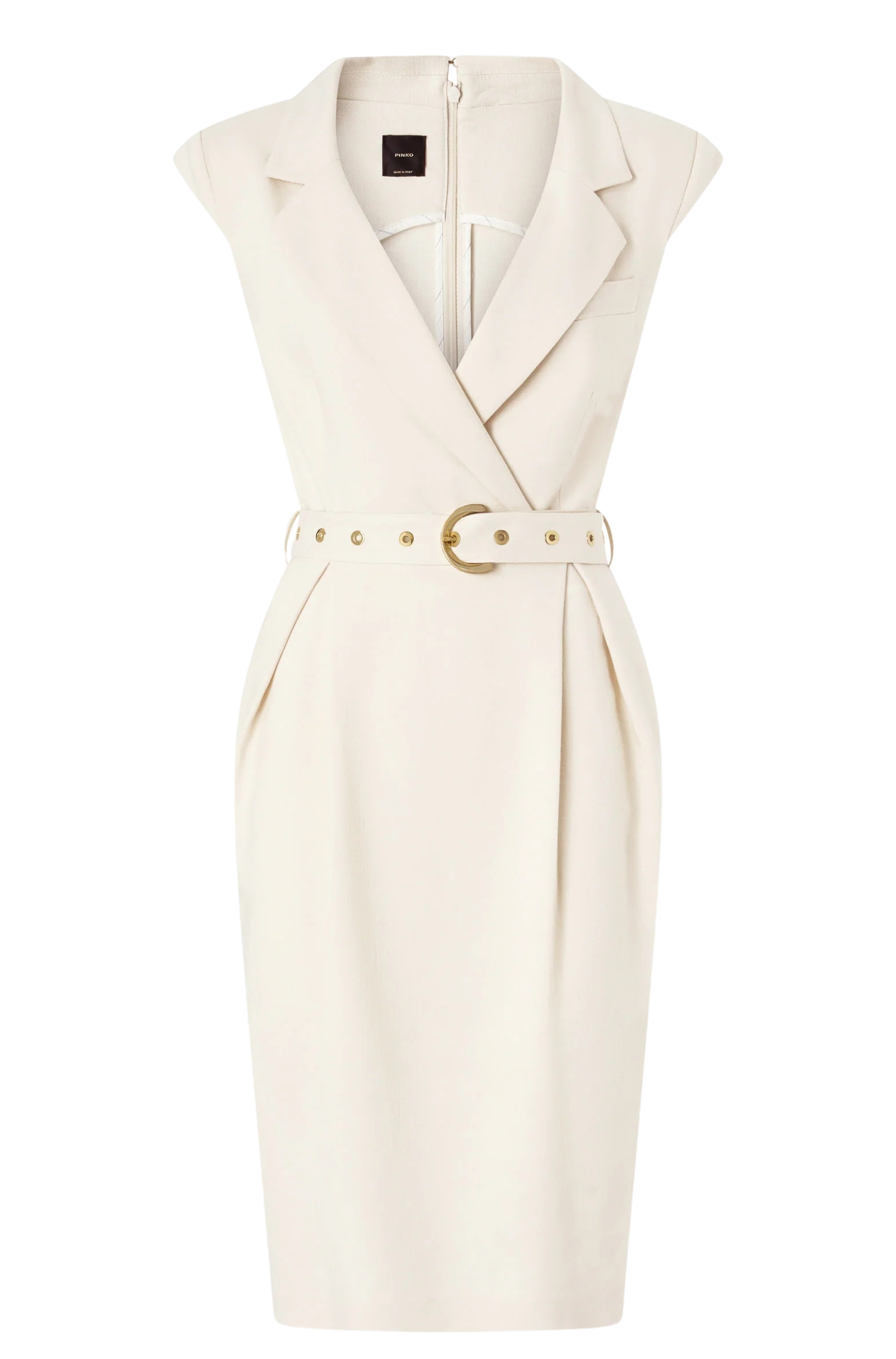 Cut in a body-skimming pencil shape, the dress features a wrap-inspired front with elegant pleats that enhance the waist and add movement to the skirt. A deep V-neckline with jacket-style lapels brings a tailored touch, complemented by a small faux pocket on the chest for extra refinement.