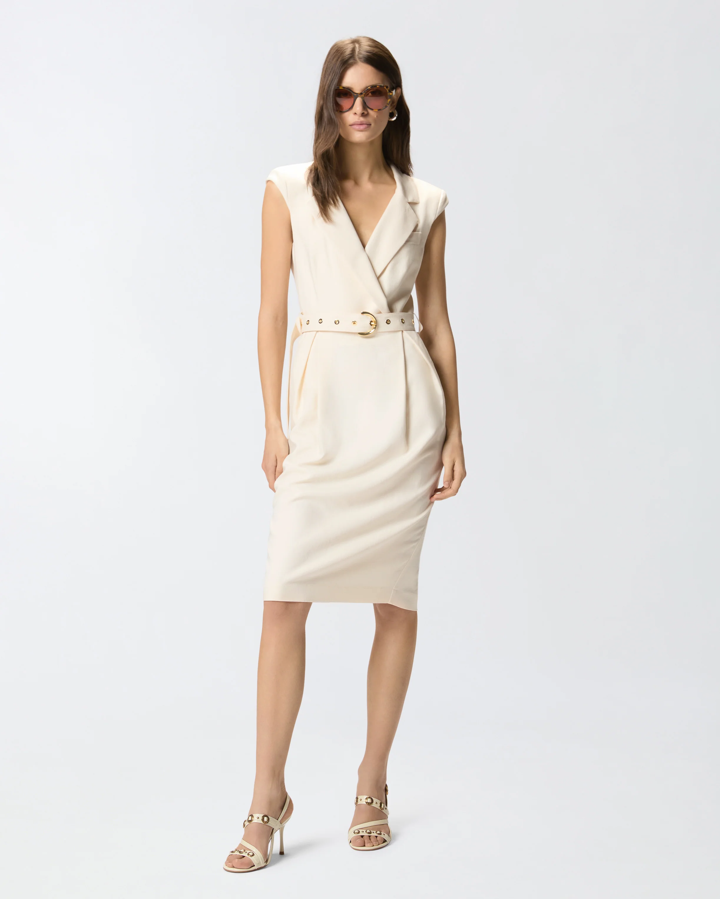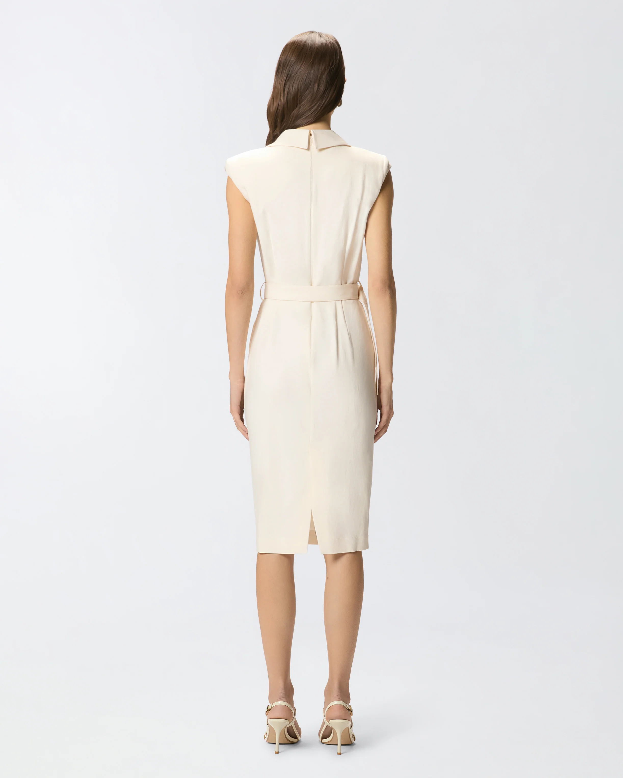 At the back, an invisible zip keeps the lines sleek while making the dress easy to put on, and a centre-back slit ensures ease of stride and a subtly feminine finish. The removable belt at the waist, detailed with a gold-tone buckle and eyelets, allows you to cinch the silhouette or switch it out for other belts to vary the styling.