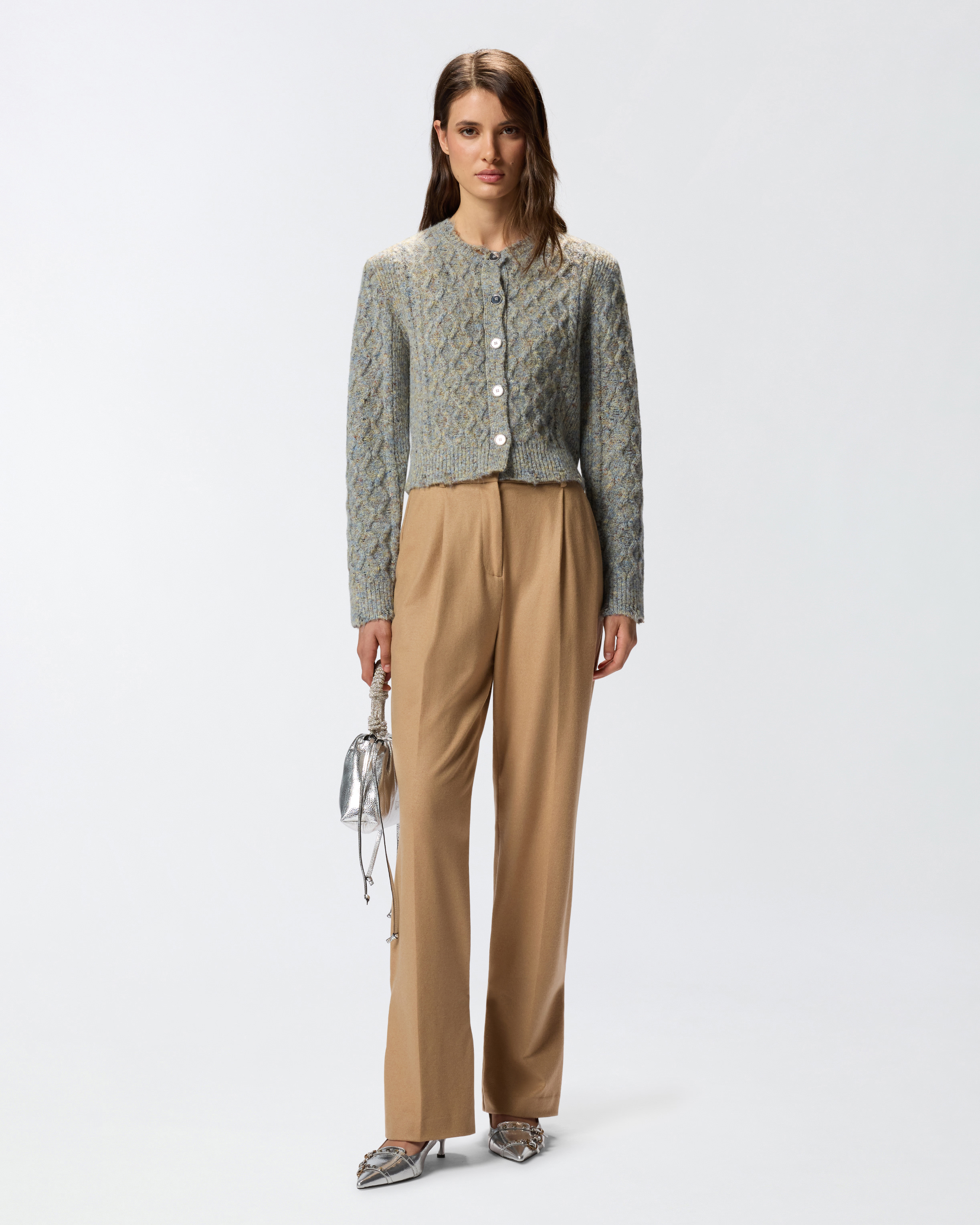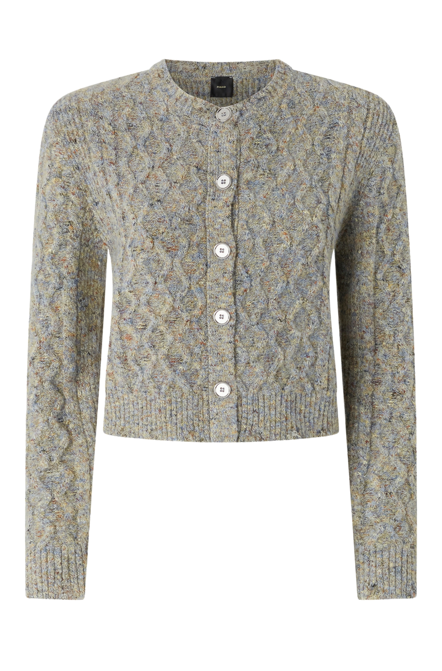 Long-sleeved crew-neck cardigan knitted with yarns of different colors, featuring a ribbed knit on the back and braid stitch on the front and sleeves that gives movement and three-dimensionality to the design. The front features a classic button closure, while the tone-on-tone PINKO lettering logo label on the back completes the accessory with a personalized touch. The garment has undergone finishing tests to minimize possible pilling, ensuring greater softness and durability of the fabric.
