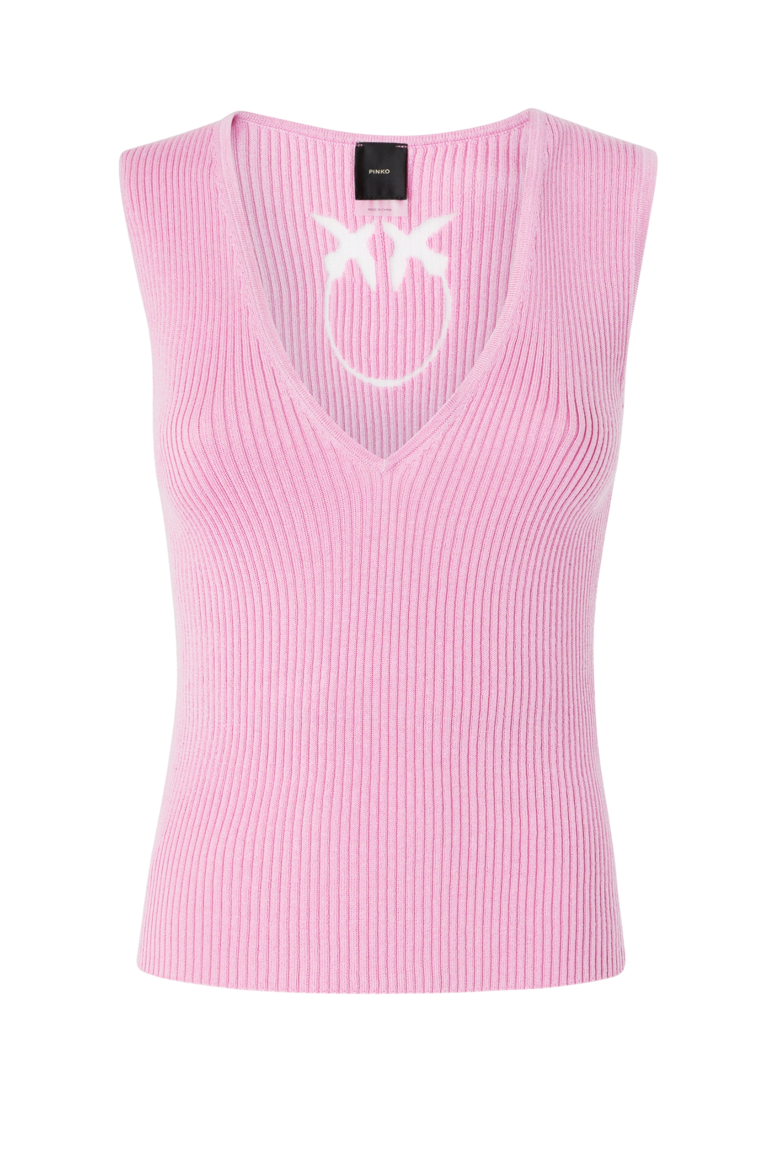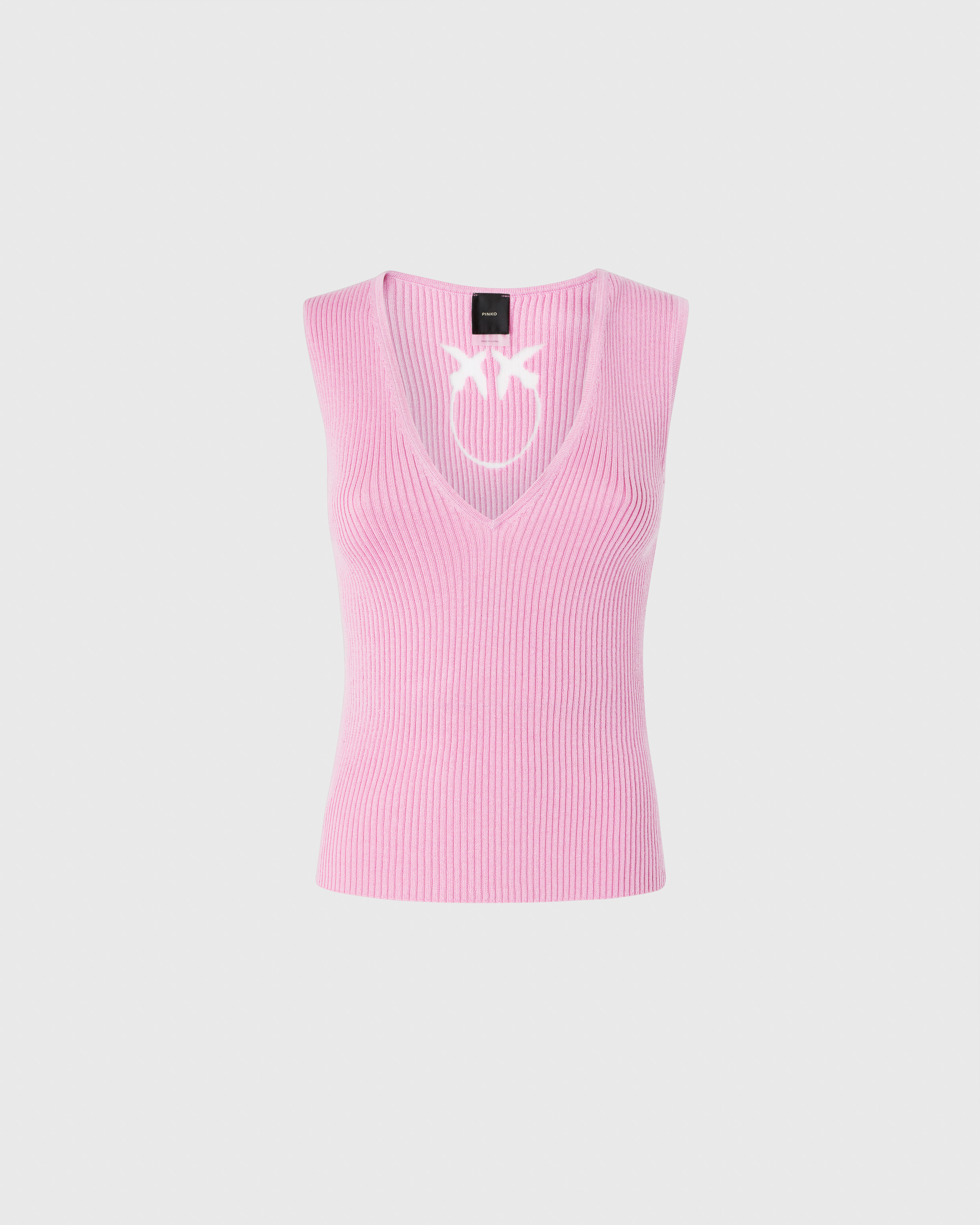 Fitted sleeveless daytime top in precious ribbed cotton-silk knit, made even more special by Love Birds logo insert made transparent in the center back. The fitted, V-neck front silhouette makes this sleeveless knit the perfect spring undergarment to wear with the season's bomber jackets and blazers.