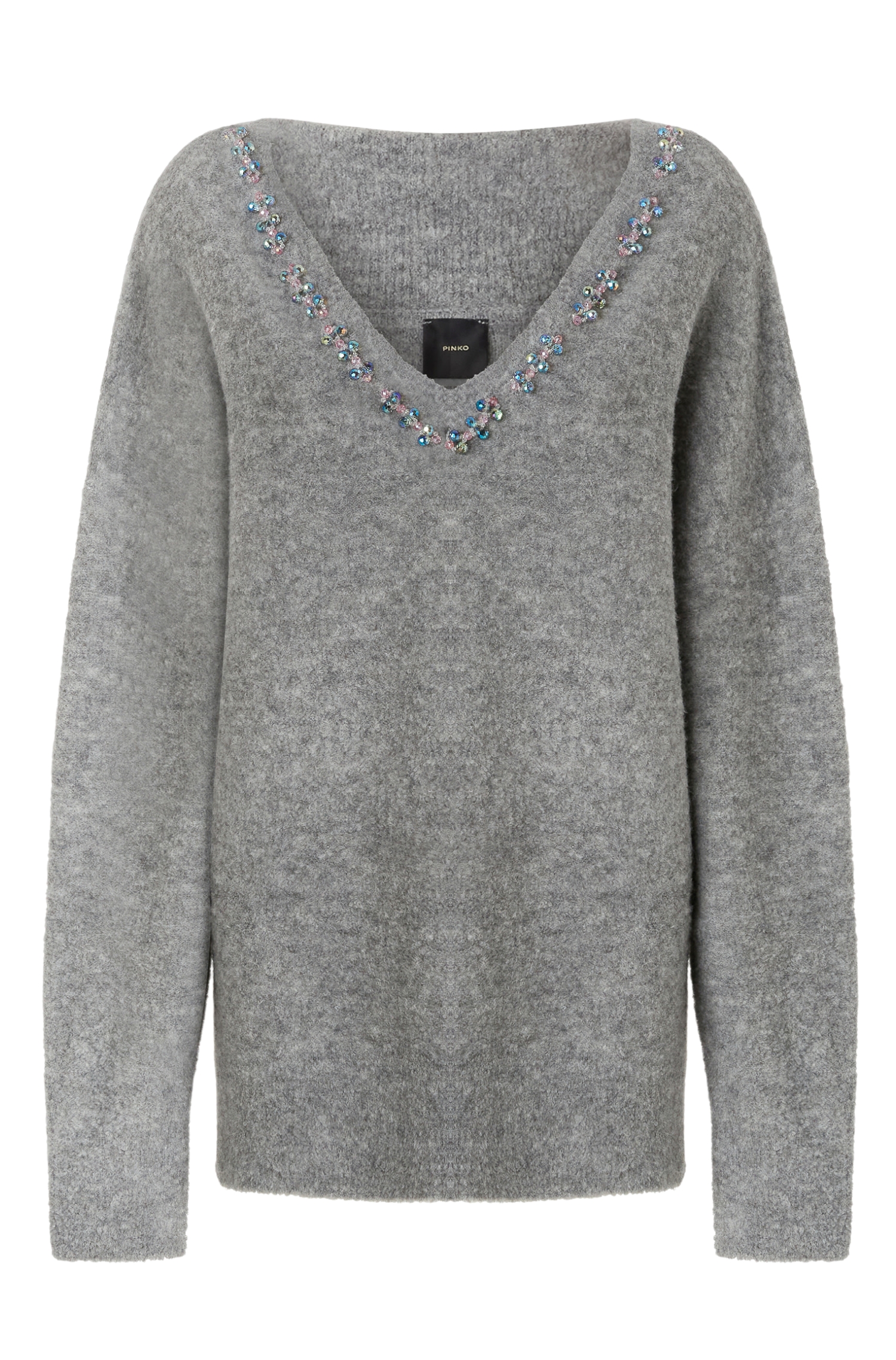 Comfortable long-sleeved V-neck sweater made of soft bouclé-effect wool-blend knit. The tone-on-tone PINKO lettering logo stands out on the back, while the wide neckline is outlined with colorful jeweled beads to brighten the look and embellish the fabric. The garment has undergone finishing tests to minimize possible pilling, ensuring greater softness and durability of the fabric.